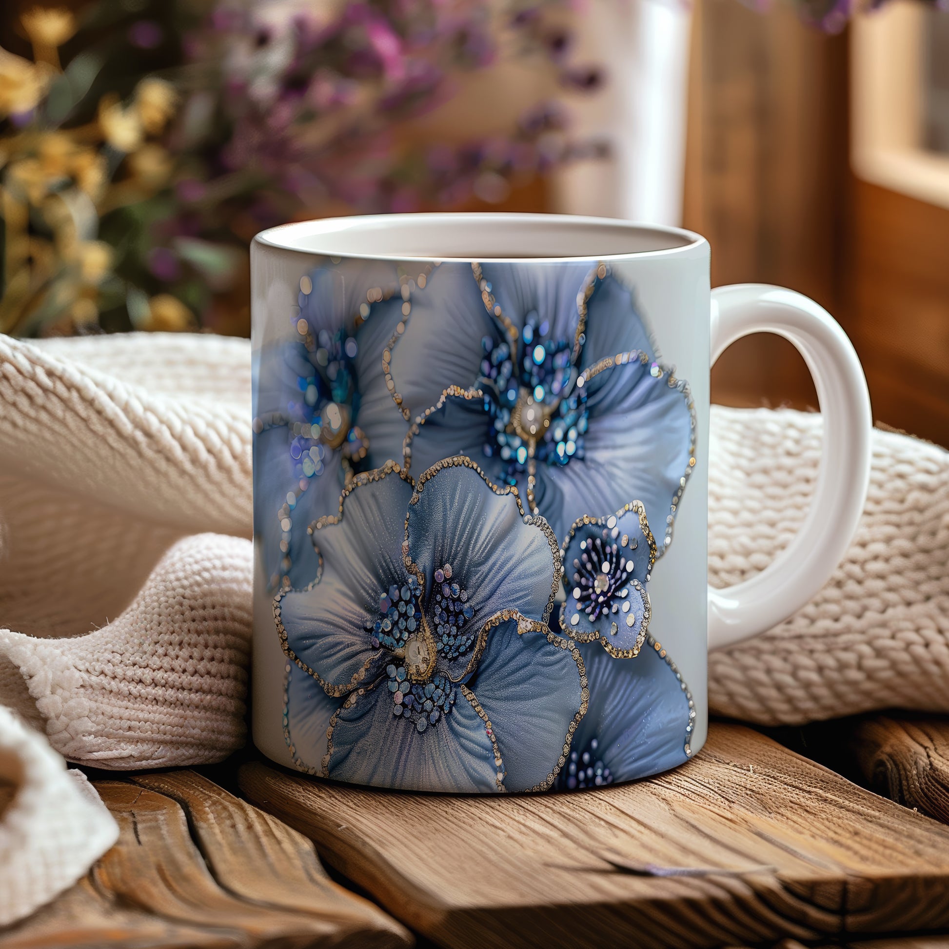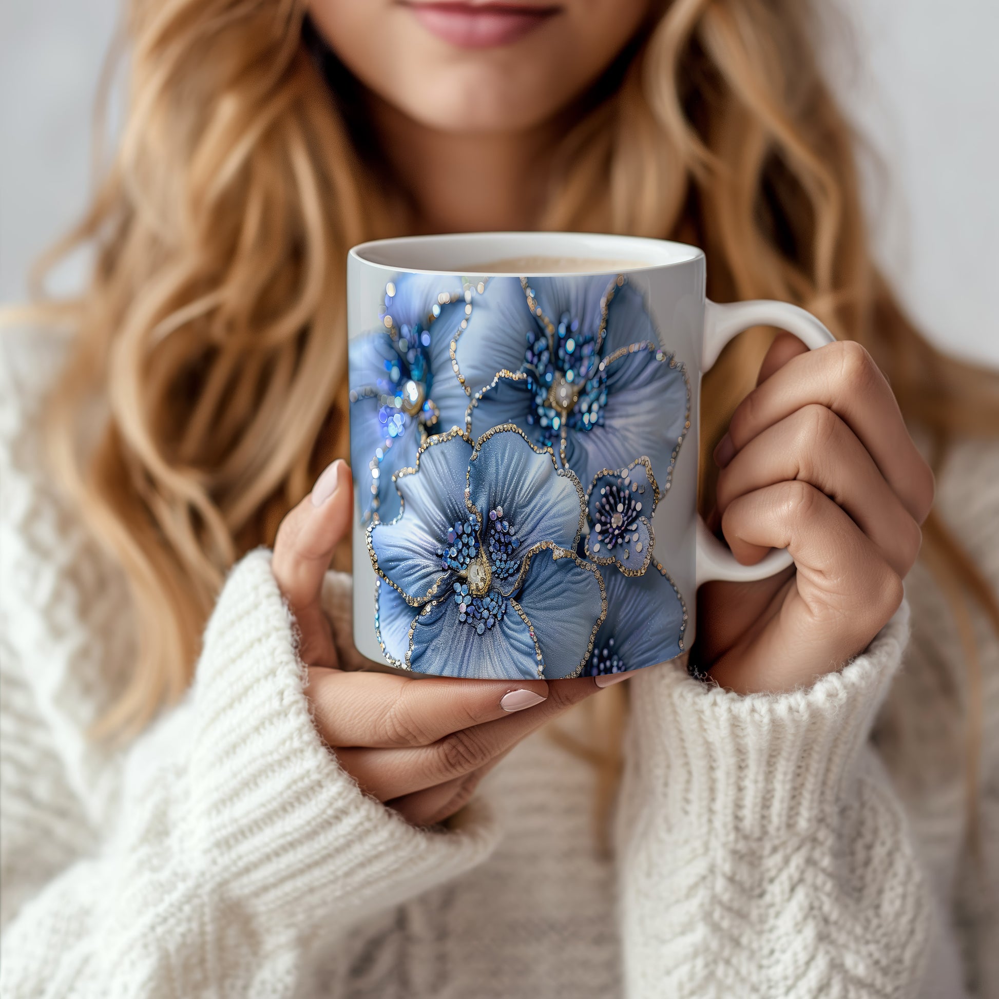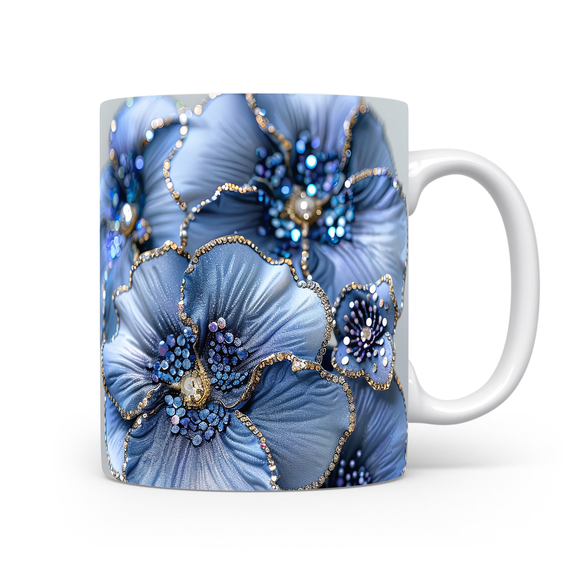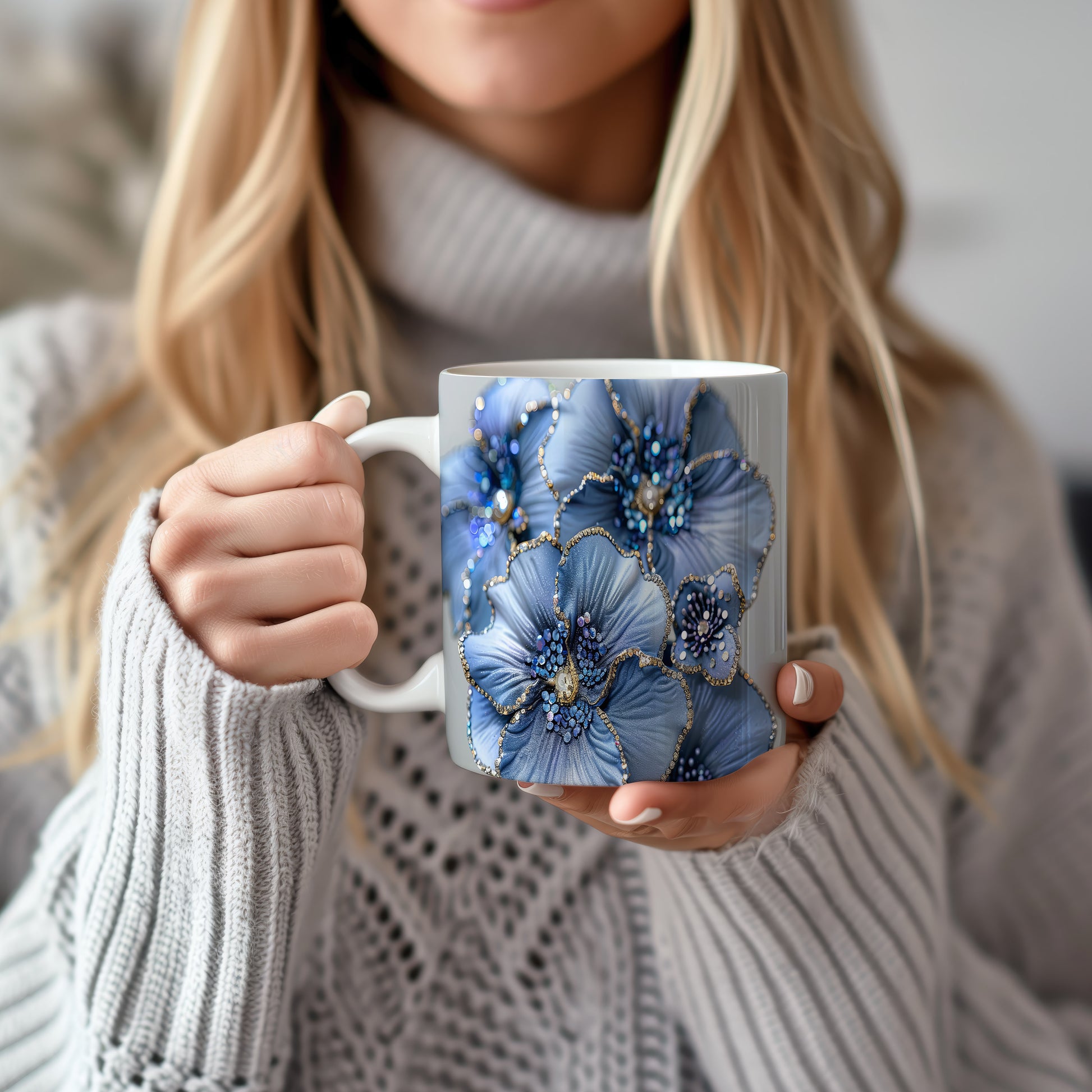 Elegantní keramický hrnek s motivem modrých květin a třpytivými detaily. Tento hrnek je ideální pro milovníky květin a skvělým dárkem pro každou příležitost. Materiál: keramika. Objem: 330 ml. Vhodné do myčky i mikrovlnky. Díky svému designu přináší do každodenního pití radost a styl.