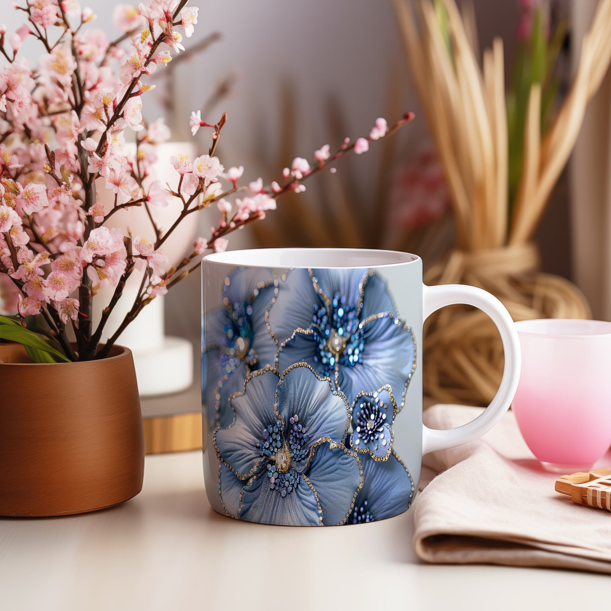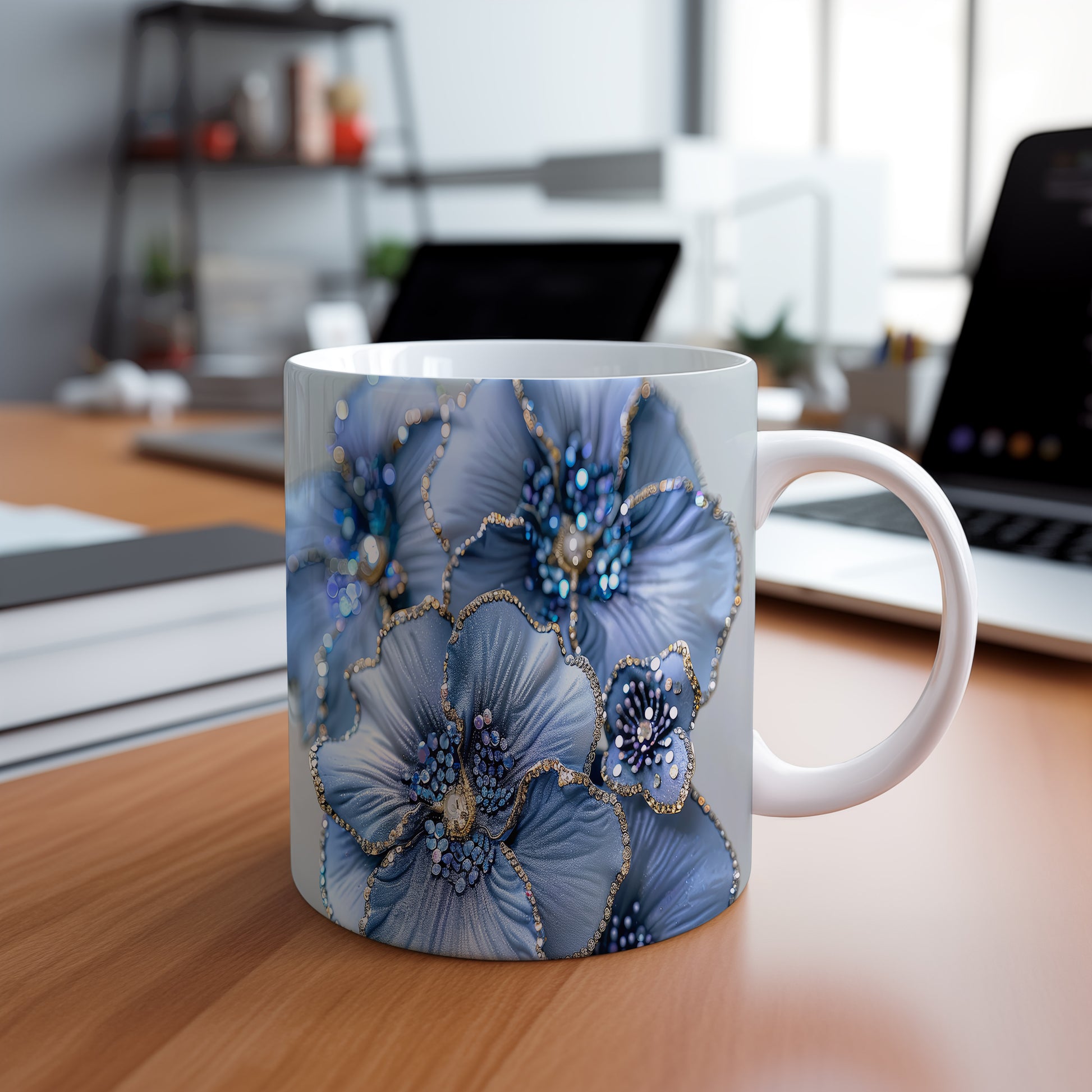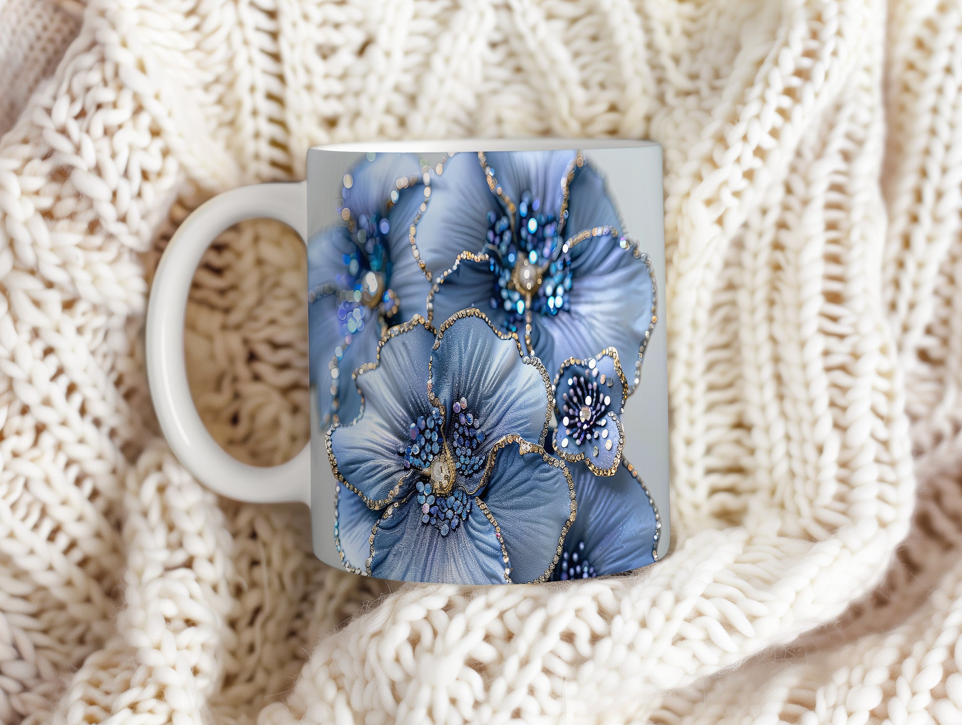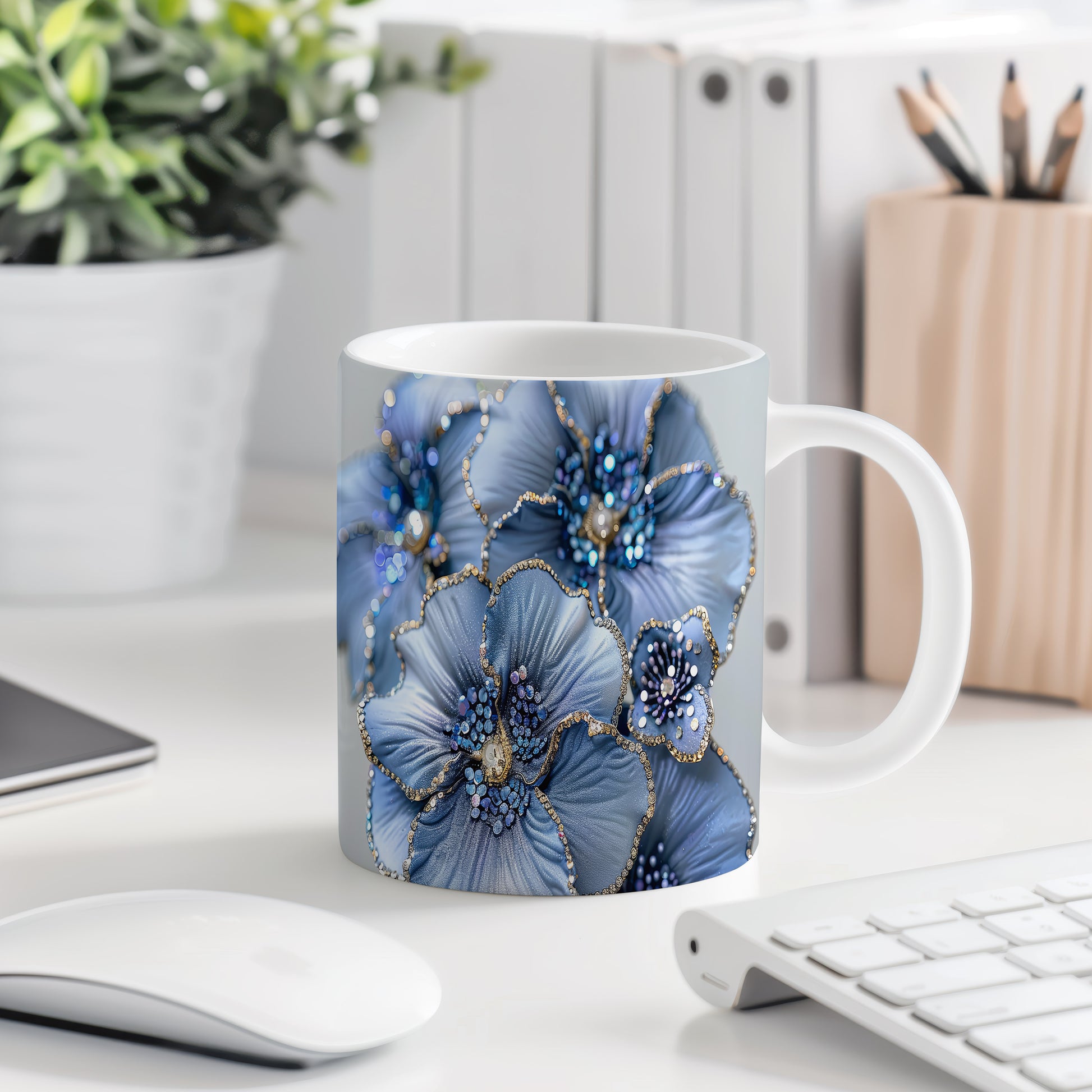 Elegantní keramický hrnek s motivem modrých květin a třpytivými detaily. Tento hrnek je ideální pro milovníky květin a skvělým dárkem pro každou příležitost. Materiál: keramika. Objem: 330 ml. Vhodné do myčky i mikrovlnky. Díky svému designu přináší do každodenního pití radost a styl.