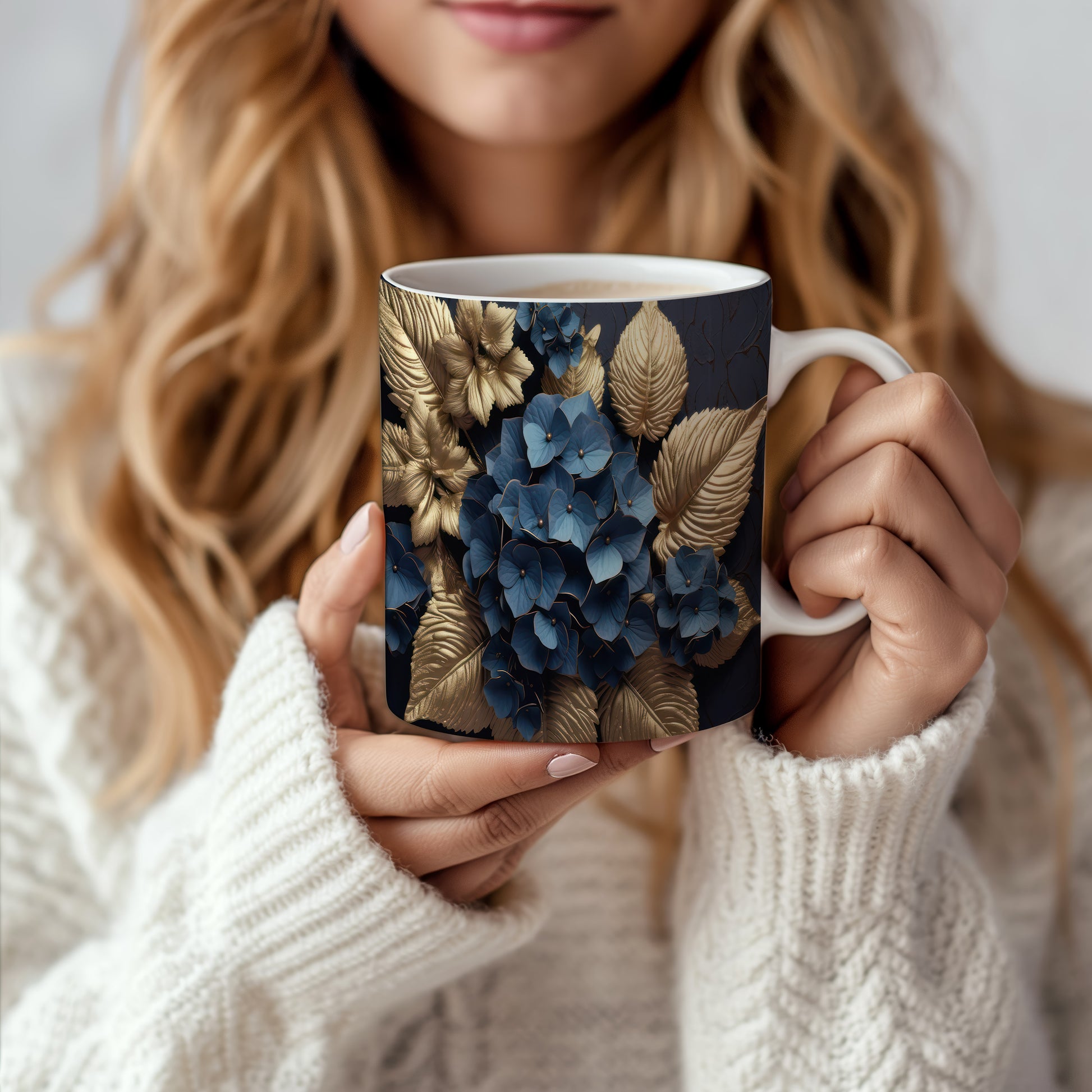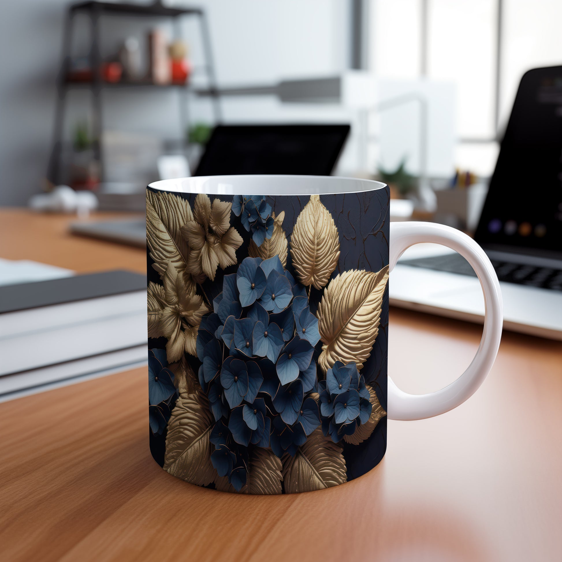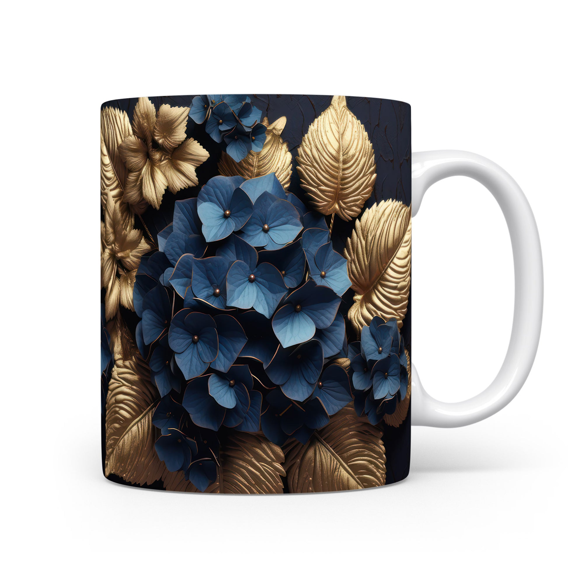 Tento elegantní hrnek je zdoben modrými květinami a zlatými listy, což mu dodává jedinečný styl. Je ideální pro milovníky kávy a čaje, skvělý tip na dárek pro přátele nebo rodinu. Materiál: keramika. Objem: 330 ml. Vhodné do myčky i mikrovlnky. Díky svému designu přináší do každodenního pití radost a styl.