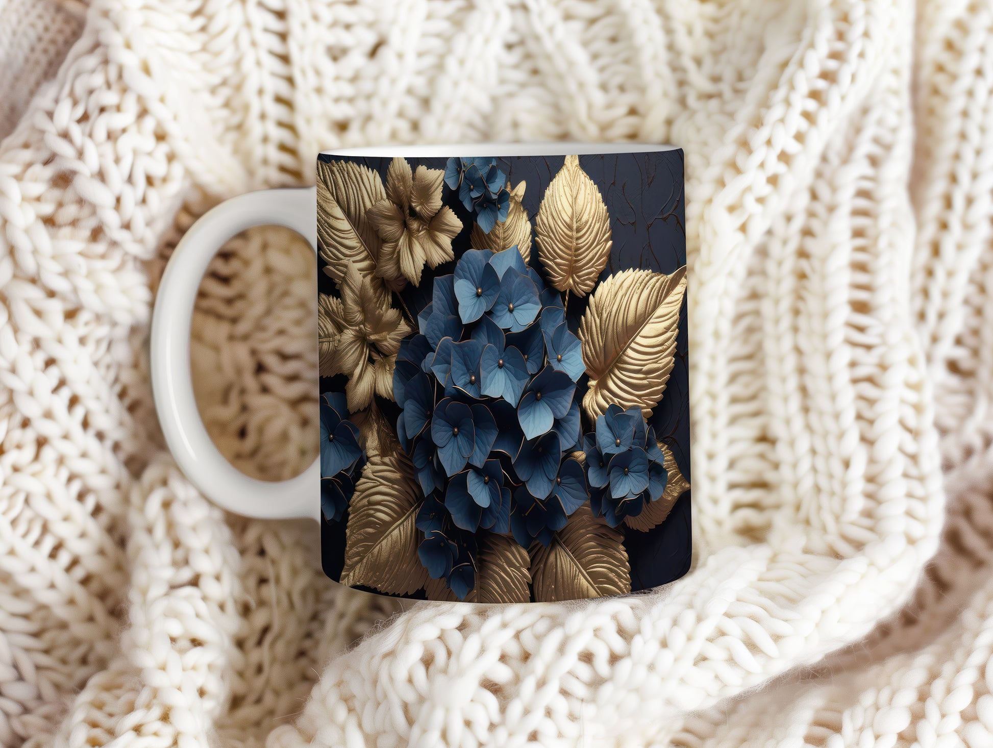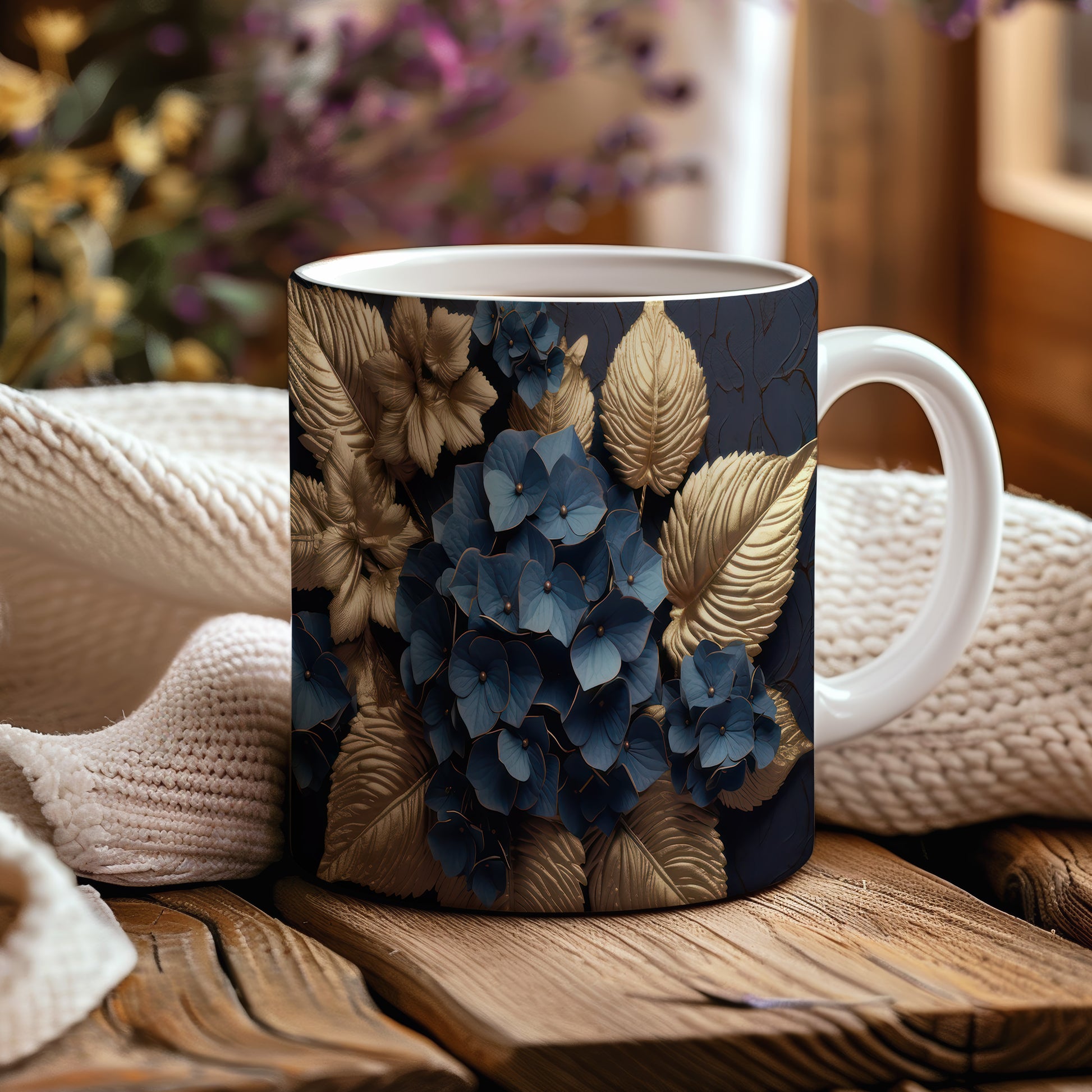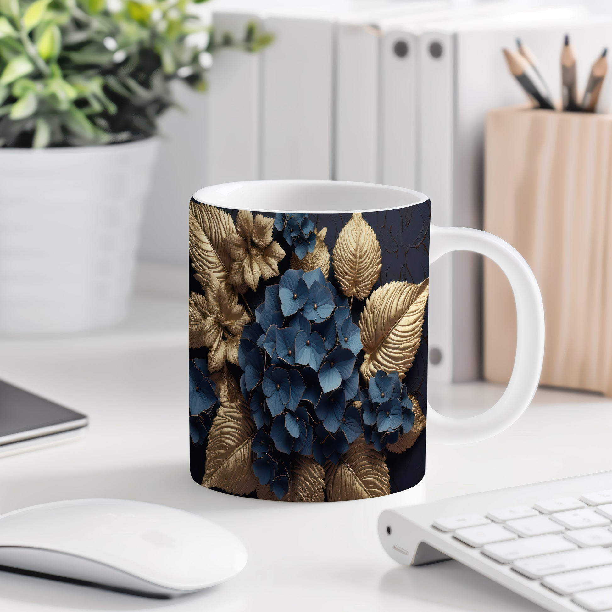 Tento elegantní hrnek je zdoben modrými květinami a zlatými listy, což mu dodává jedinečný styl. Je ideální pro milovníky kávy a čaje, skvělý tip na dárek pro přátele nebo rodinu. Materiál: keramika. Objem: 330 ml. Vhodné do myčky i mikrovlnky. Díky svému designu přináší do každodenního pití radost a styl.