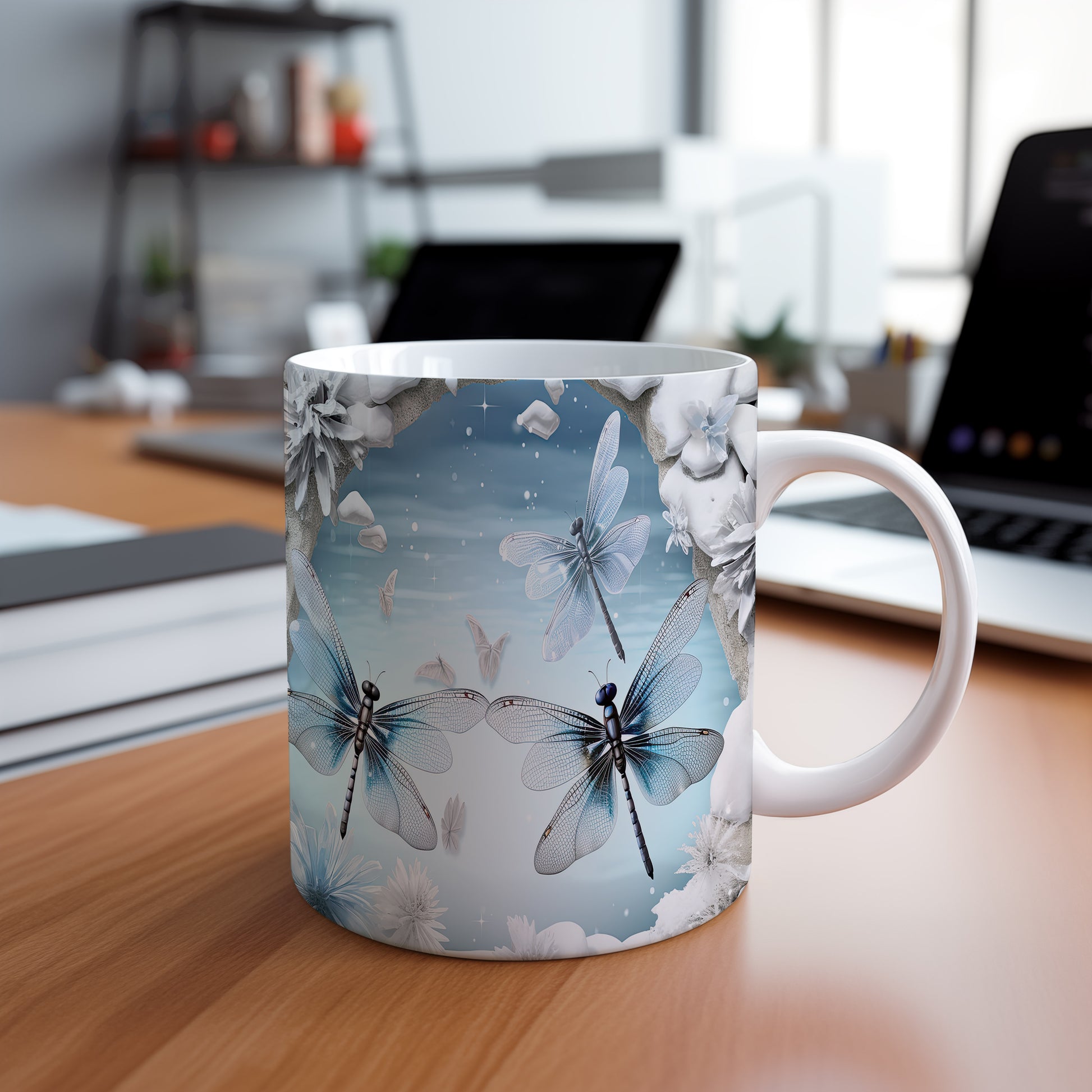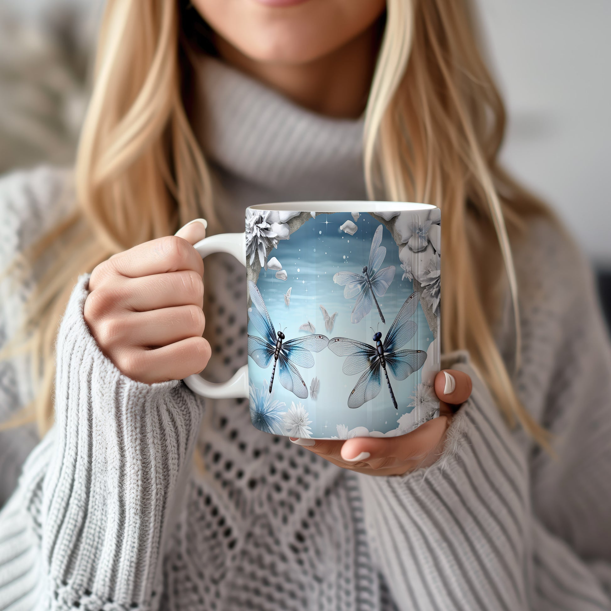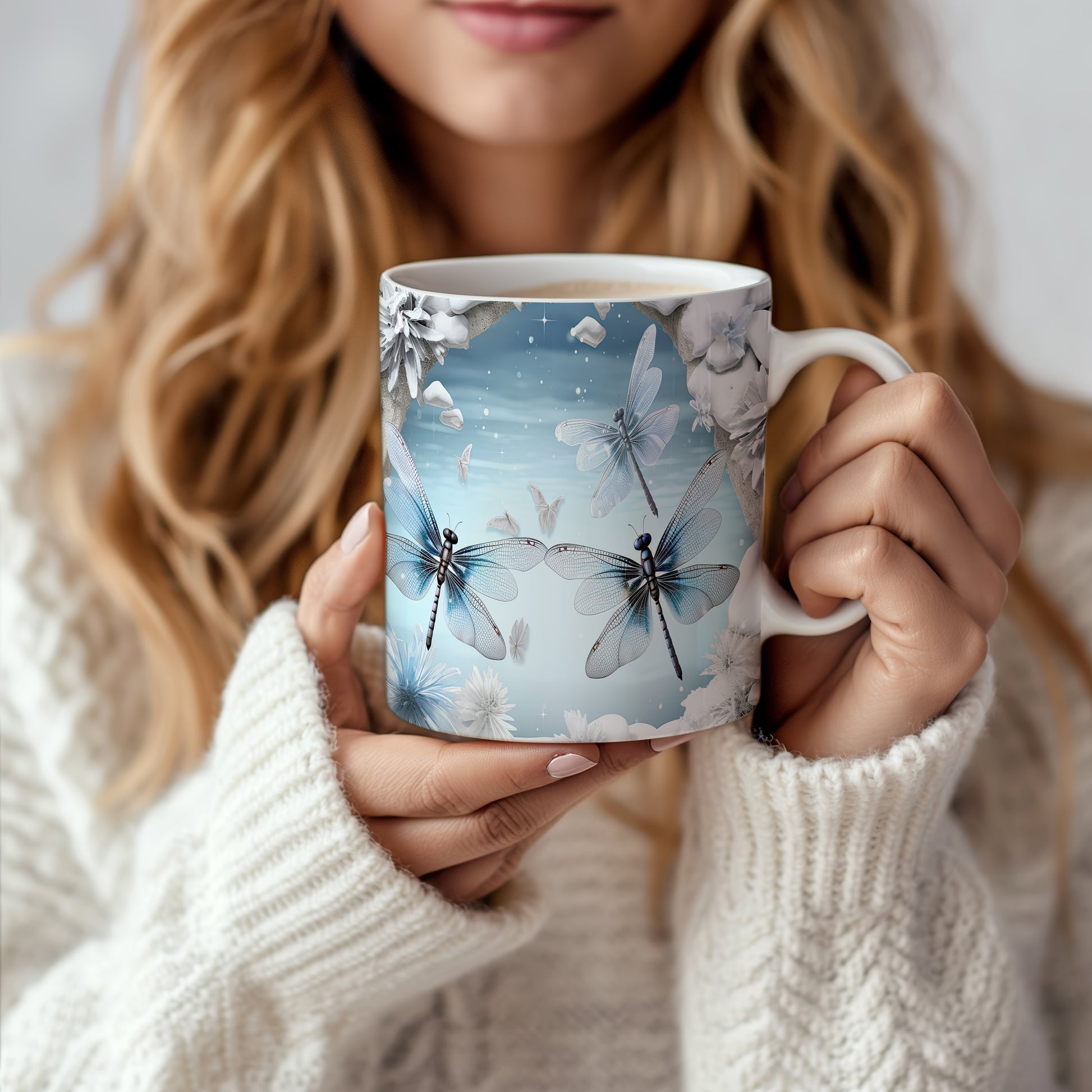 Tento hrnek s modrými vážkami a květinami v jemném designu je ideální pro milovníky přírody a elegantního stylu. Skvělý tip na dárek pro přátele nebo rodinu, kteří ocení krásu v každodenním životě. Materiál: keramika. Objem: 330 ml. Vhodné do myčky i mikrovlnky. Používání tohoto hrnku přináší radost a pohodu při každém doušku.