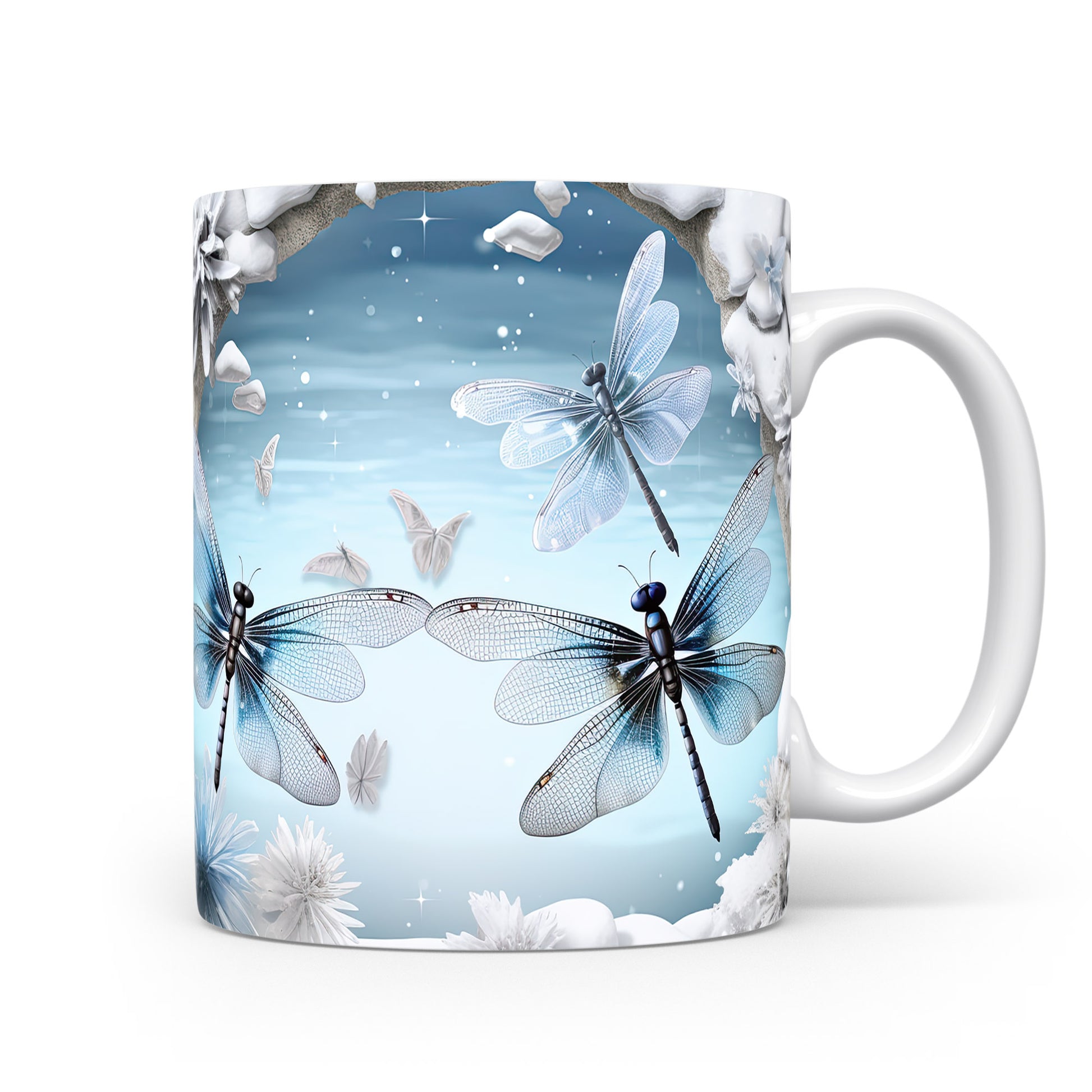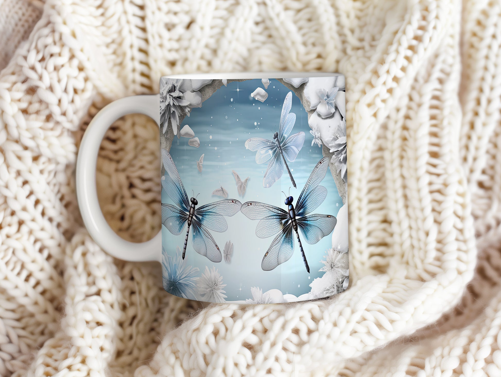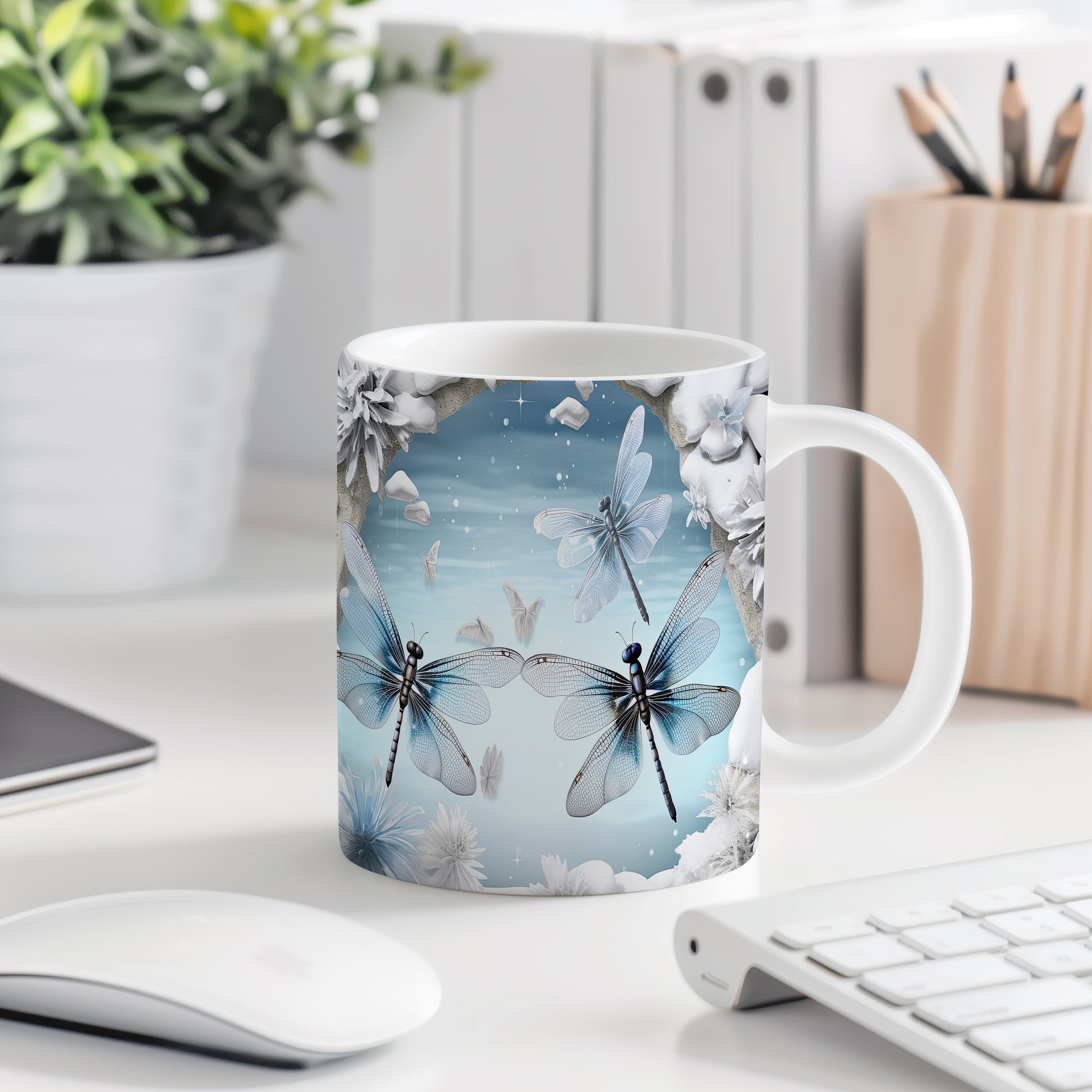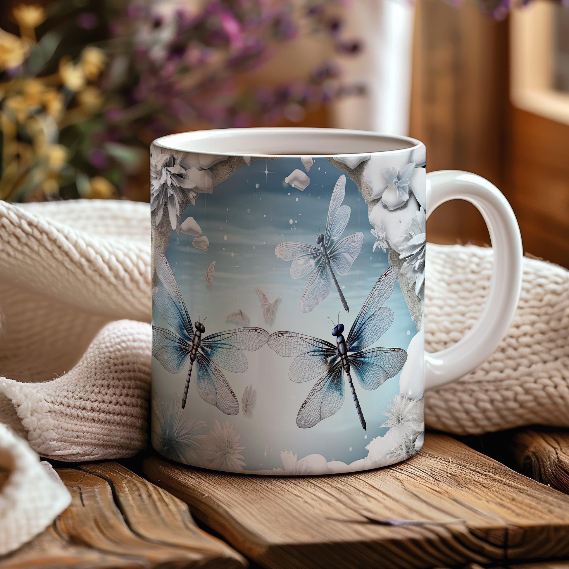 Tento hrnek s modrými vážkami a květinami v jemném designu je ideální pro milovníky přírody a elegantního stylu. Skvělý tip na dárek pro přátele nebo rodinu, kteří ocení krásu v každodenním životě. Materiál: keramika. Objem: 330 ml. Vhodné do myčky i mikrovlnky. Používání tohoto hrnku přináší radost a pohodu při každém doušku.