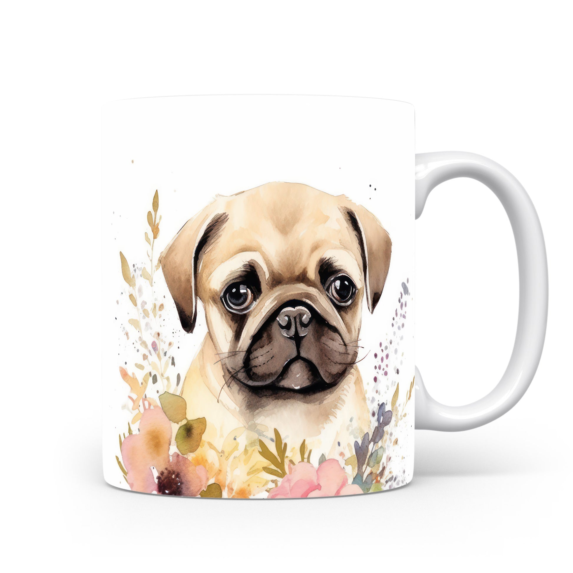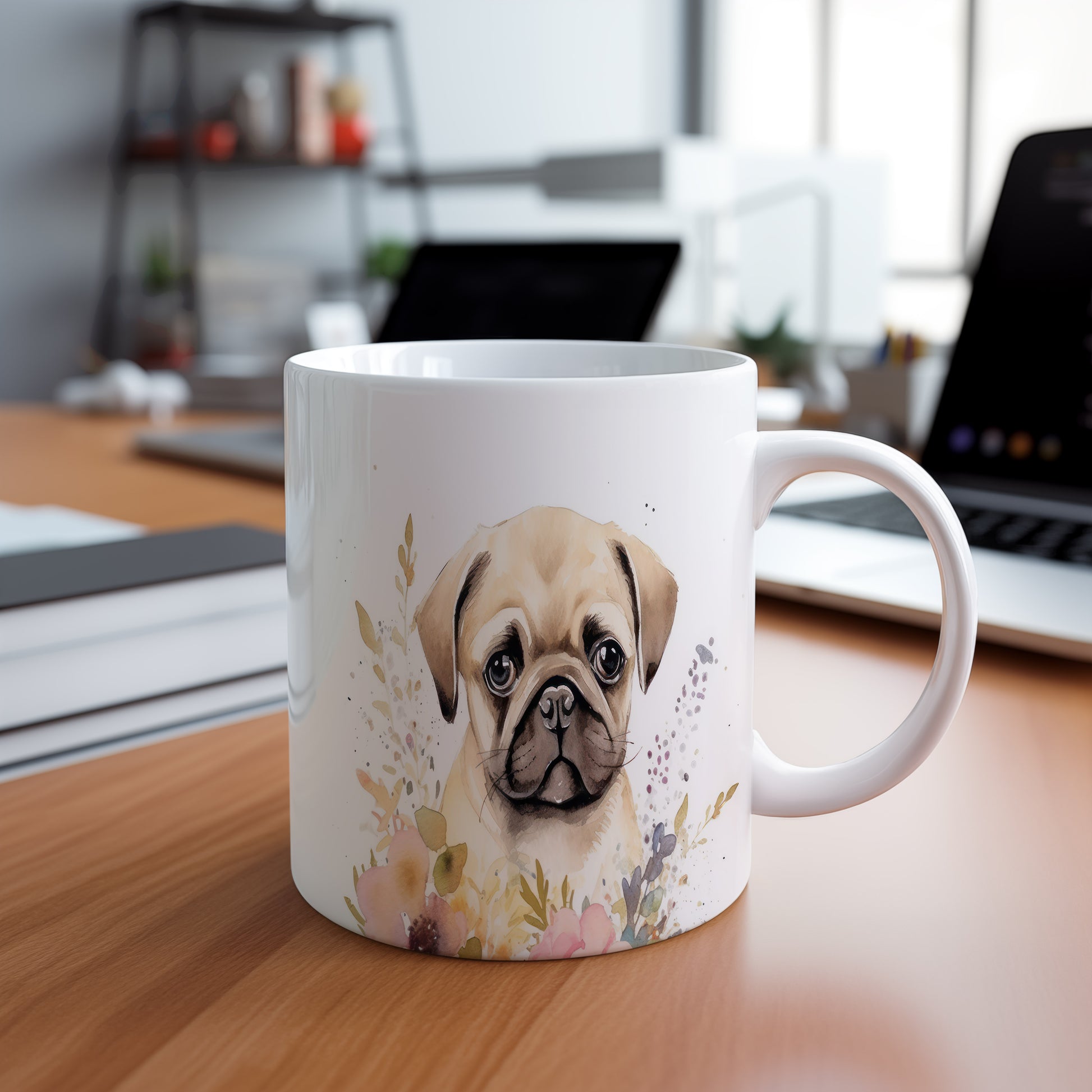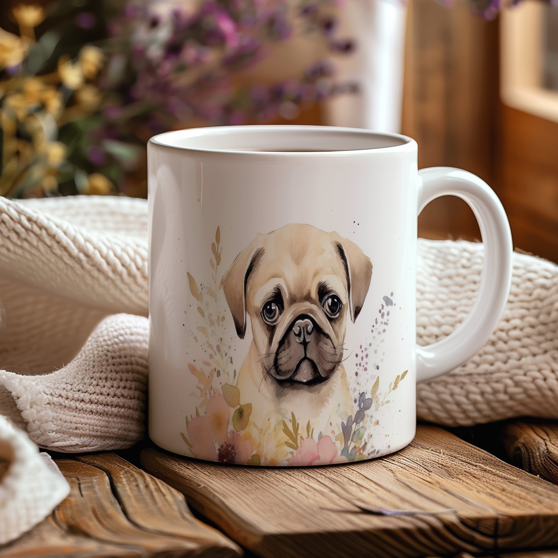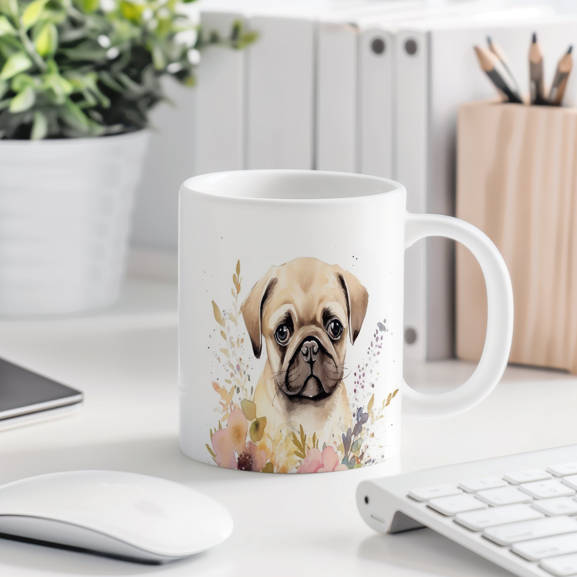 Tento hrnek zobrazuje roztomilého psa s velkýma očima a jemným úsměvem, obklopeného květinovým motivem. Je ideální pro milovníky psů a skvělým dárkem pro každého, kdo má rád zvířata. Materiál: keramika. Objem: 330 ml. Vhodné do myčky i mikrovlnky. Používání tohoto hrnku přináší radost a oživí každé pití.