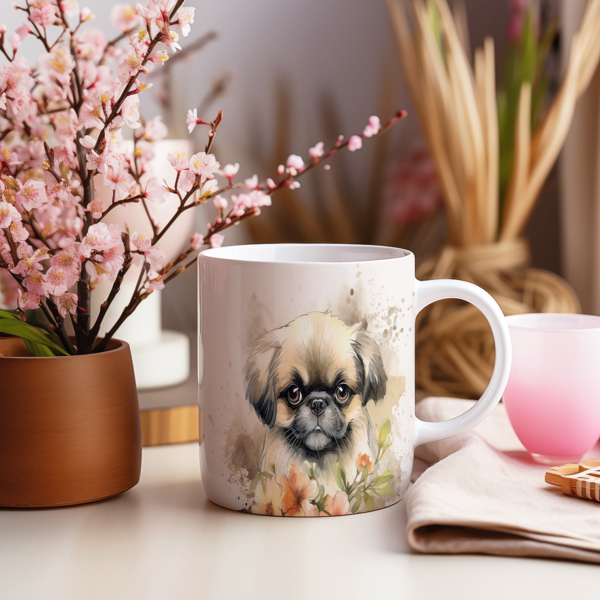Hrnek s mopsem a květinovým motivem