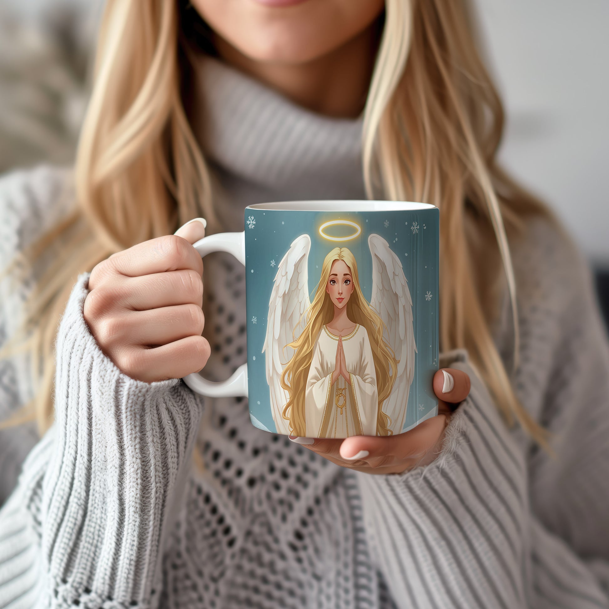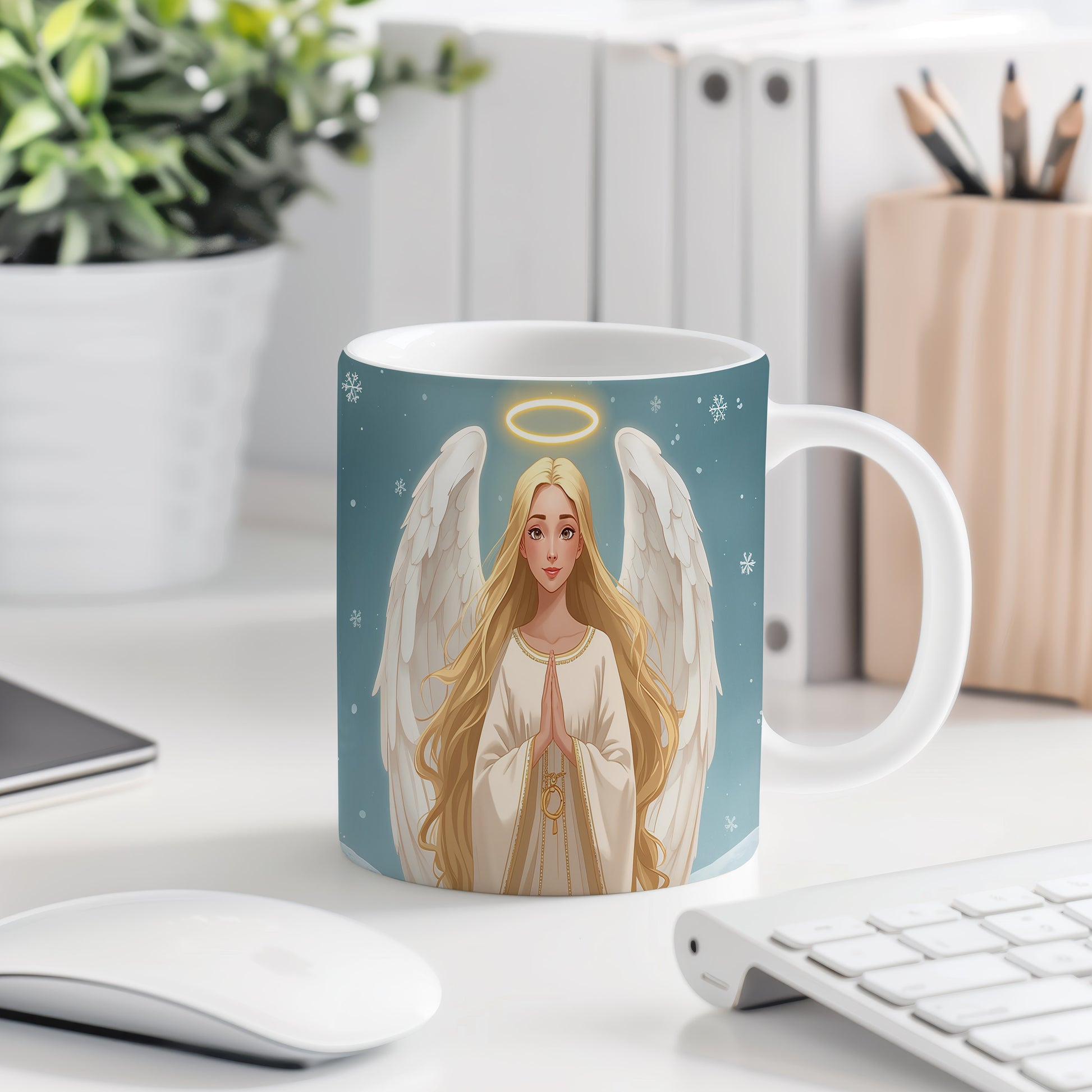 Elegantní anděl v bílém hávu září na modrém pozadí plném jemných vloček. Hrnek 330ml – vhodný do myčky i mikrovlnky.