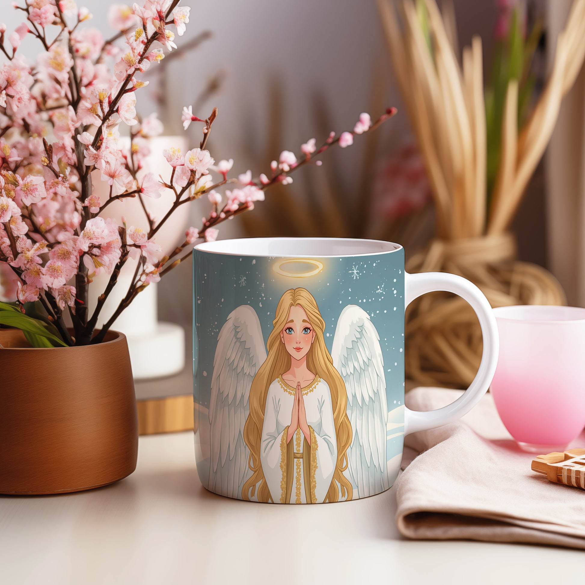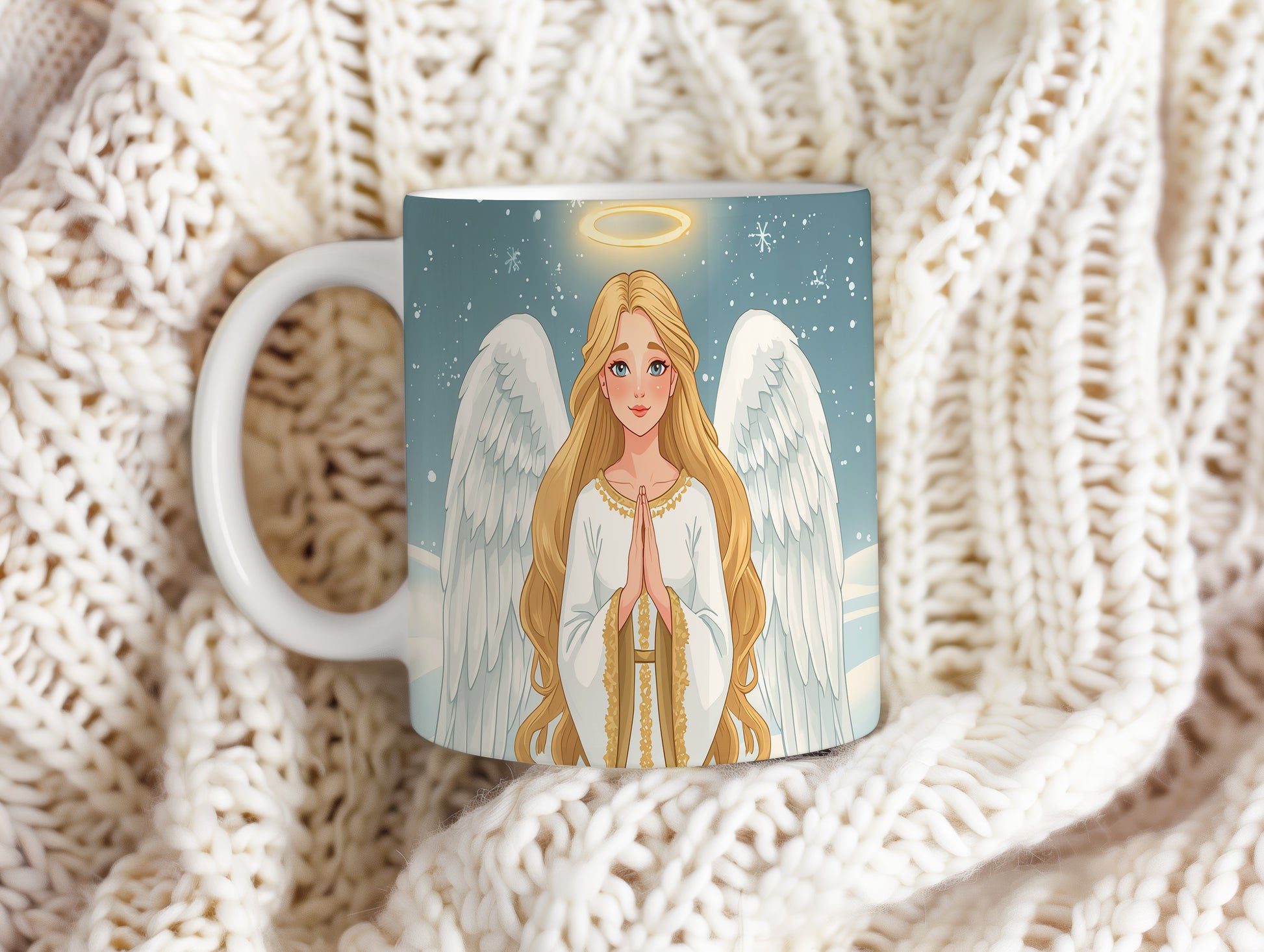 Anděl v bílém rouchu s jemně zlatými detaily září pod modrou oblohou plnou sněhových vloček. Hrnek 330ml – vhodný do myčky i mikrovlnky.
