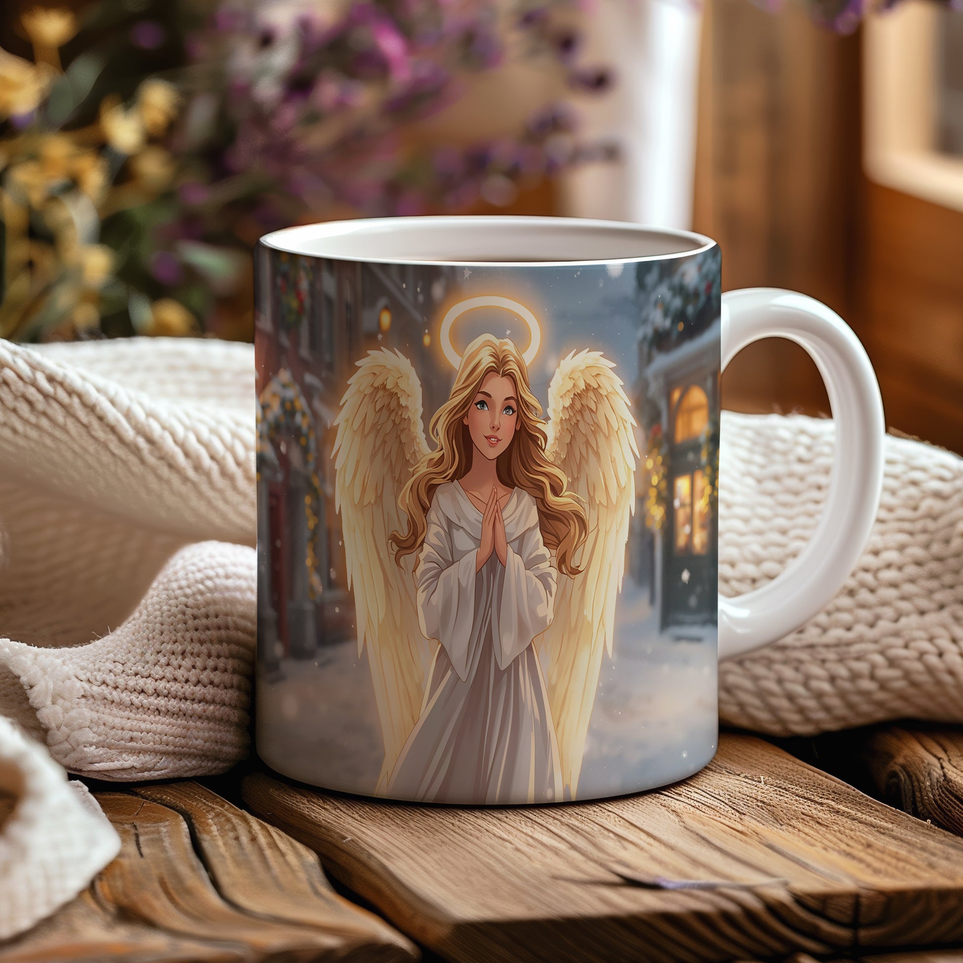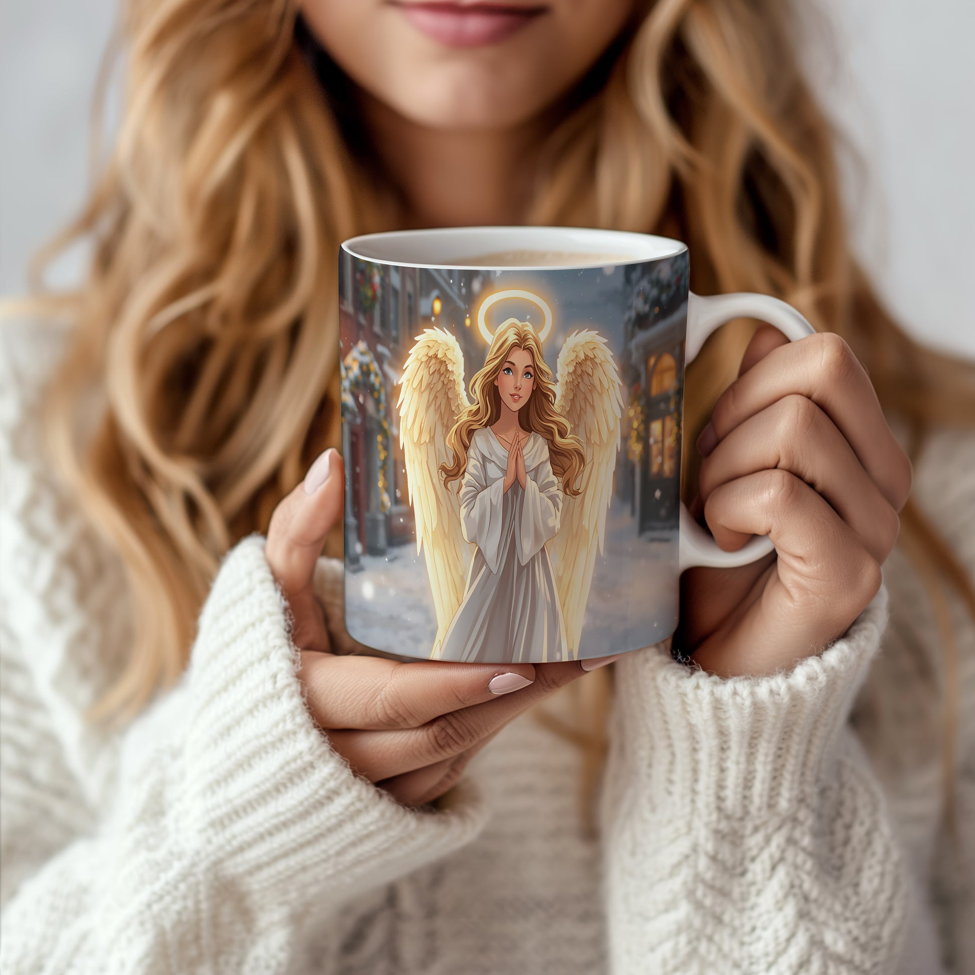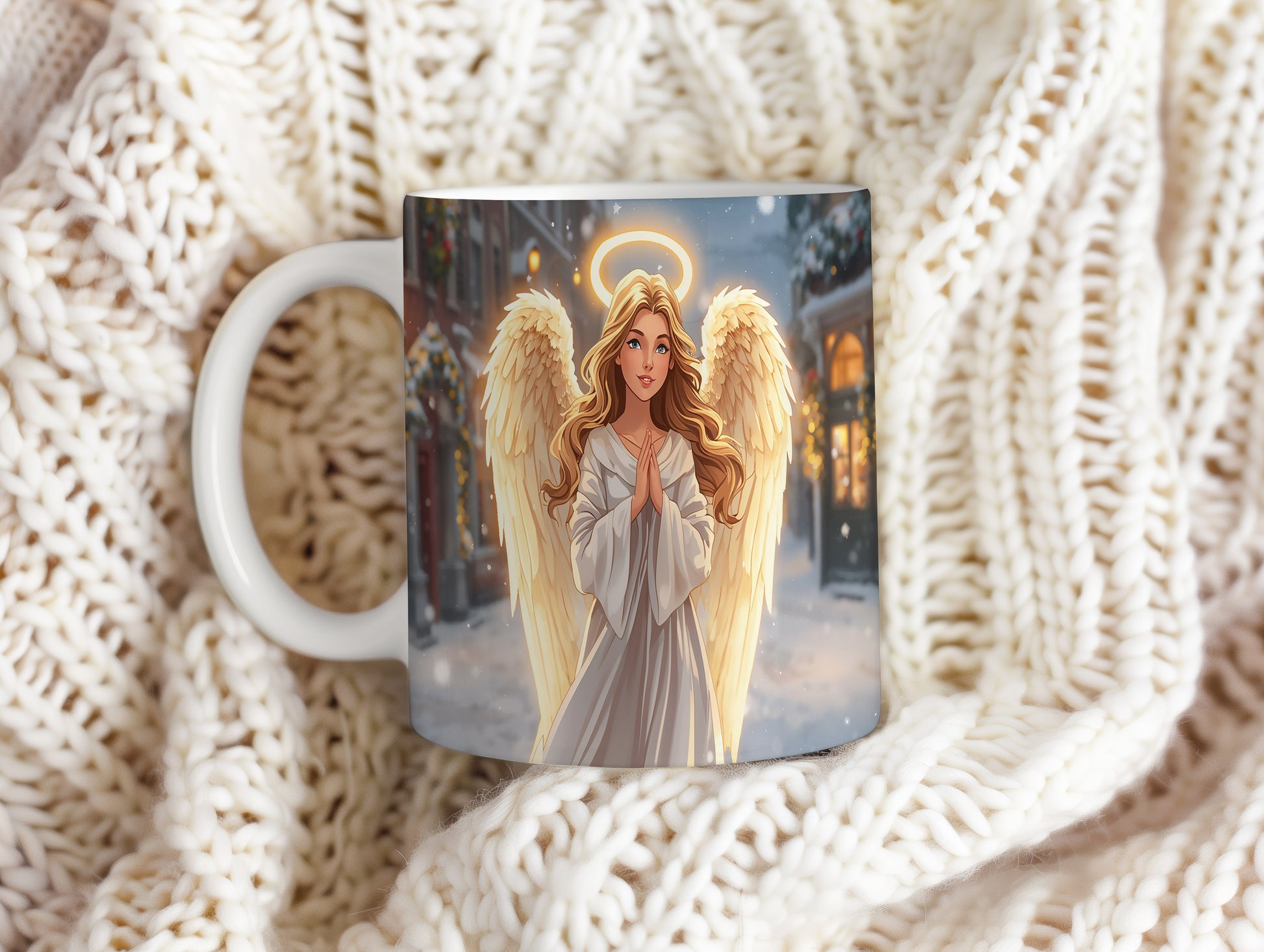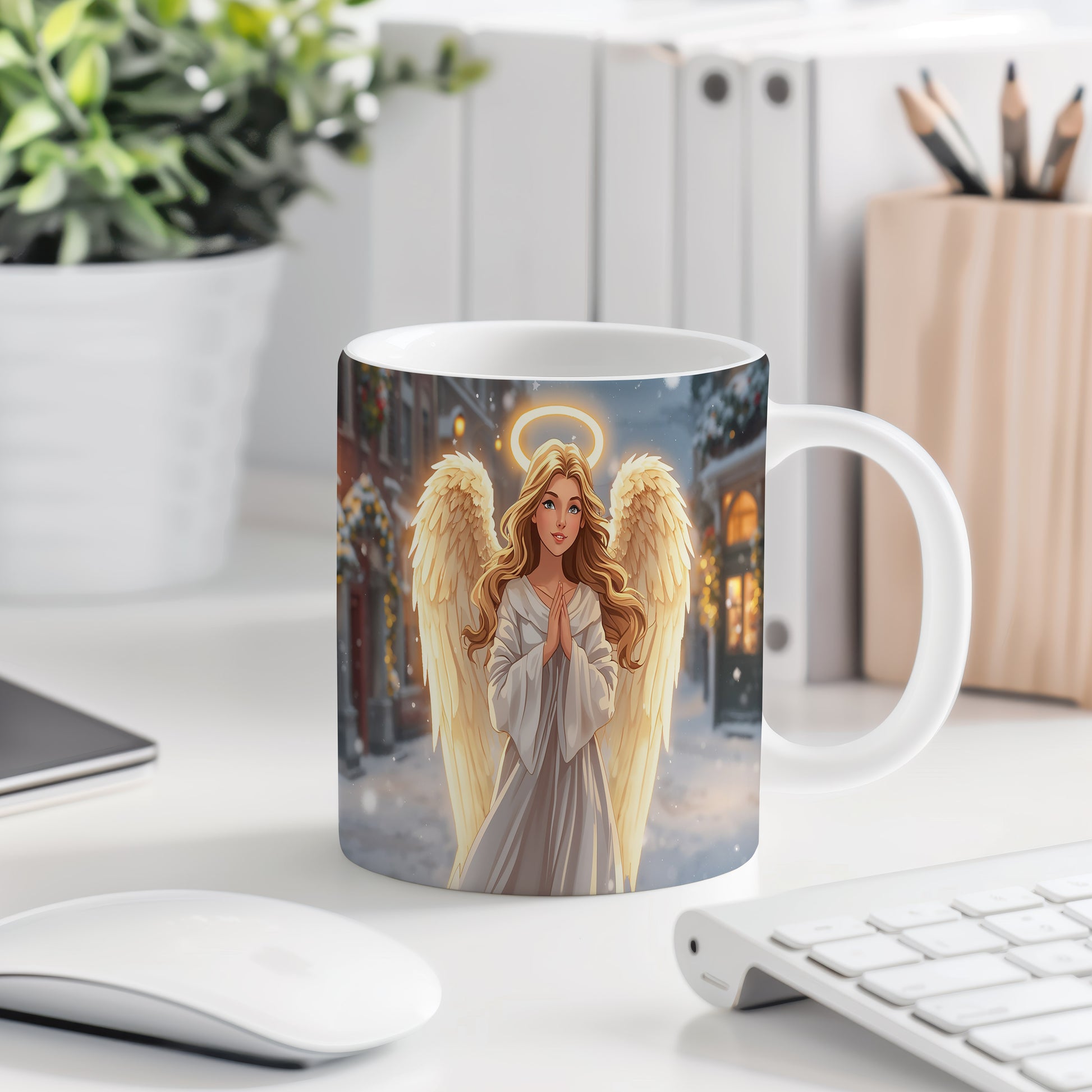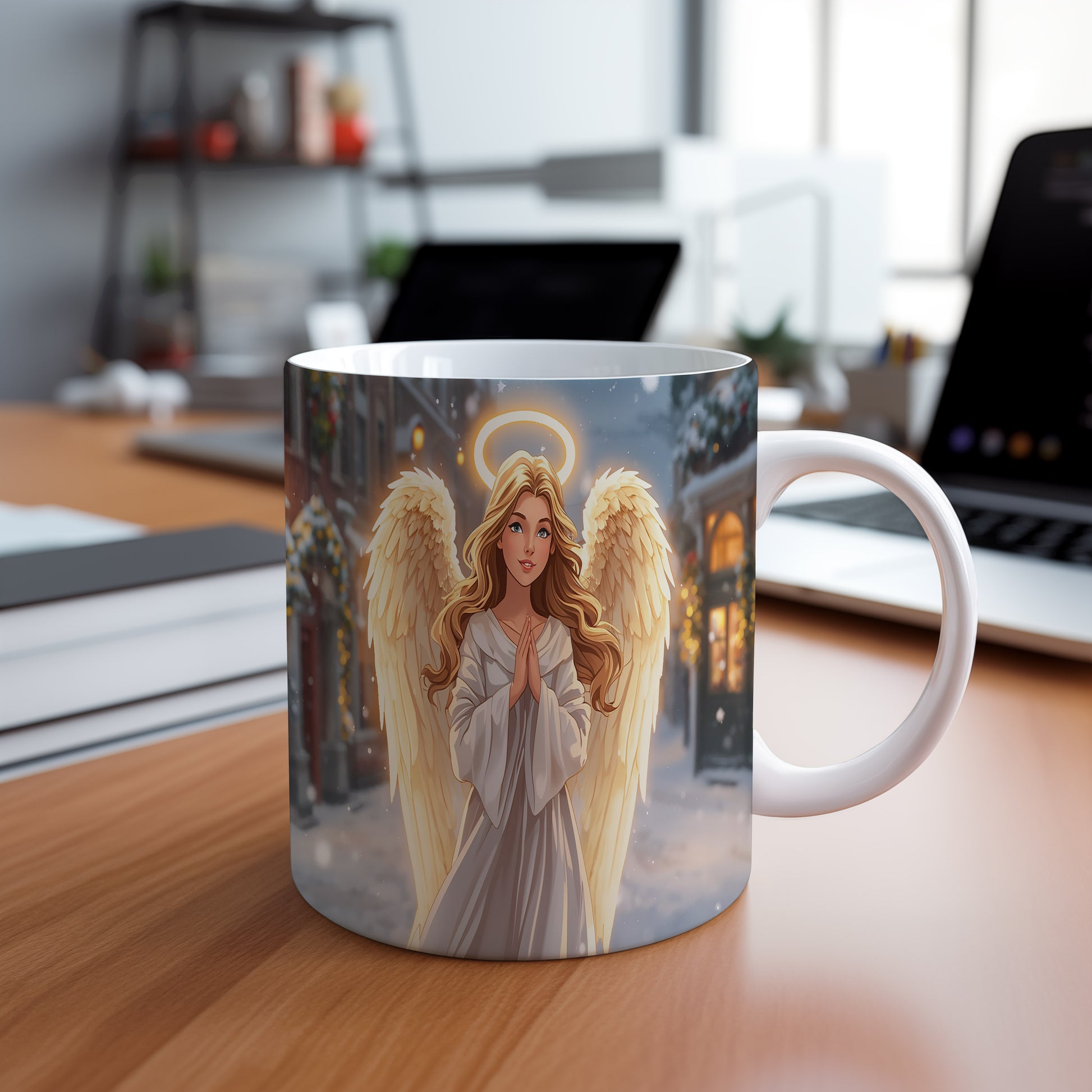 Elegantní anděl v bílém rouchu s jemným světlem haló září na pozadí zasněženého města. Hrnek 330ml – vhodný do myčky i mikrovlnky.