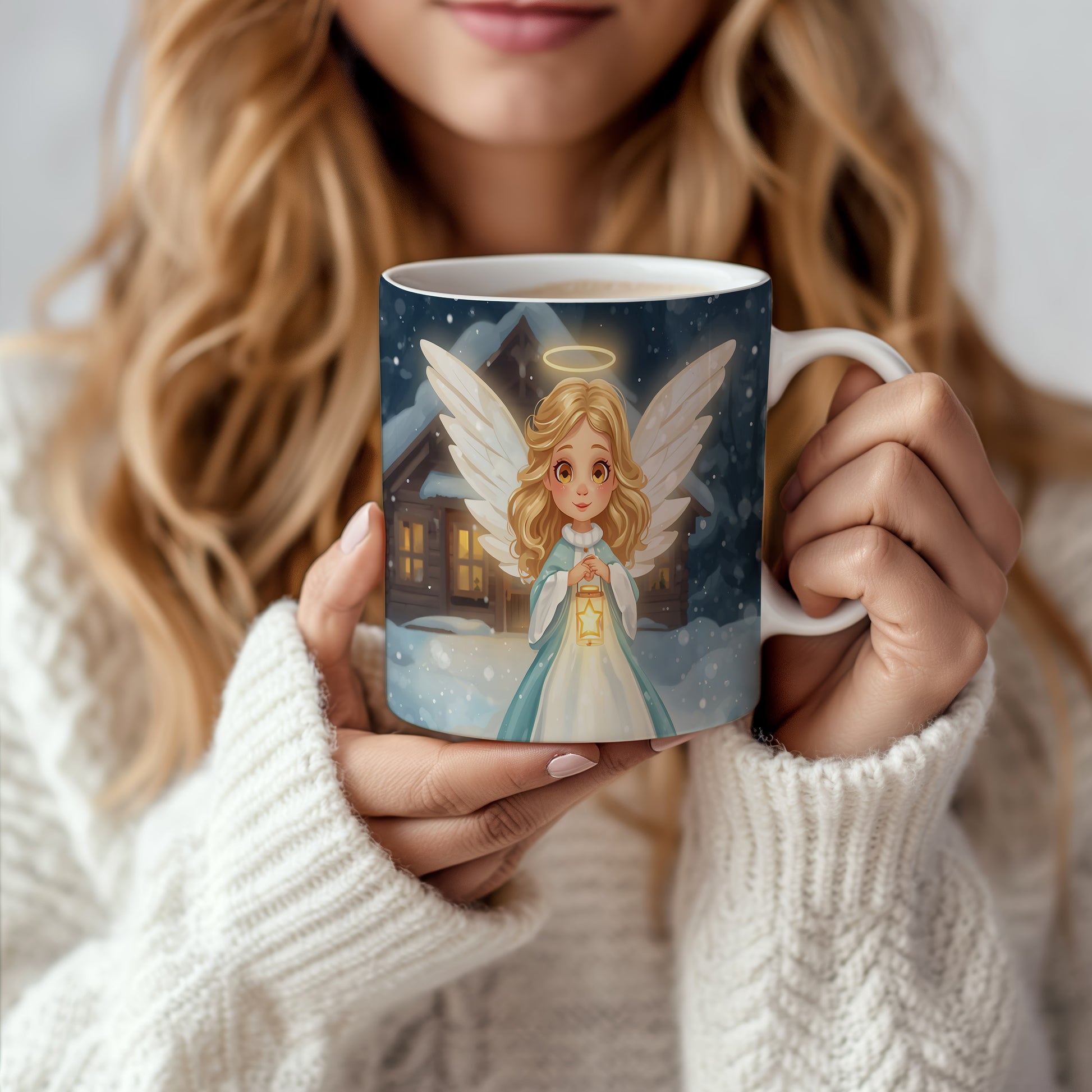 Hrnek s motivem anděla – zimní klidné stavení