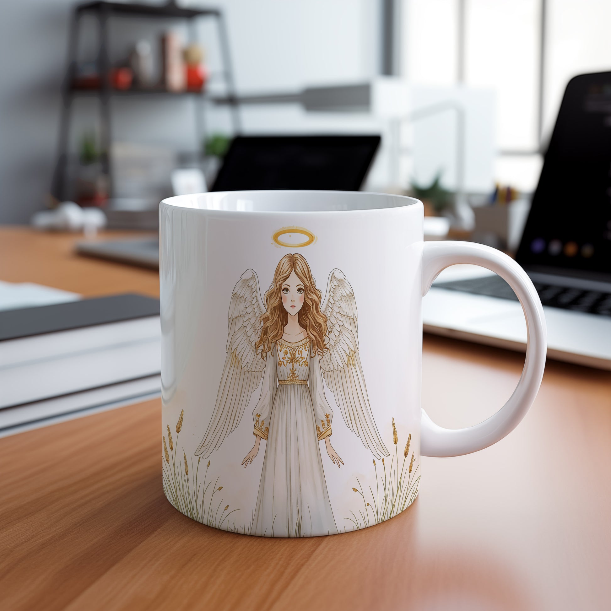 Elegantní anděl v bílém šatu s jemným zlatým zdobením přináší klid a mír. Tóny bílé a zlaté vytvářejí slavnostní atmosféru. Hrnek 330ml – vhodný do myčky i mikrovlnky.