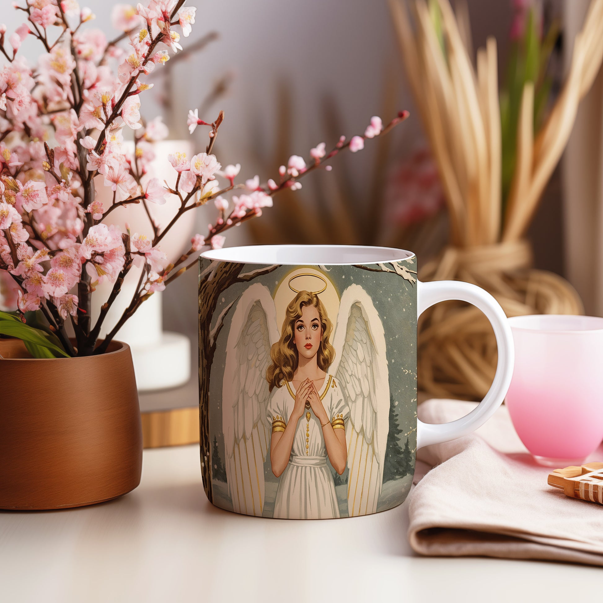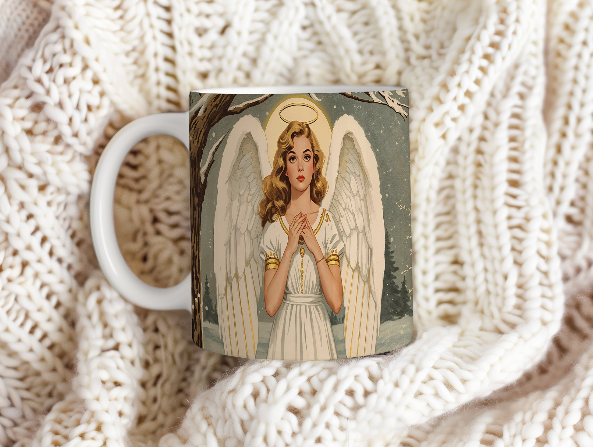Anděl v bílém rouchu s jemným zlatým zdobením září na pozadí zasněžené krajiny. Atmosféra klidu a míru doplněná jemnými zimními tóny. Hrnek 330ml – vhodný do myčky i mikrovlnky.