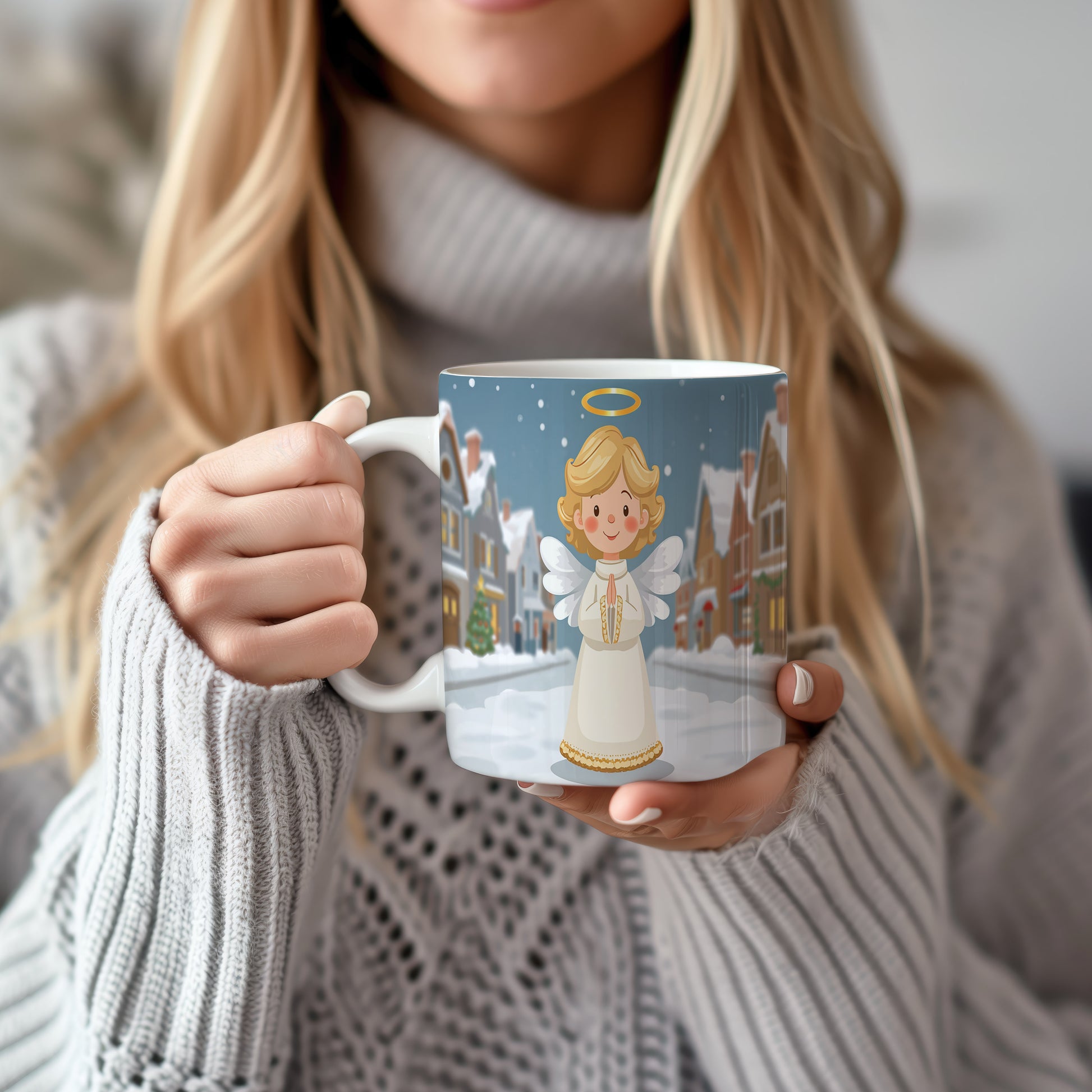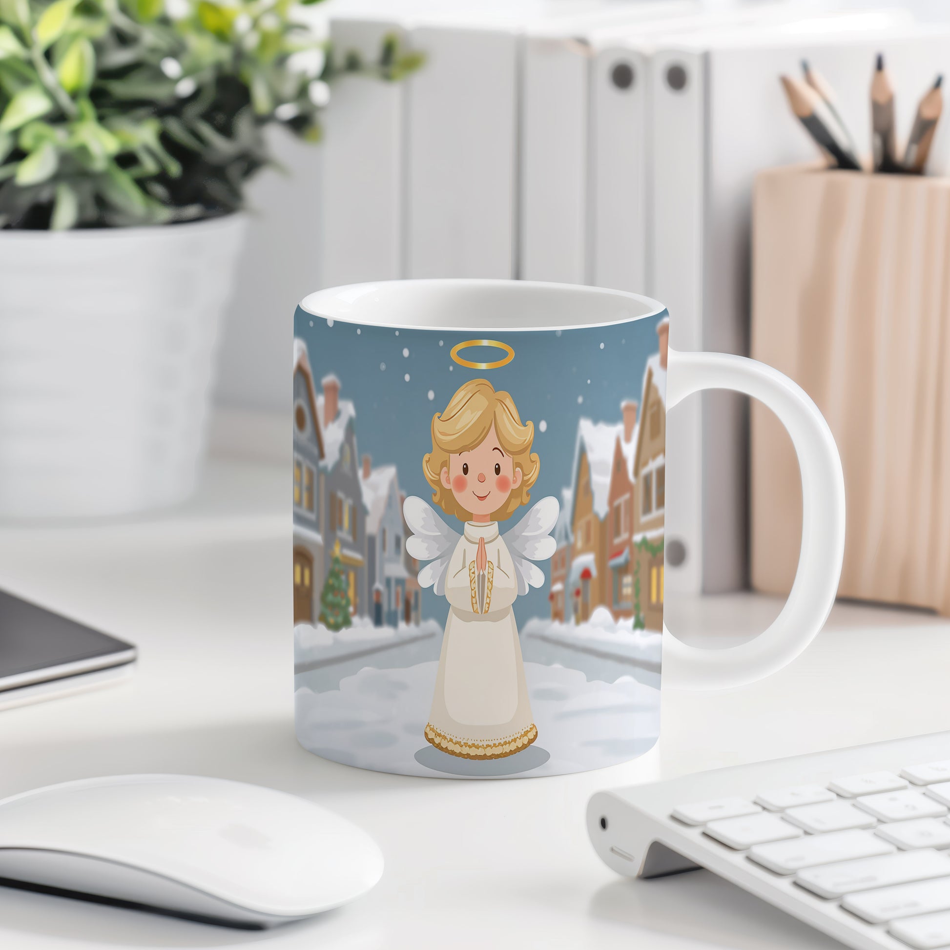 Anděl v bílém hávu září na pozadí zasněžené vesničky. Atmosféra klidu a míru doplněná jemnými barvami. Hrnek 330ml – vhodný do myčky i mikrovlnky.