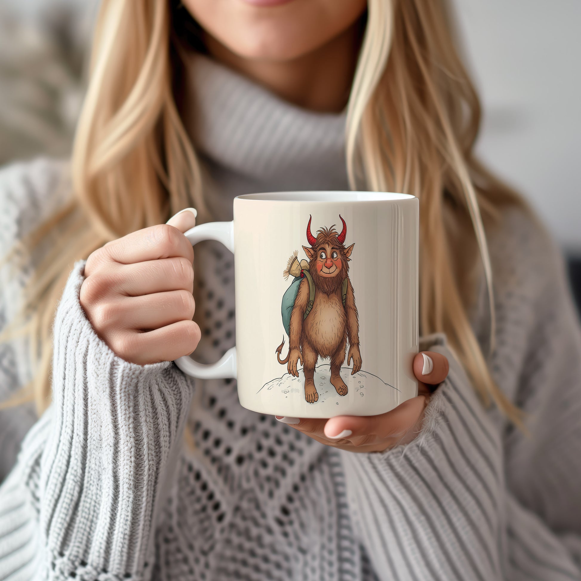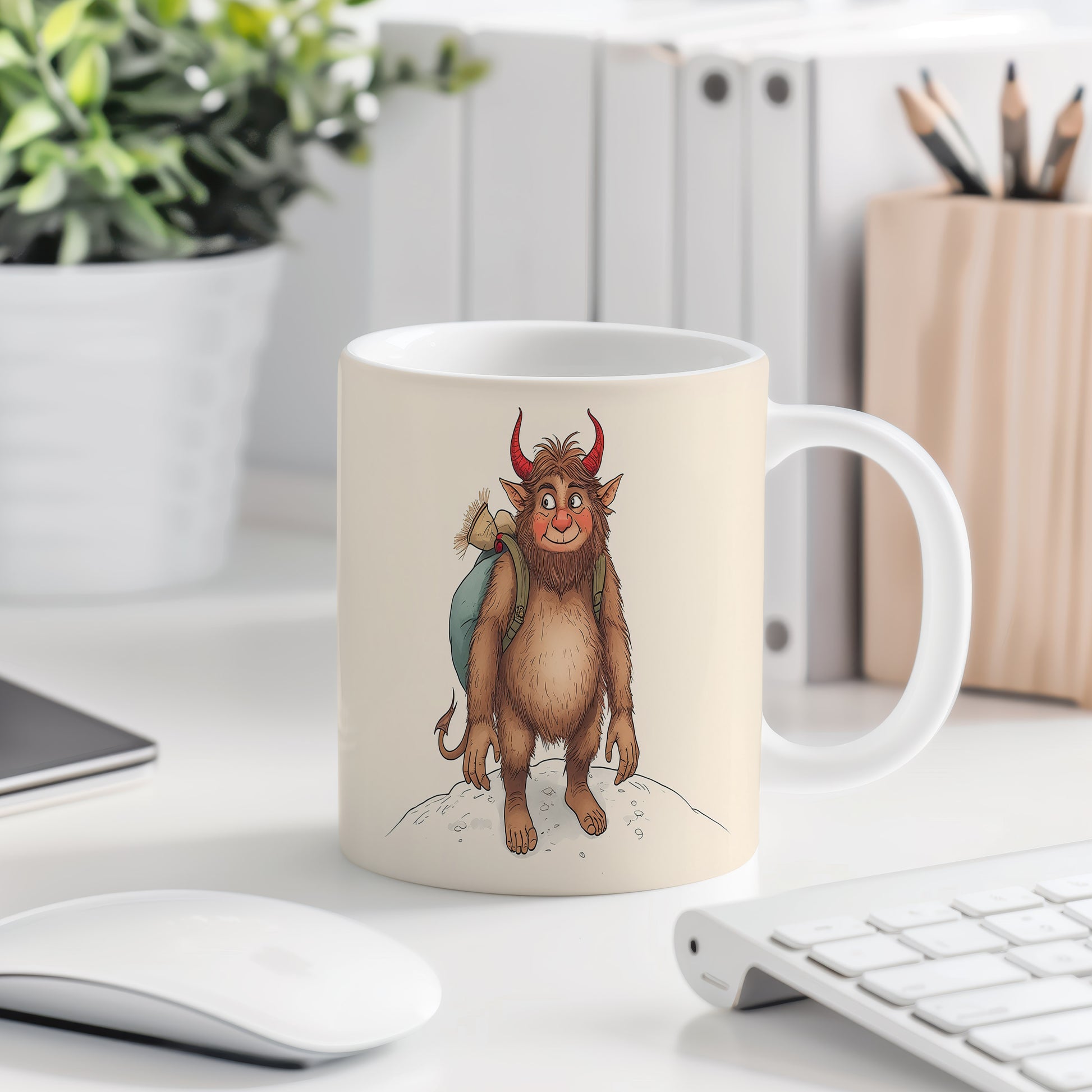 Hrnek s motivem čerta – veselý čertík na zimní procházce