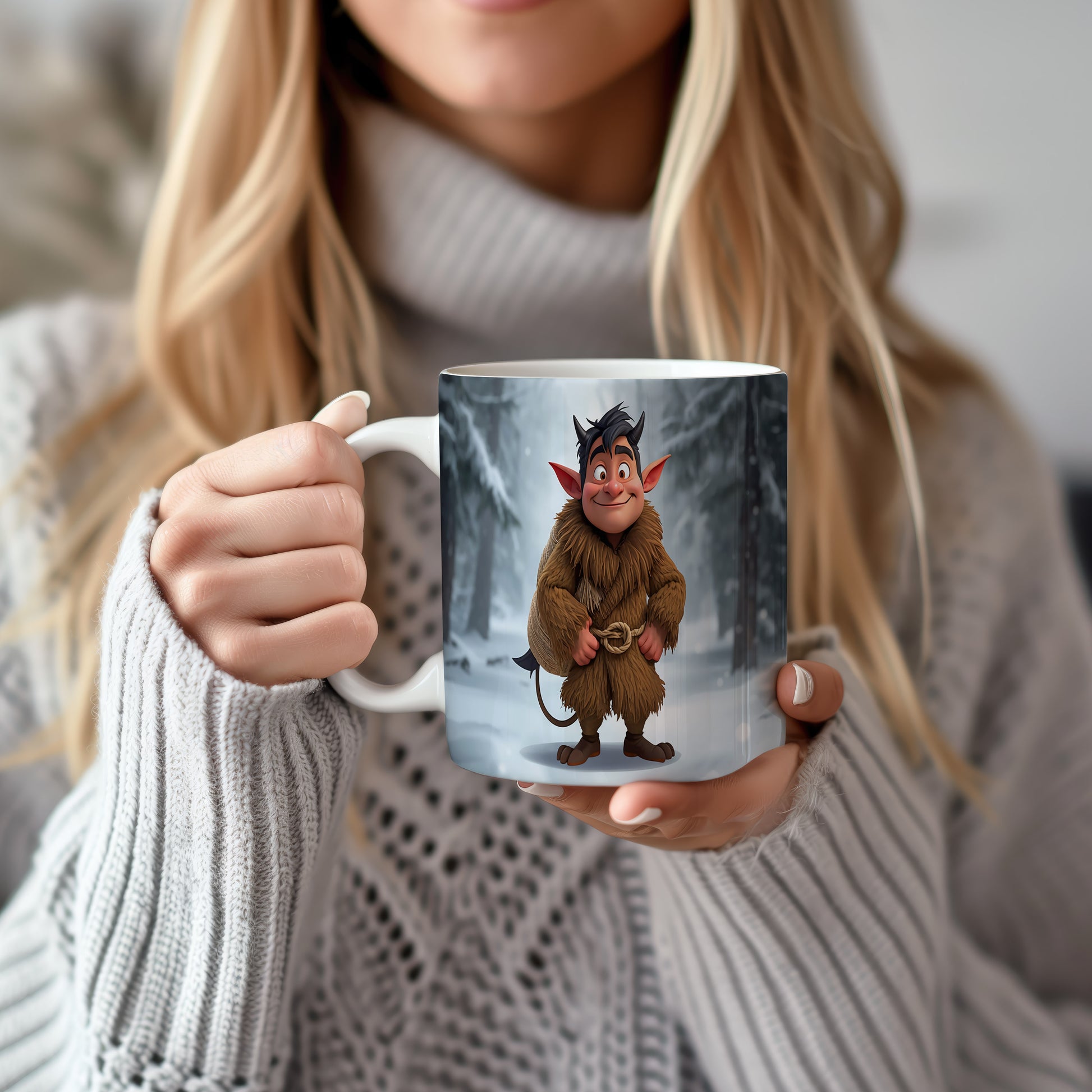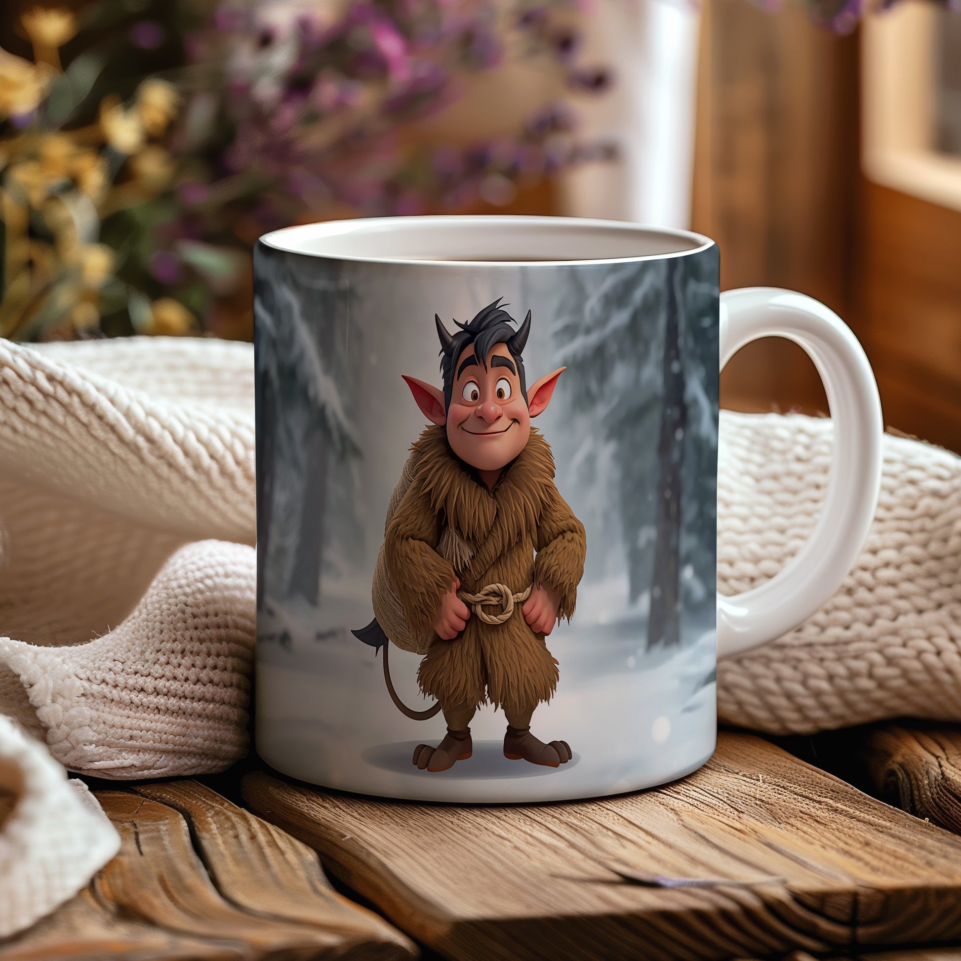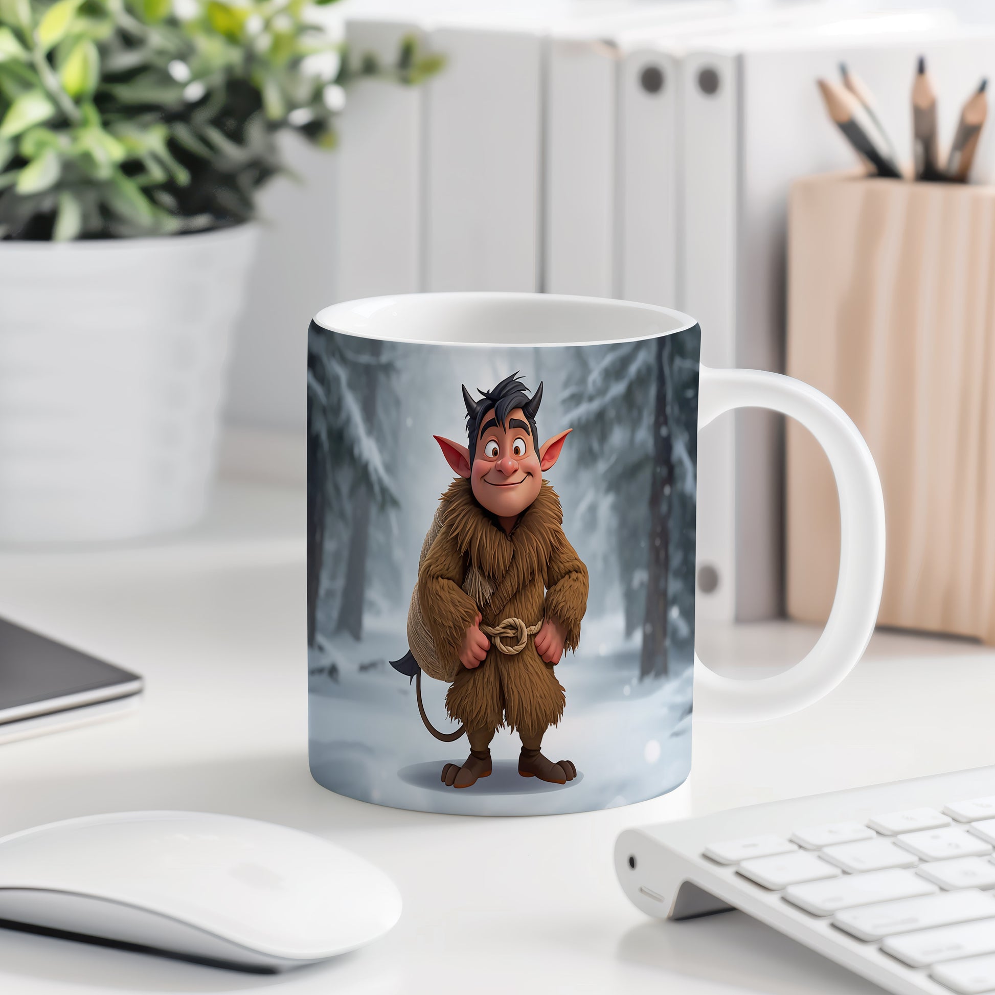 Veselý čertík v hnědém kožichu stojí uprostřed zasněženého lesa, jehož bílé stromy dodávají hrnku zimní atmosféru. Hrnek 330ml – vhodný do myčky i mikrovlnky.