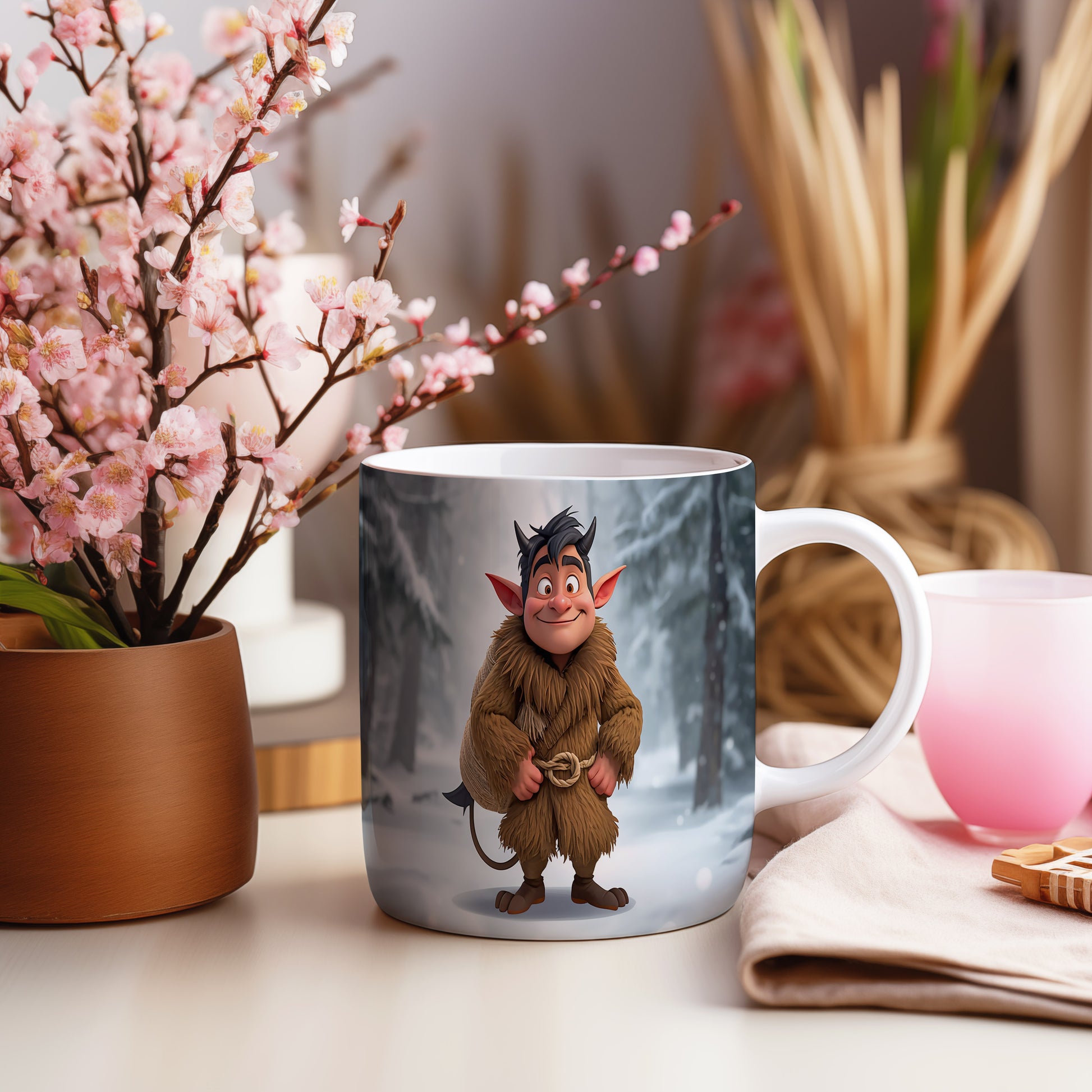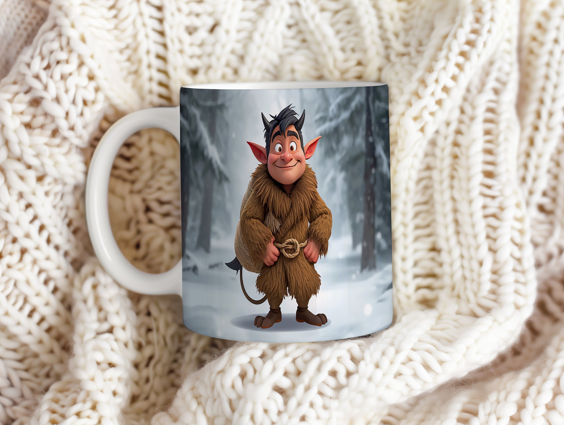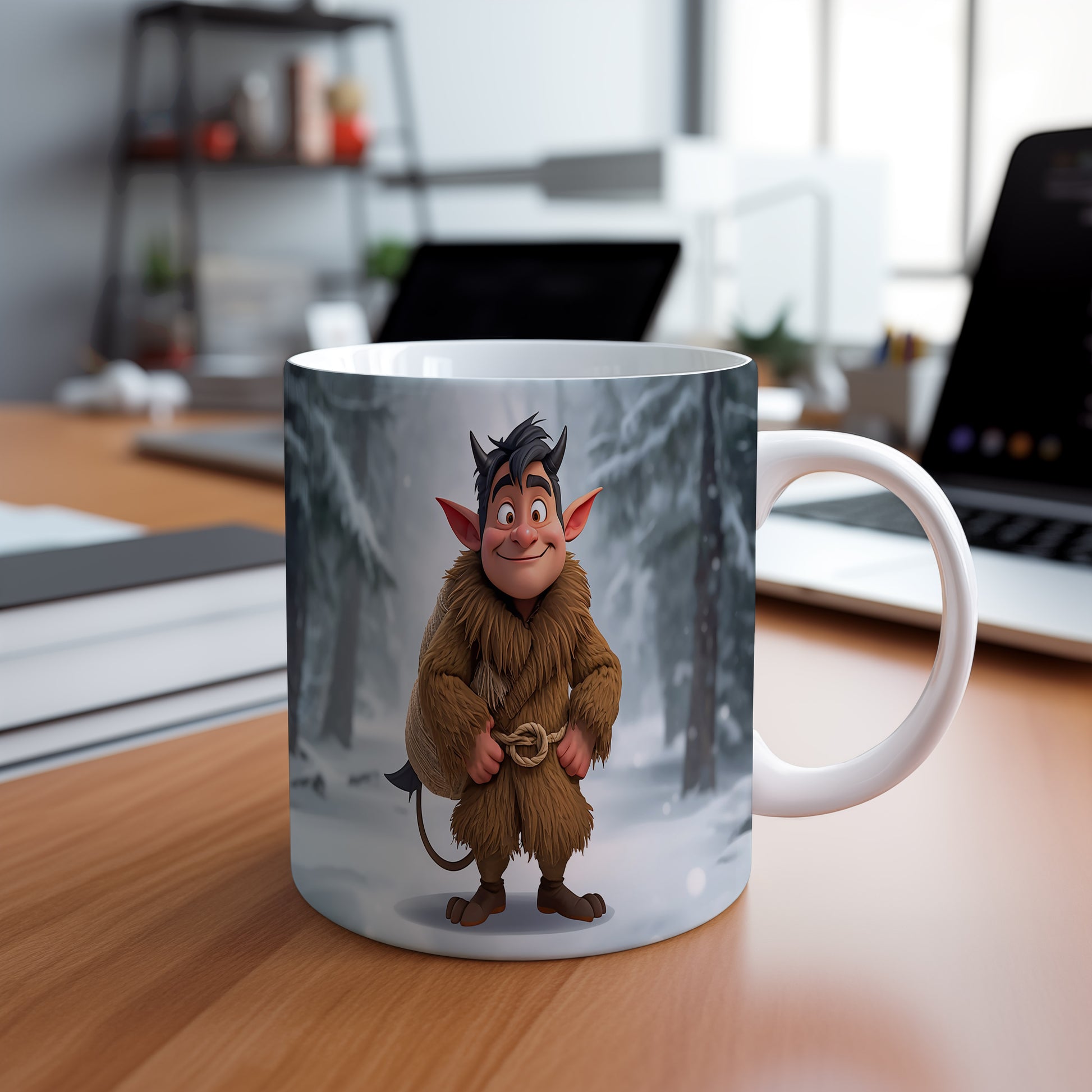 Veselý čertík v hnědém kožichu stojí uprostřed zasněženého lesa, jehož bílé stromy dodávají hrnku zimní atmosféru. Hrnek 330ml – vhodný do myčky i mikrovlnky.