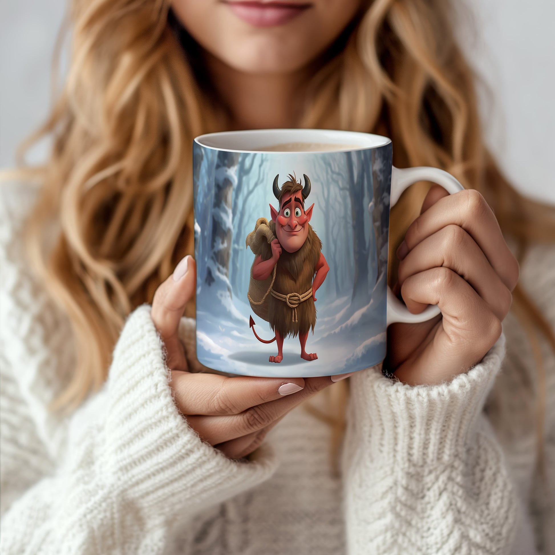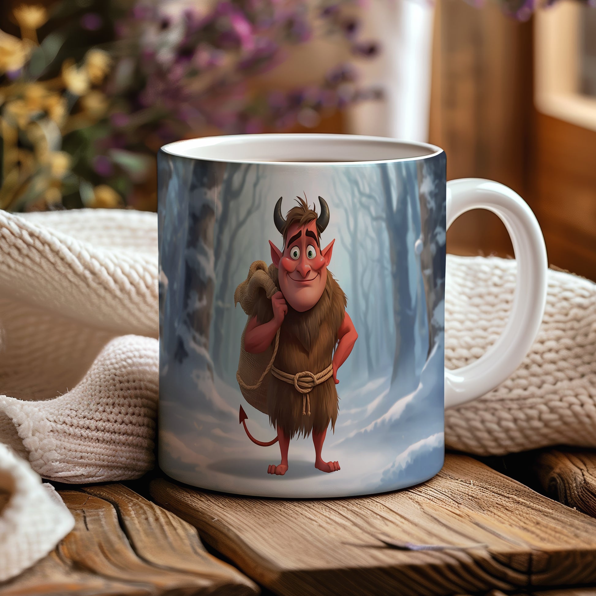Veselý čert v zimním lese přináší hravost a špetku tajemna. Studené modré a hnědé tóny vytvářejí harmonický kontrast. Hrnek 330ml – vhodný do myčky i mikrovlnky.