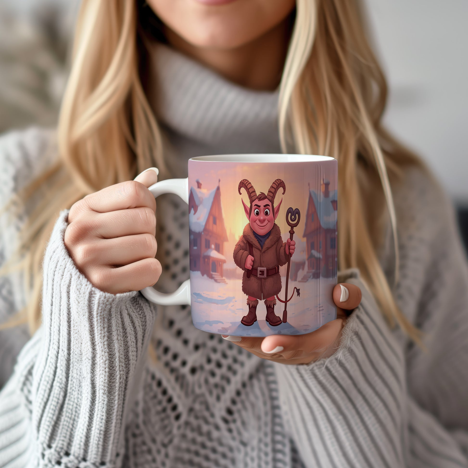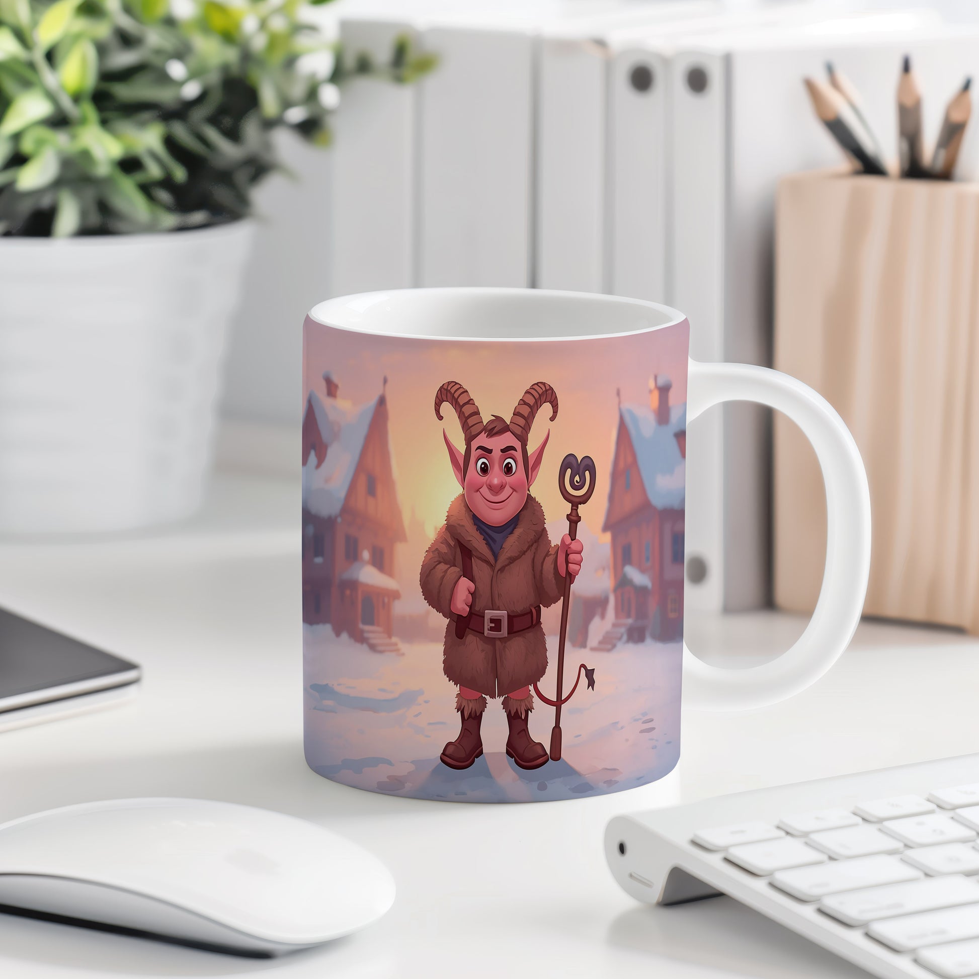 Veselý čert v hřejivých barvách stojí před zasněženými domky při východu slunce. Hrnek 330ml – vhodný do myčky i mikrovlnky.