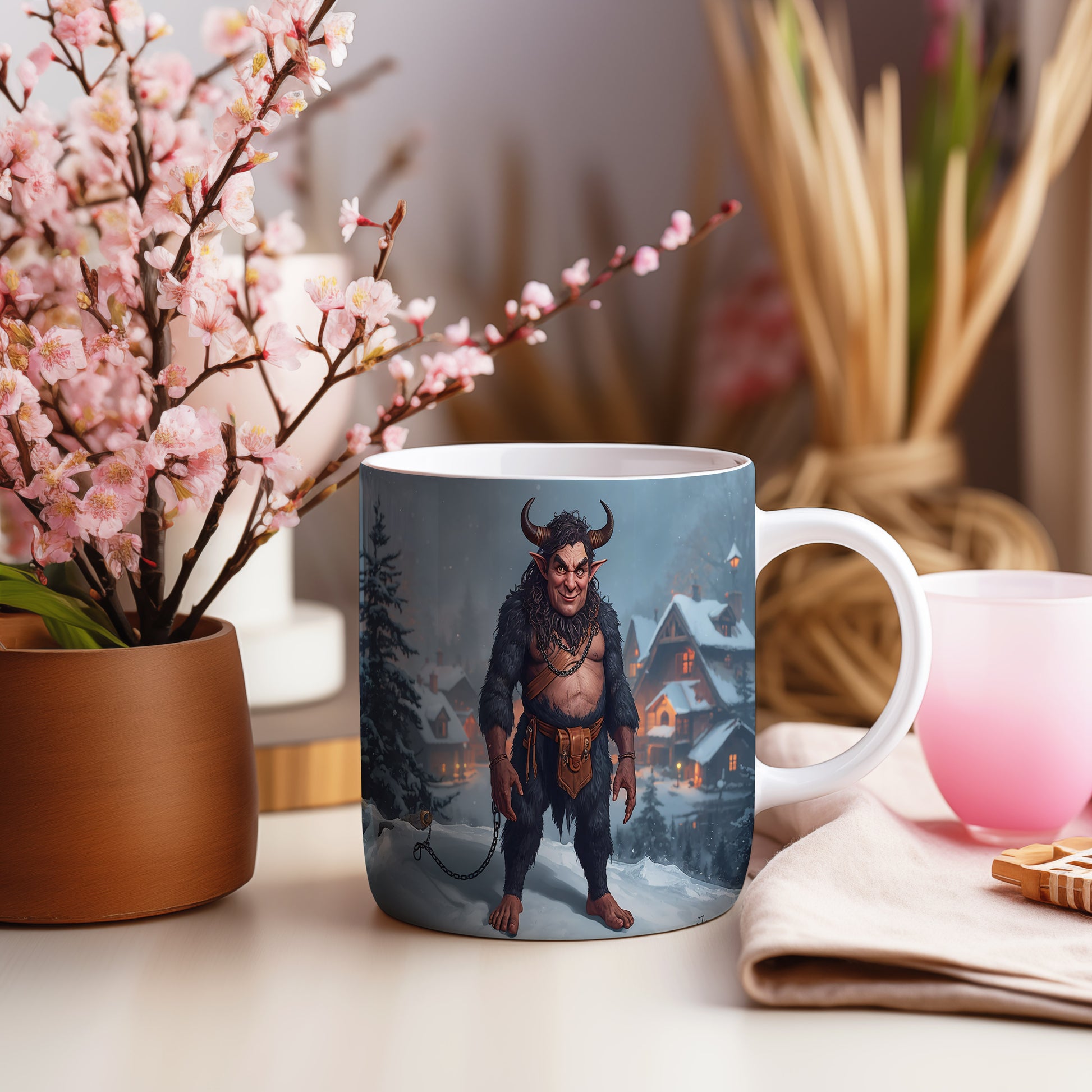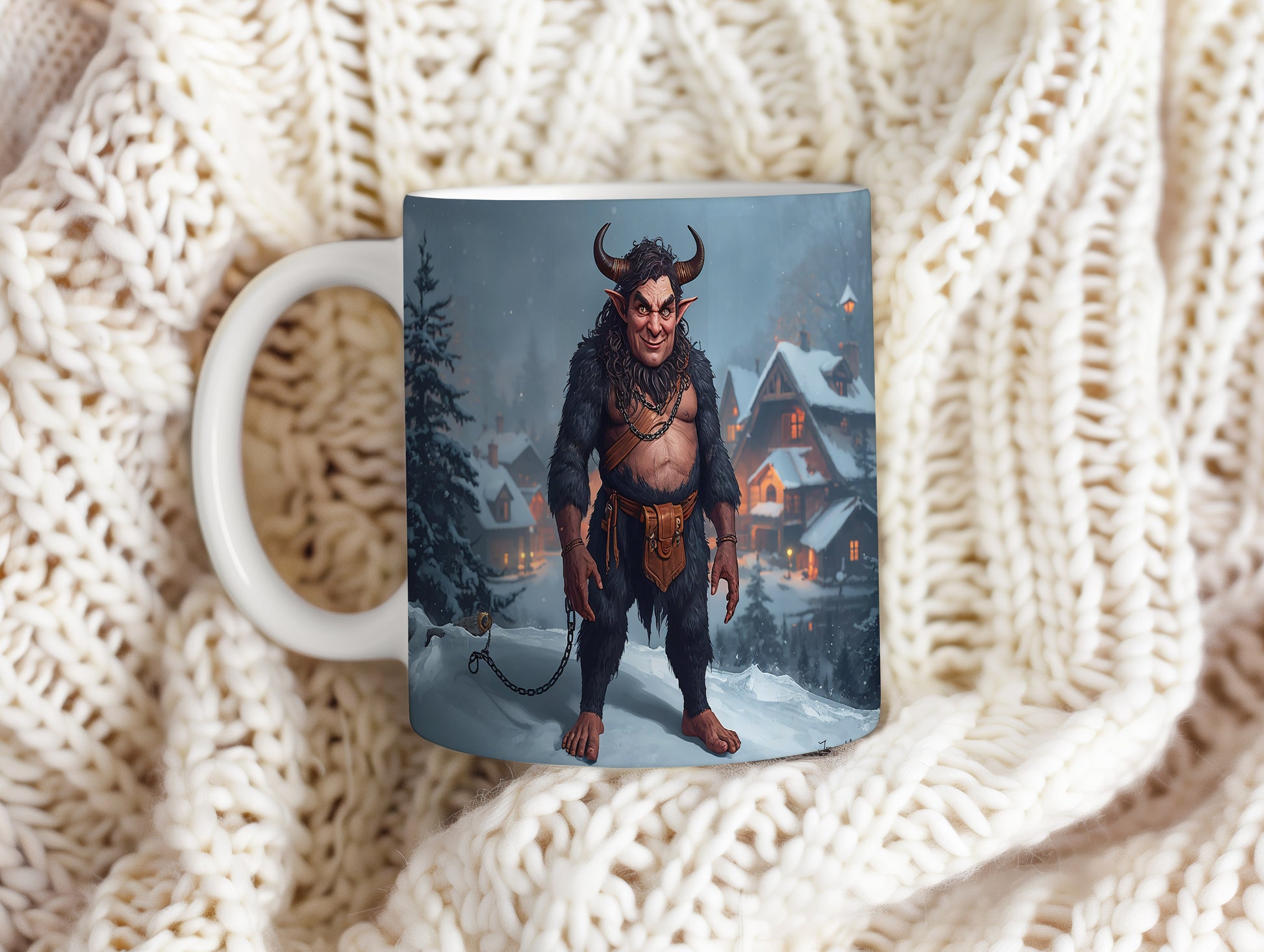 V temné zimní noci se čert objevuje před zasněženými chalupami, kde jeho řetězy tiše cinkají. Hrnek 330ml – vhodný do myčky i mikrovlnky.