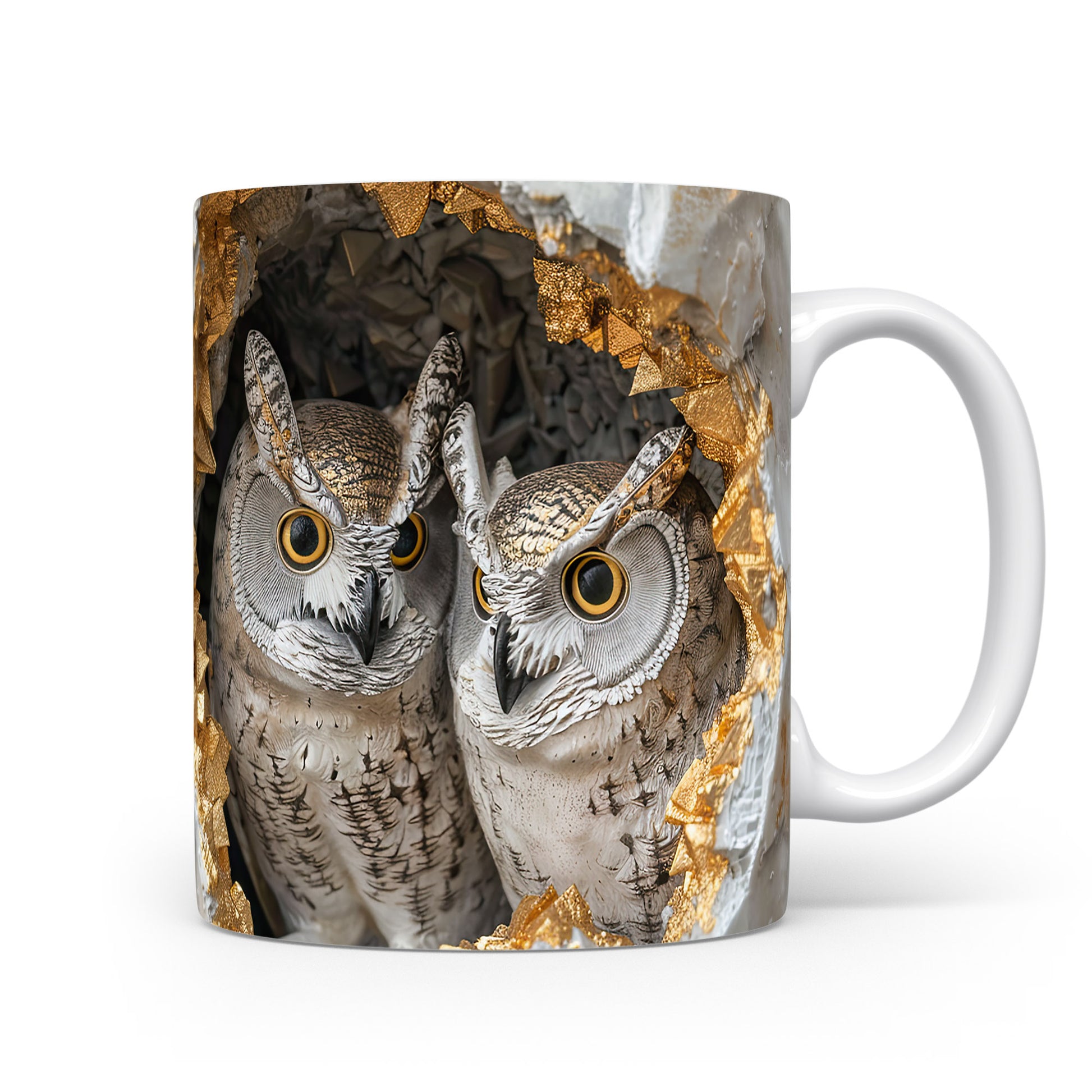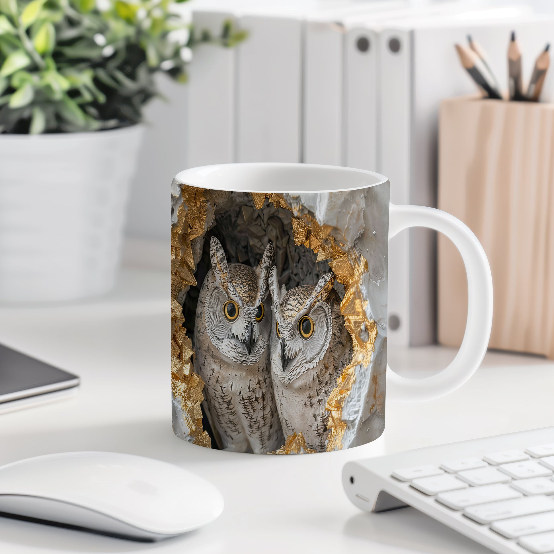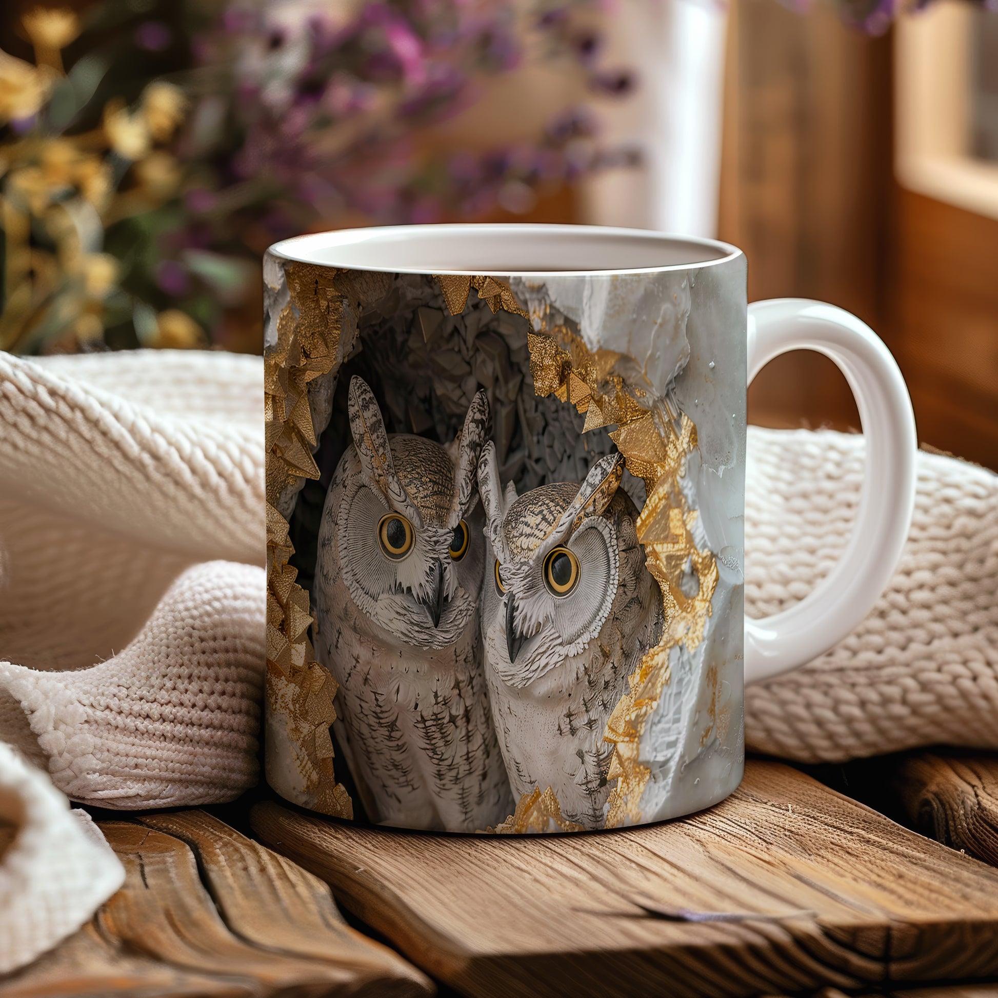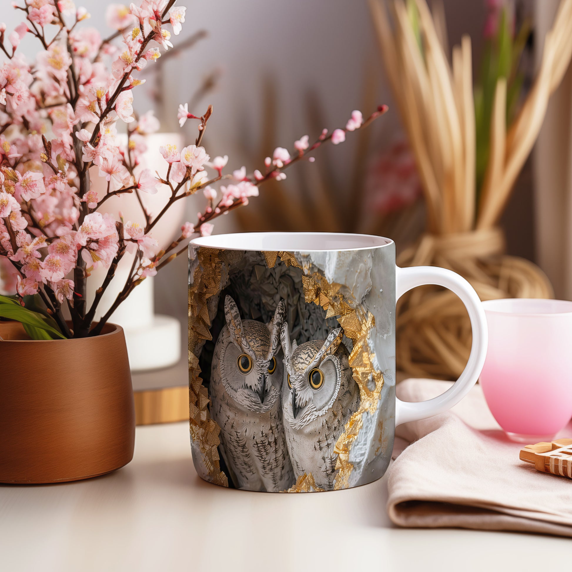 Keramický hrnek s originálním motivem dvou soviček, které spojuje elegantní zlatá dekorace. Tento hrnek je ideální pro milovníky ptáků a přírody, skvělý jako dárek pro přátele nebo rodinu. Materiál: keramika. Objem: 330 ml. Vhodné do myčky i mikrovlnky. Používání tohoto hrnku přináší radost z každého doušku.