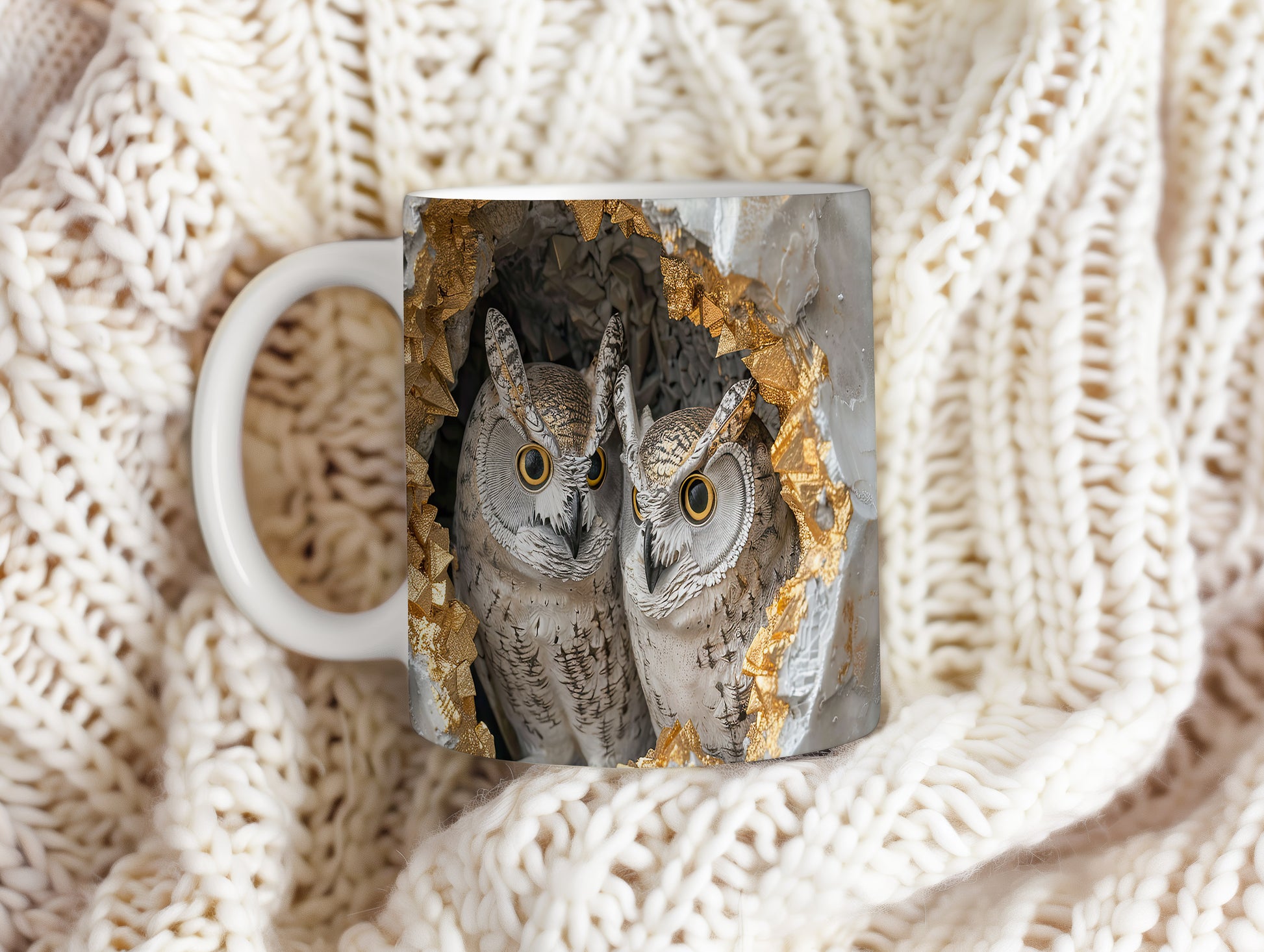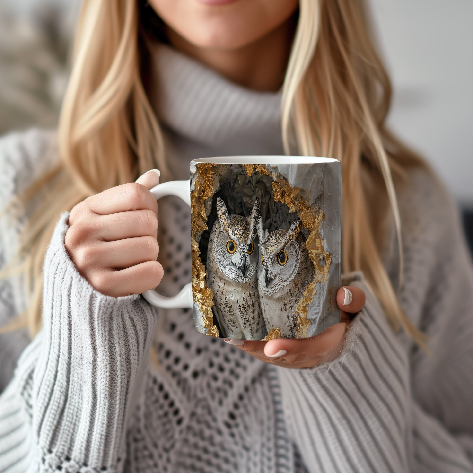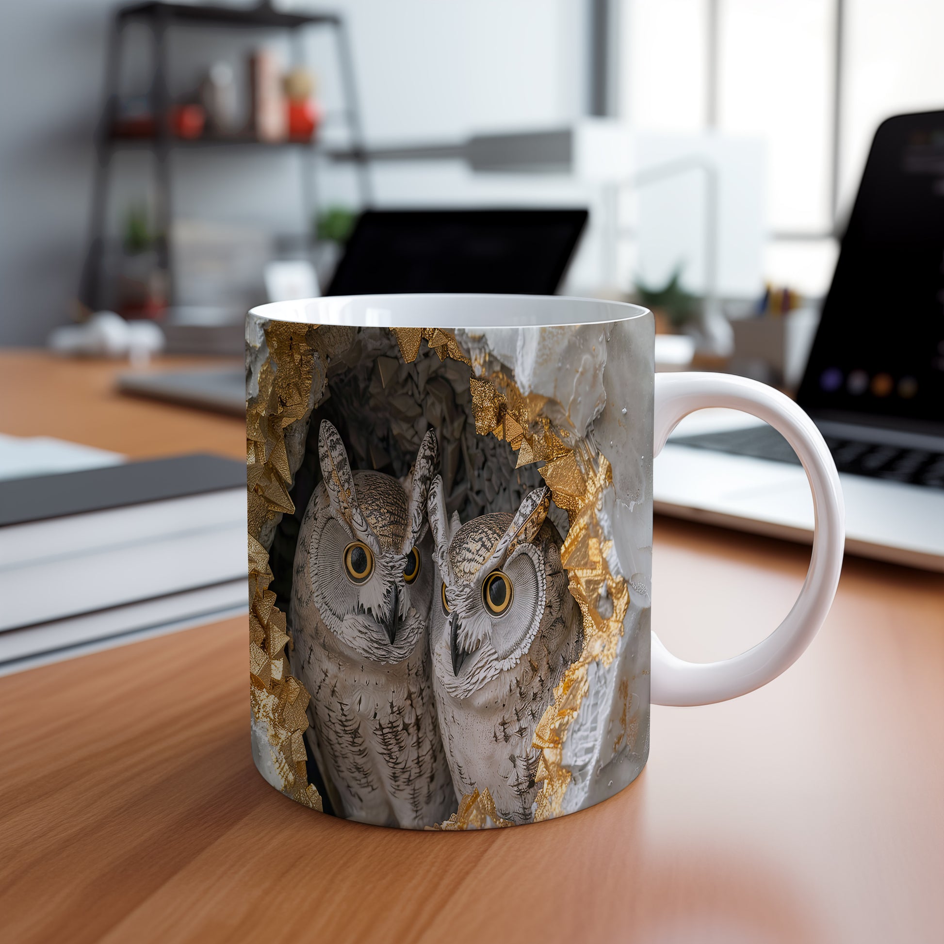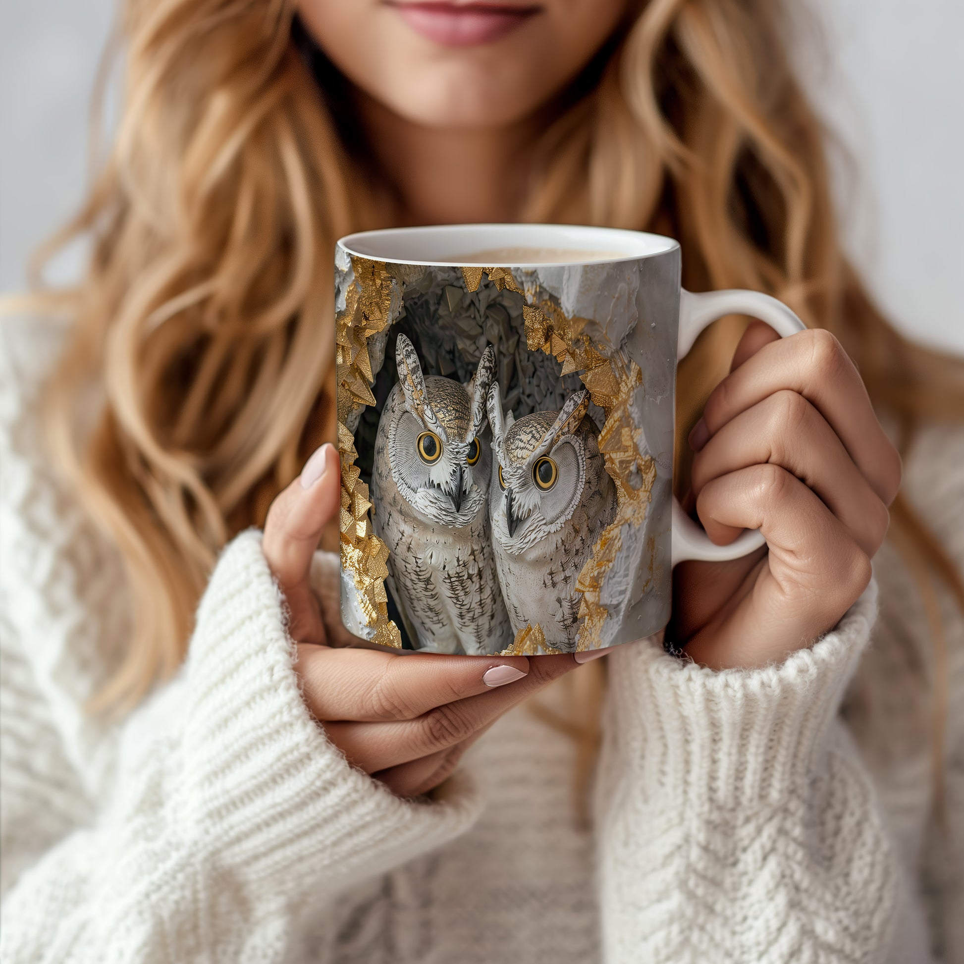 Keramický hrnek s originálním motivem dvou soviček, které spojuje elegantní zlatá dekorace. Tento hrnek je ideální pro milovníky ptáků a přírody, skvělý jako dárek pro přátele nebo rodinu. Materiál: keramika. Objem: 330 ml. Vhodné do myčky i mikrovlnky. Používání tohoto hrnku přináší radost z každého doušku.