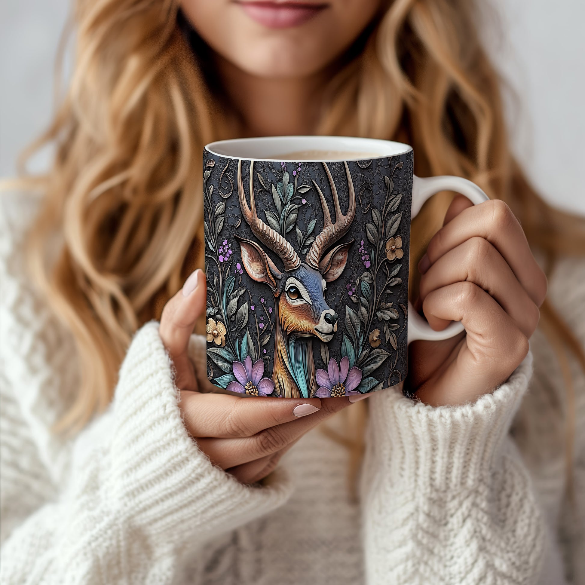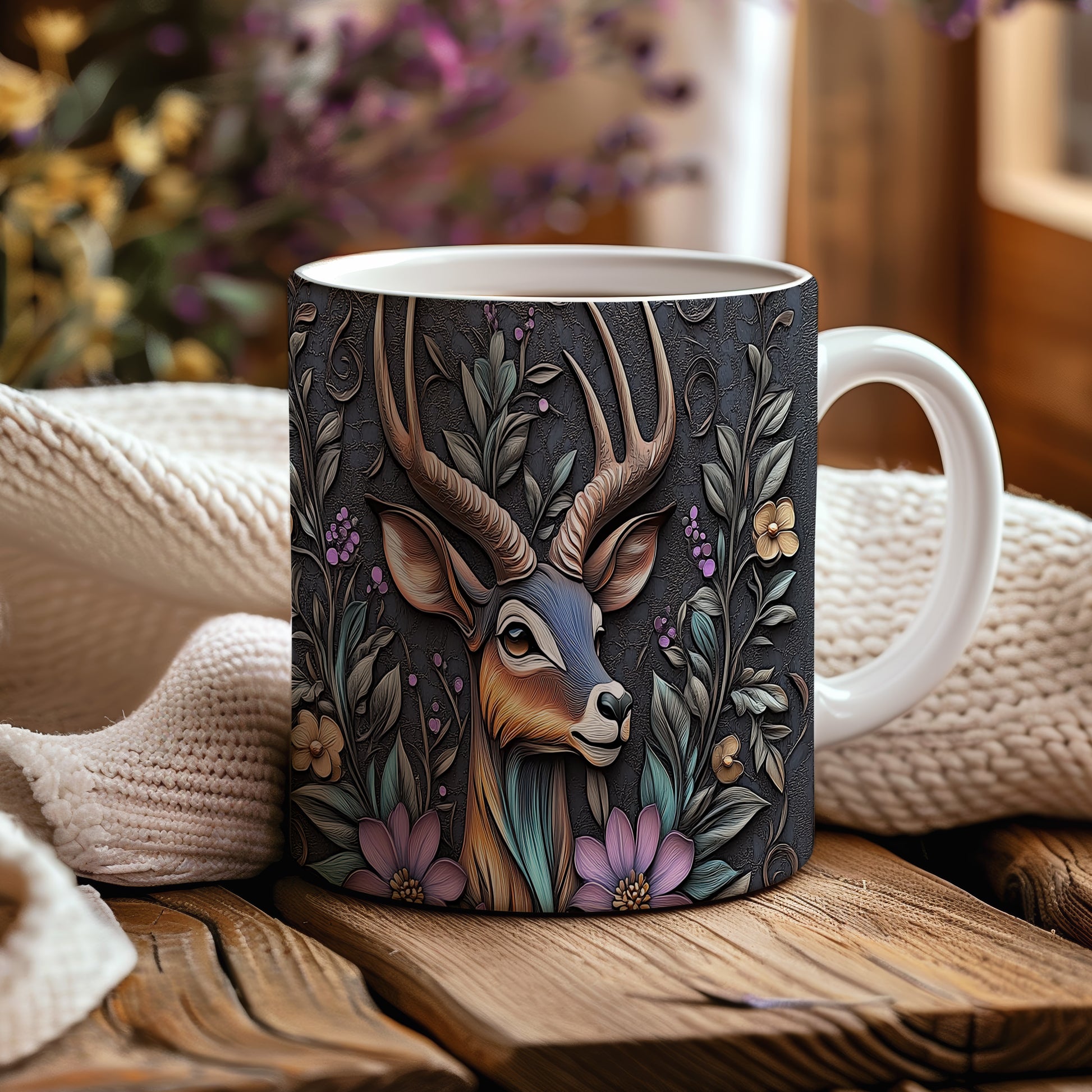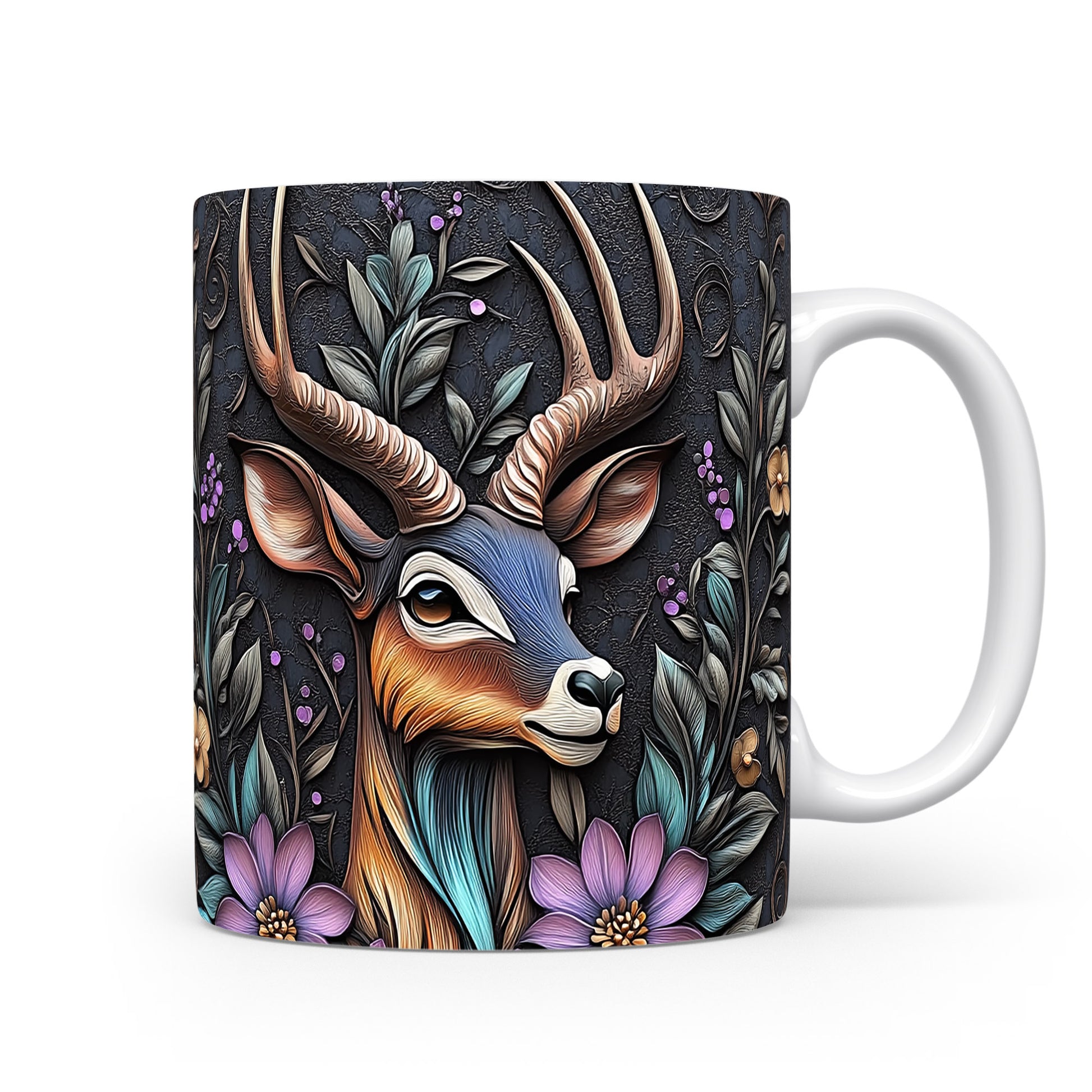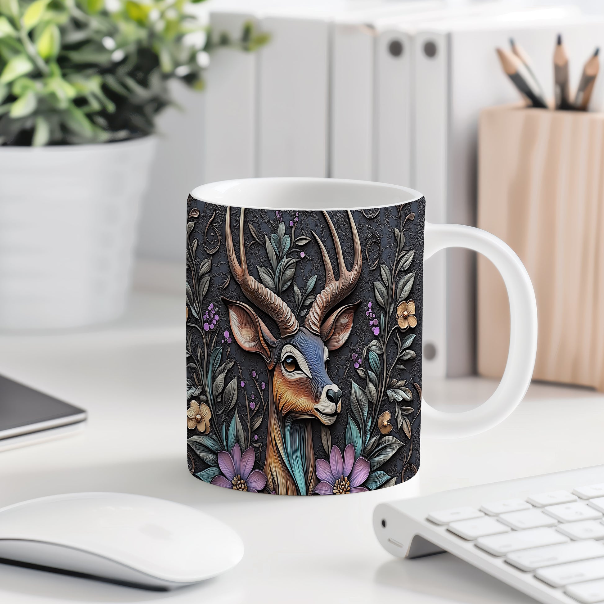 Tento pestrobarevný hrnek s elegantním motivem jelena obklopeného květinami a listím je ideální pro milovníky přírody. Skvělý tip na dárek pro přátele nebo rodinu, kteří ocení originální design. Materiál: keramika. Objem: 330 ml. Vhodné do myčky i mikrovlnky. Používání tohoto hrnku přináší radost z každého doušku.