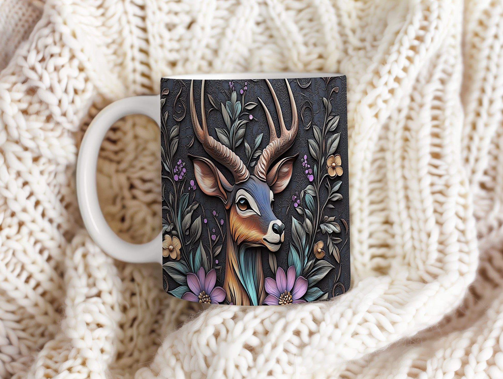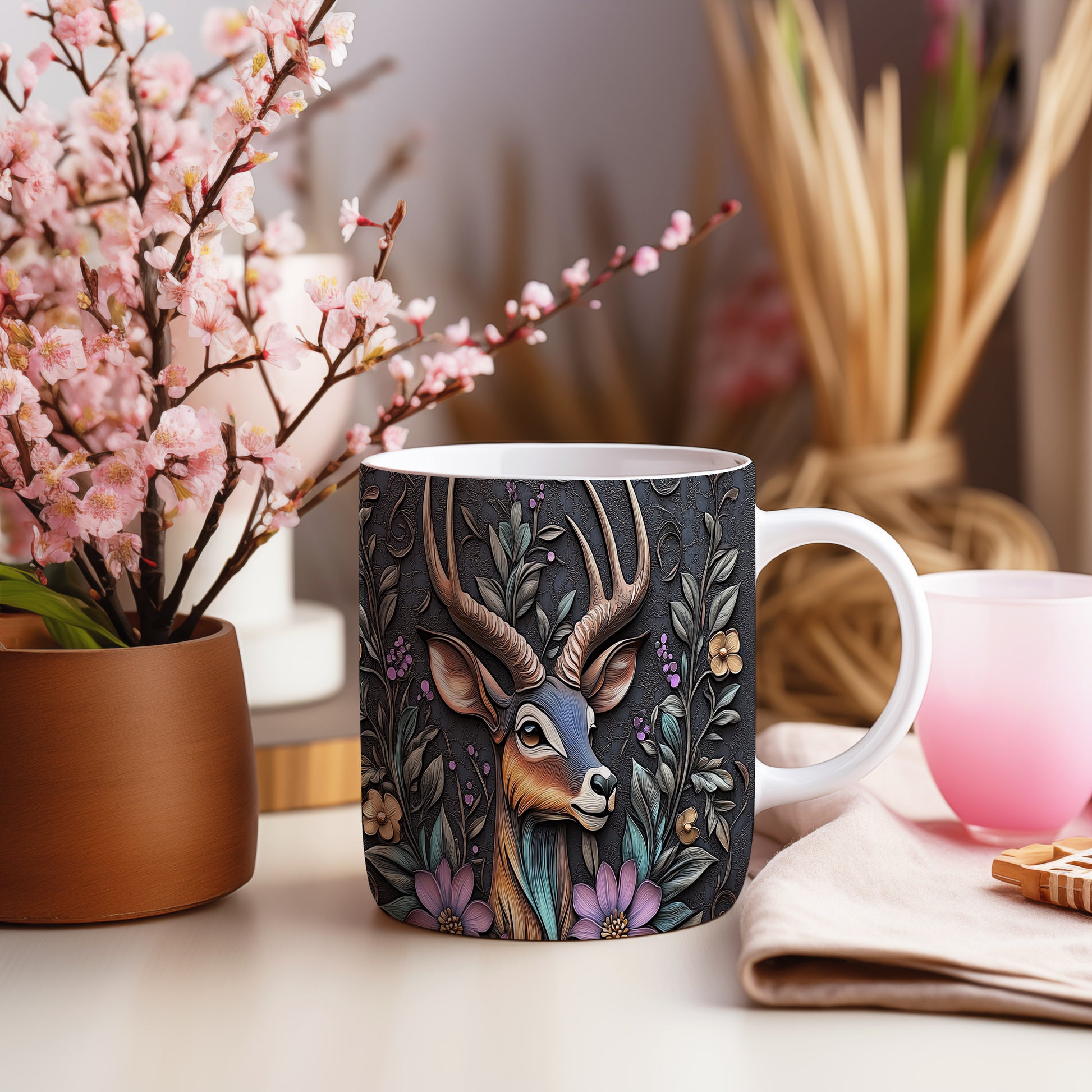 Hrnek s motivem jelena a květinami
