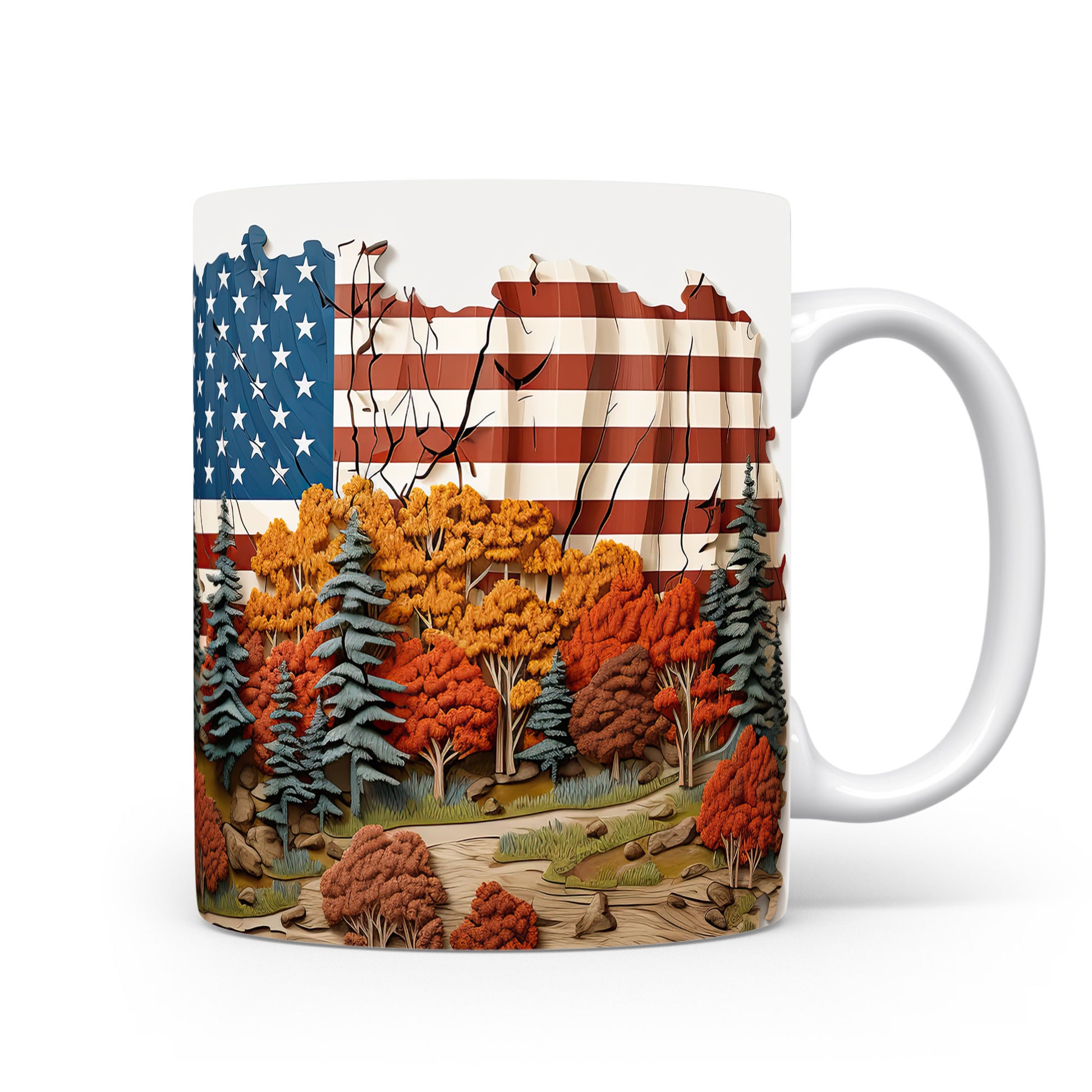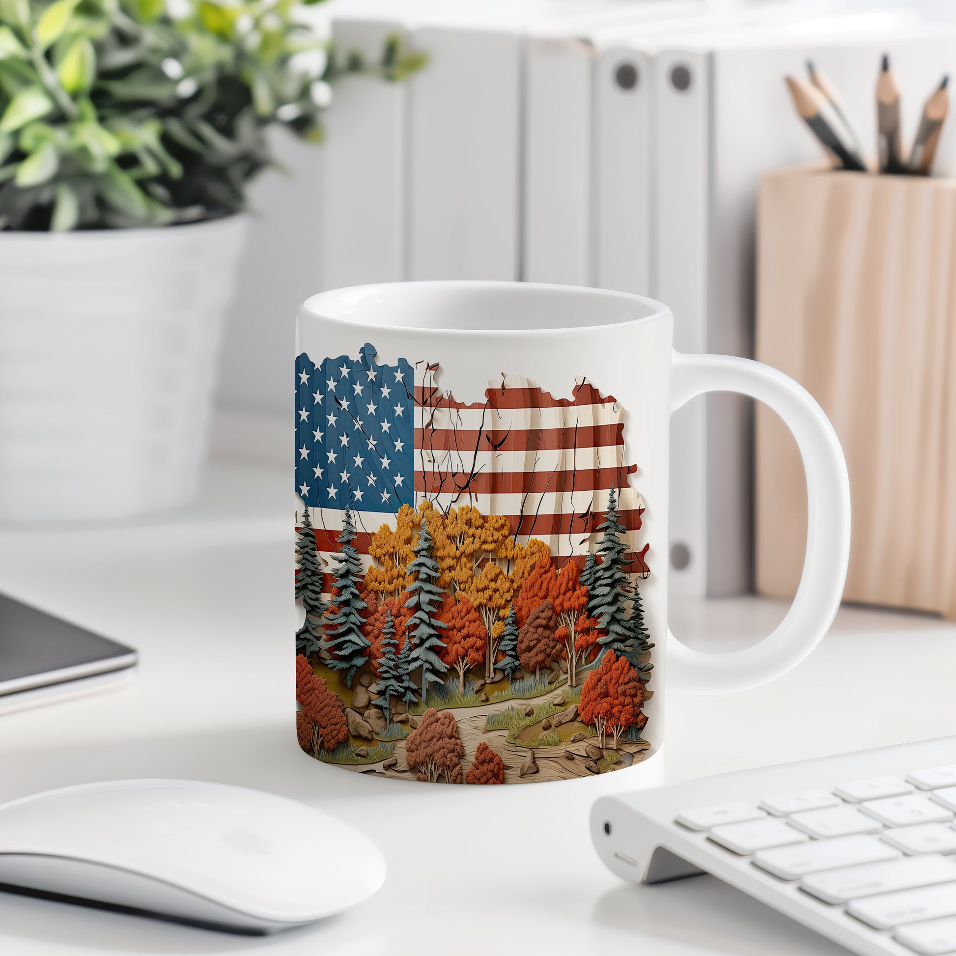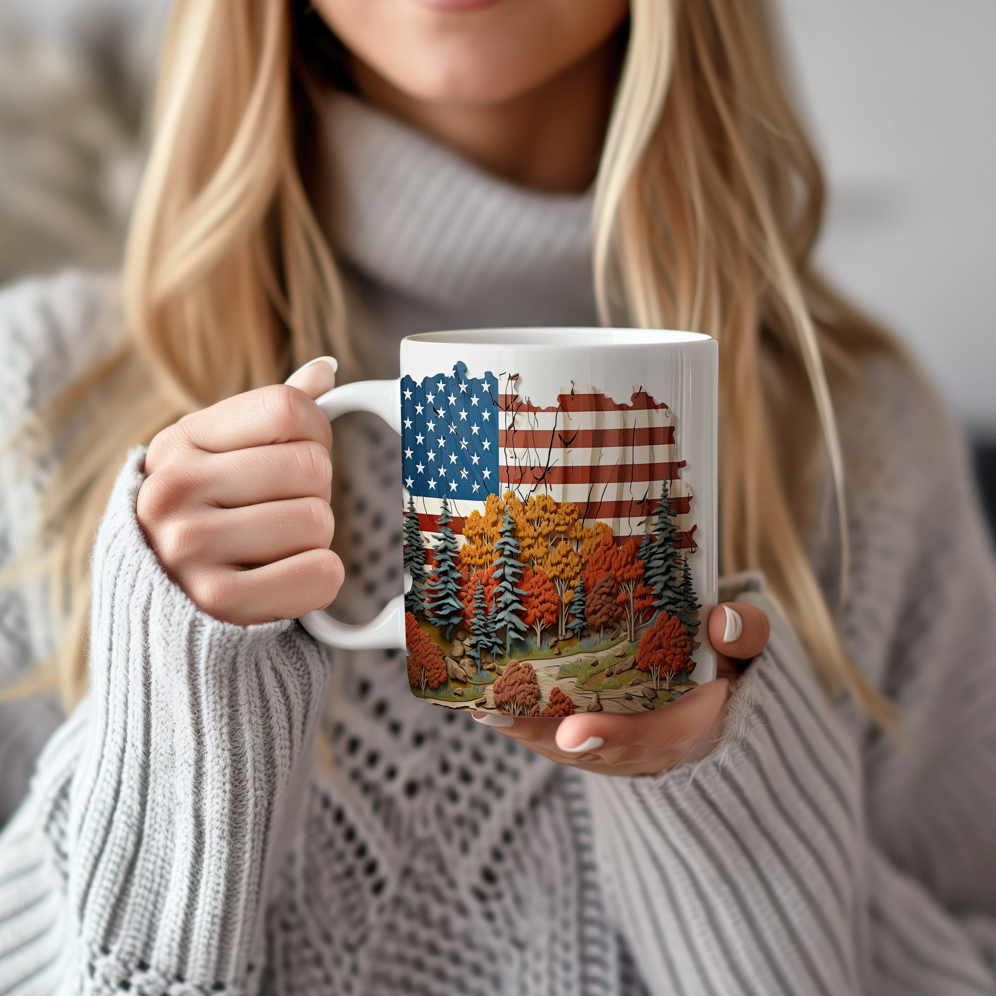 Hrnek s motivem krajiny a americkou vlajkou je skvělým kouskem pro milovníky přírody a vlastenectví. Tento hrnek je ideální jako dárek pro přátele nebo rodinu, kteří ocení krásu přírody a patriotismus. Materiál: keramika. Objem: 330 ml. Vhodné do myčky i mikrovlnky. Užívejte si svůj oblíbený nápoj s tímto stylovým hrnkem, který přináší radost do každého dne.
