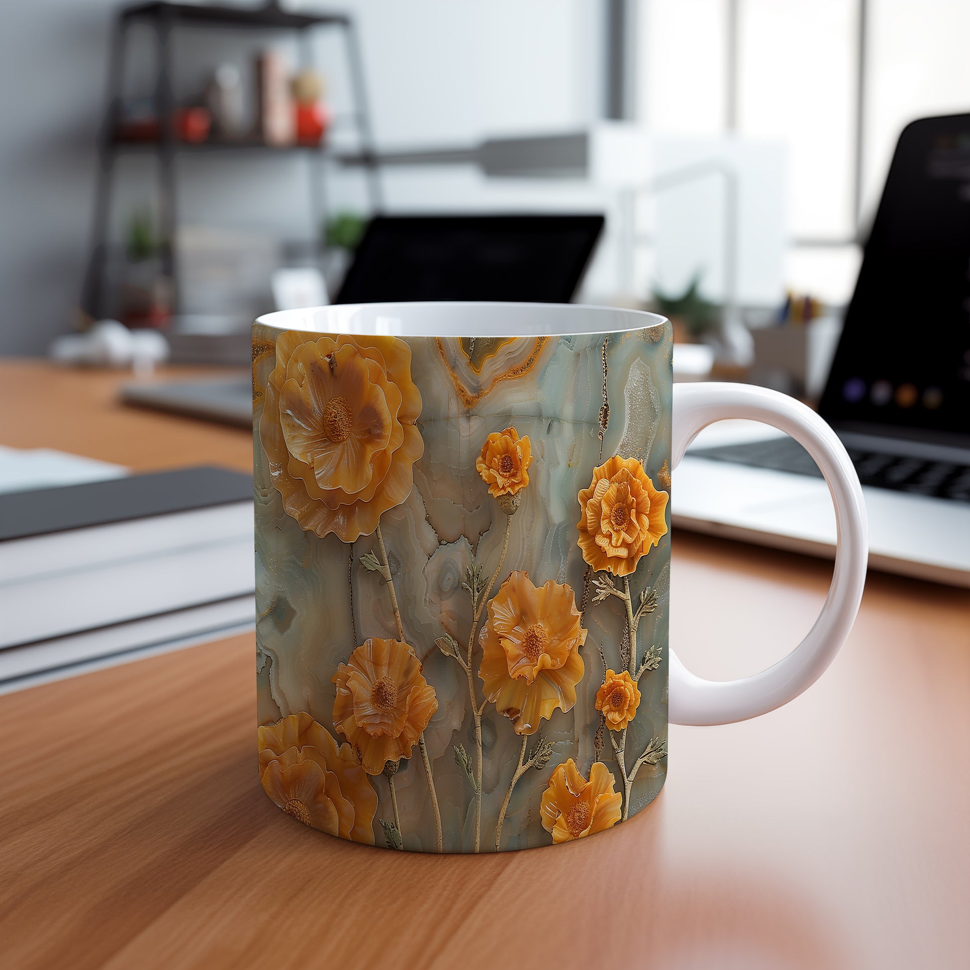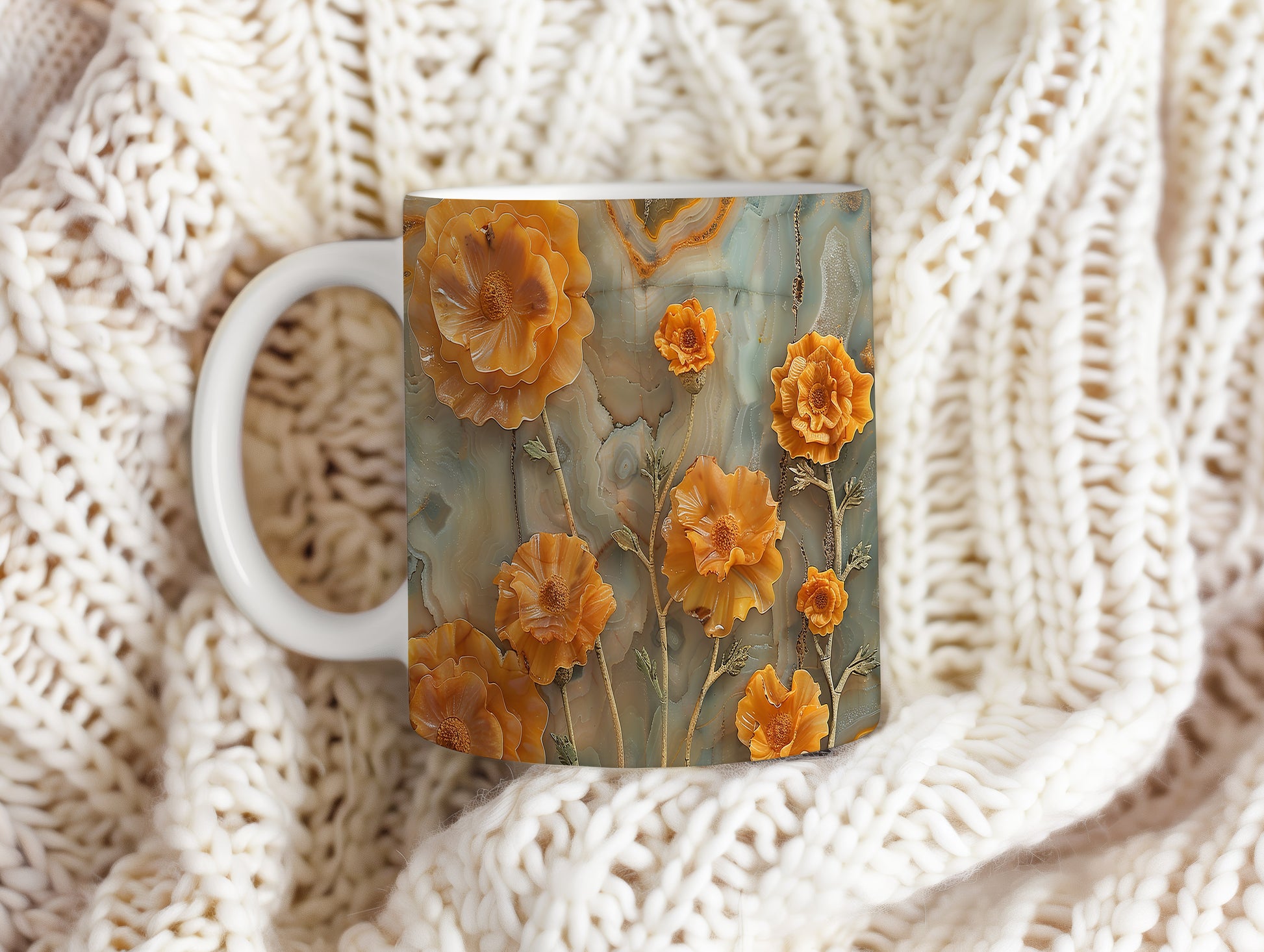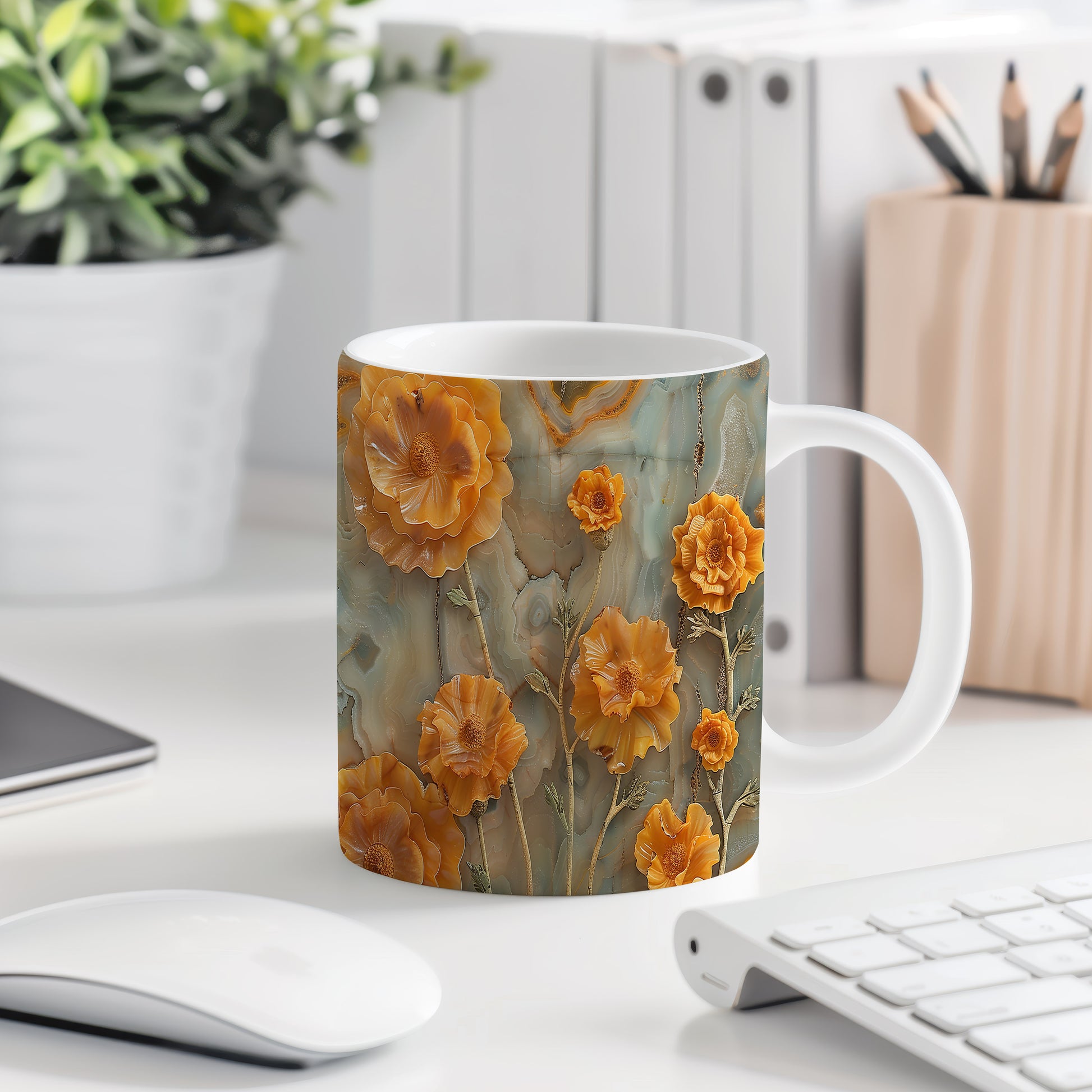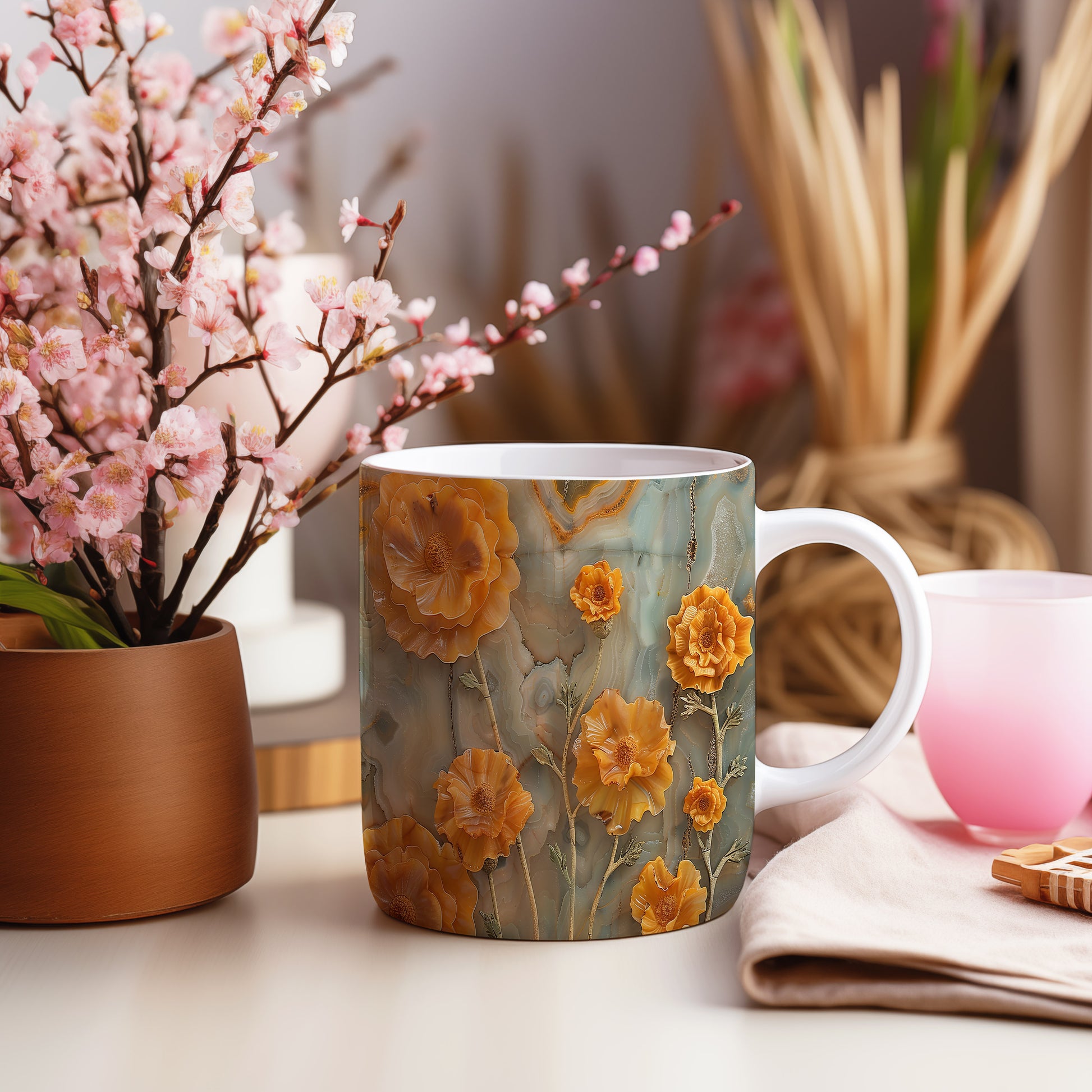 Hrnek s motivem květin v oranžových odstínech