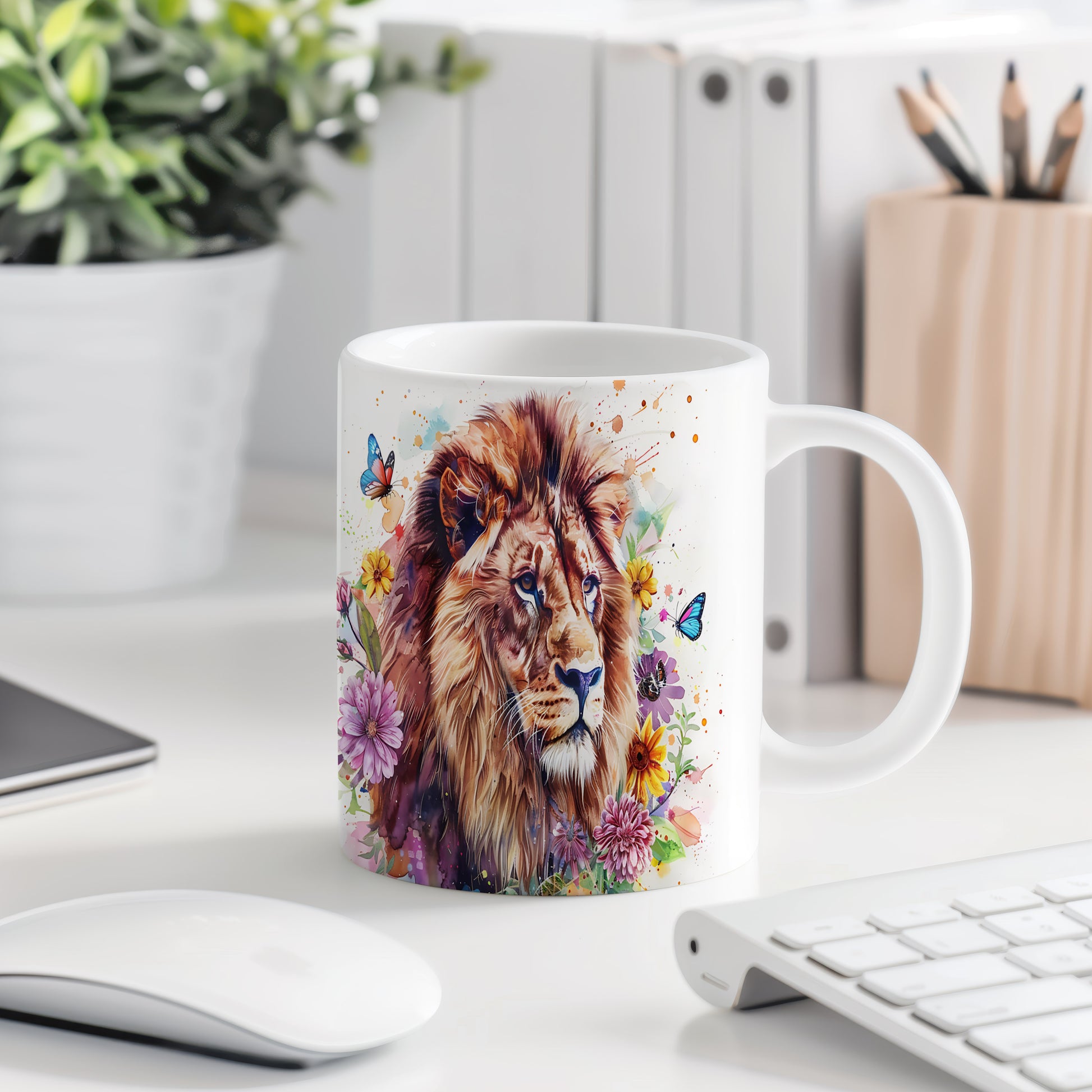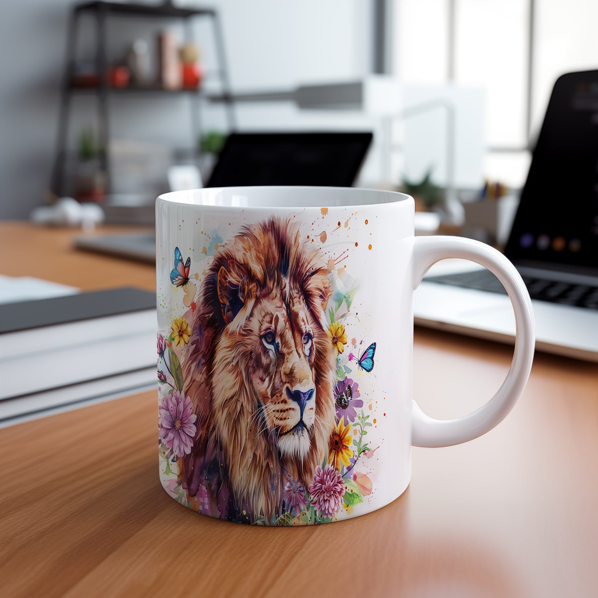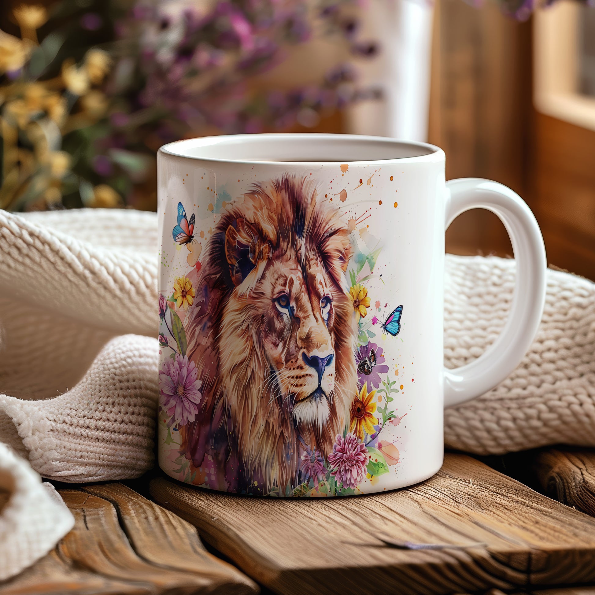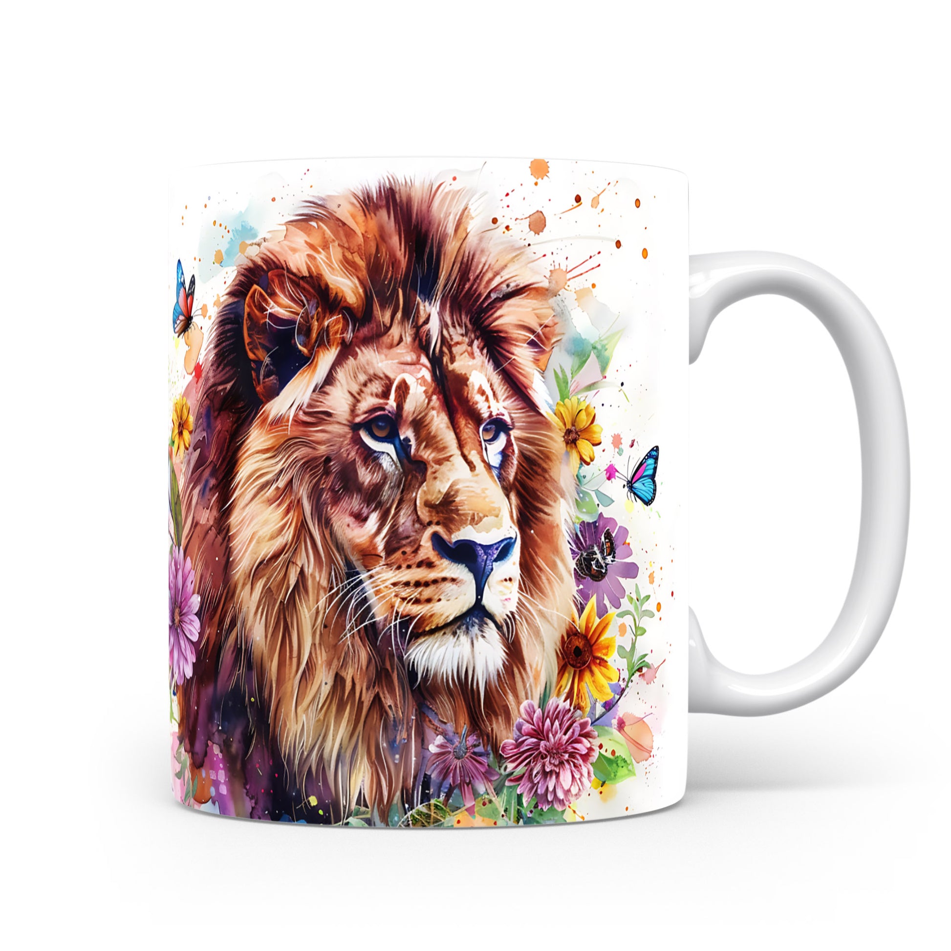 Tento keramický hrnek s realistickým portrétem lva obklopeného barevnými květinami a motýly je ideální pro milovníky přírody a zvířat. Skvělý tip na dárek pro přátele nebo rodinu, kteří ocení krásu přírody. Materiál: keramika. Objem: 330 ml. Vhodné do myčky i mikrovlnky. Používáním tohoto hrnku si užijete nejen kávu nebo čaj, ale i krásný design, který oživí váš den.