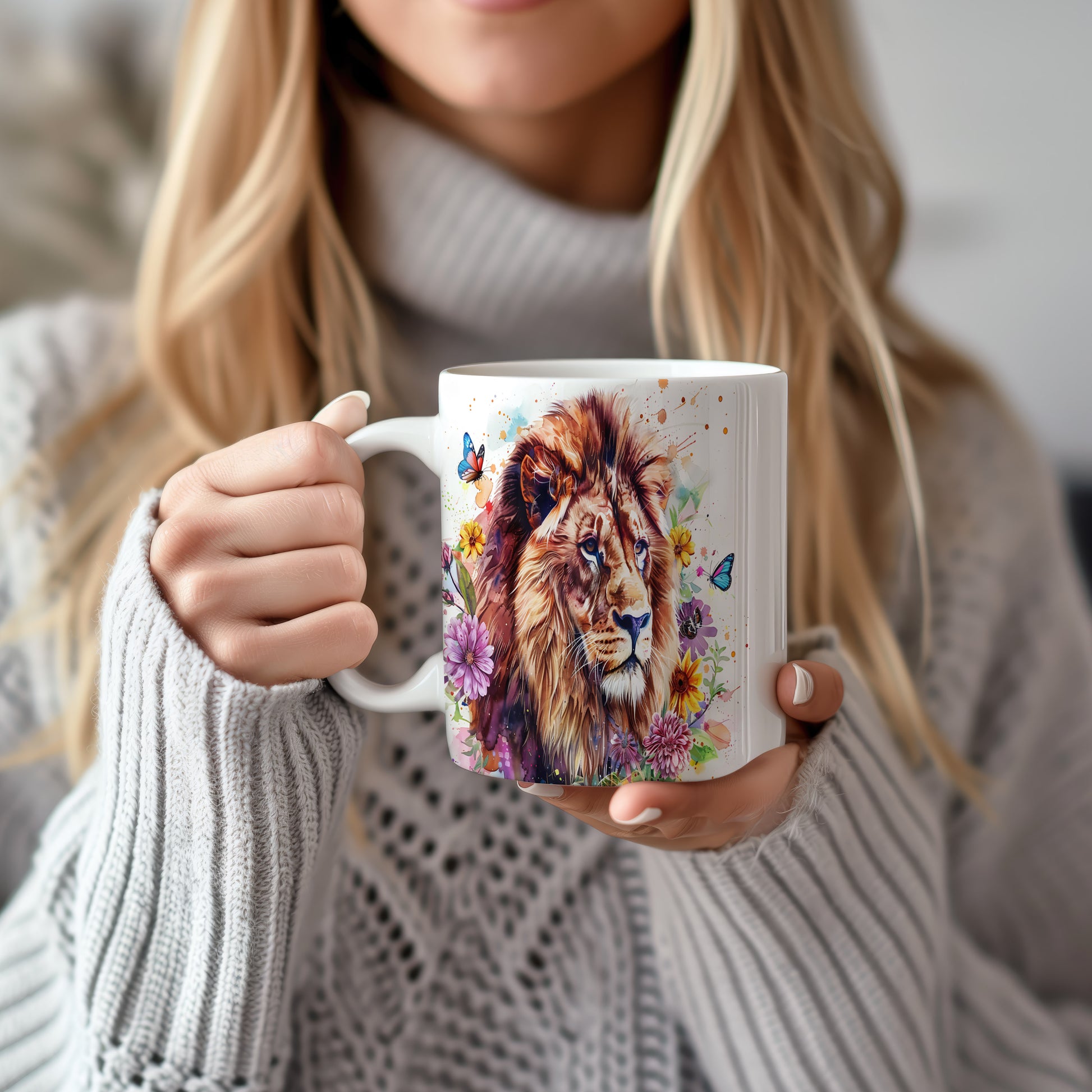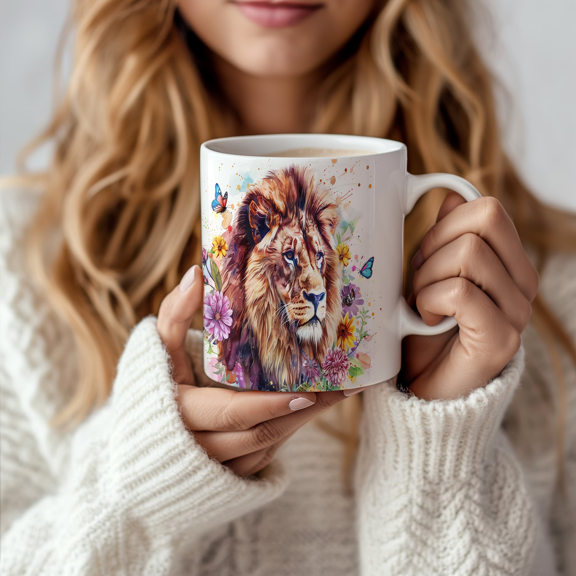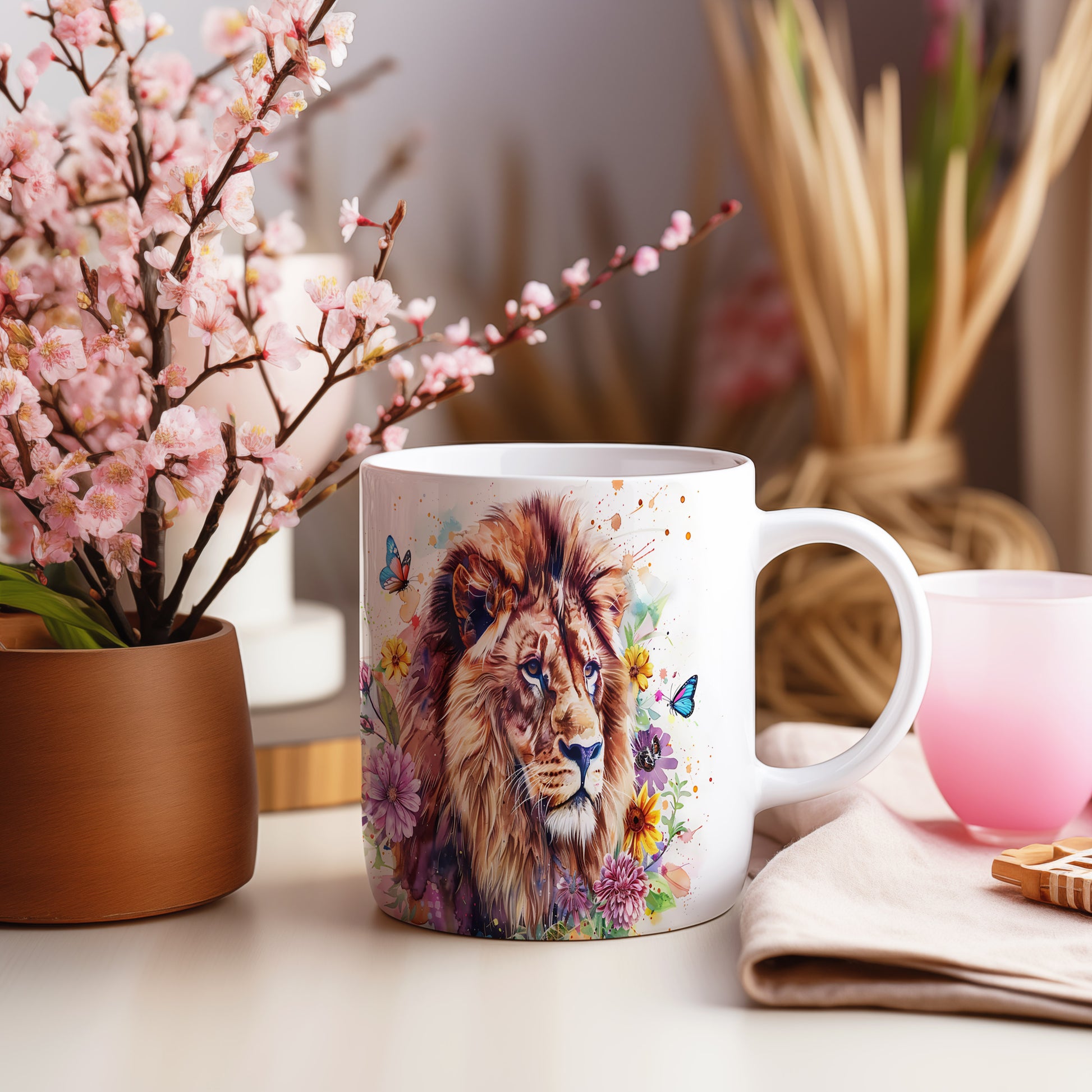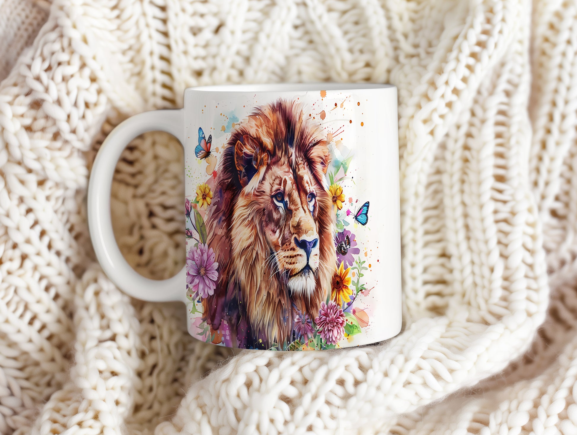 Tento keramický hrnek s realistickým portrétem lva obklopeného barevnými květinami a motýly je ideální pro milovníky přírody a zvířat. Skvělý tip na dárek pro přátele nebo rodinu, kteří ocení krásu přírody. Materiál: keramika. Objem: 330 ml. Vhodné do myčky i mikrovlnky. Používáním tohoto hrnku si užijete nejen kávu nebo čaj, ale i krásný design, který oživí váš den.