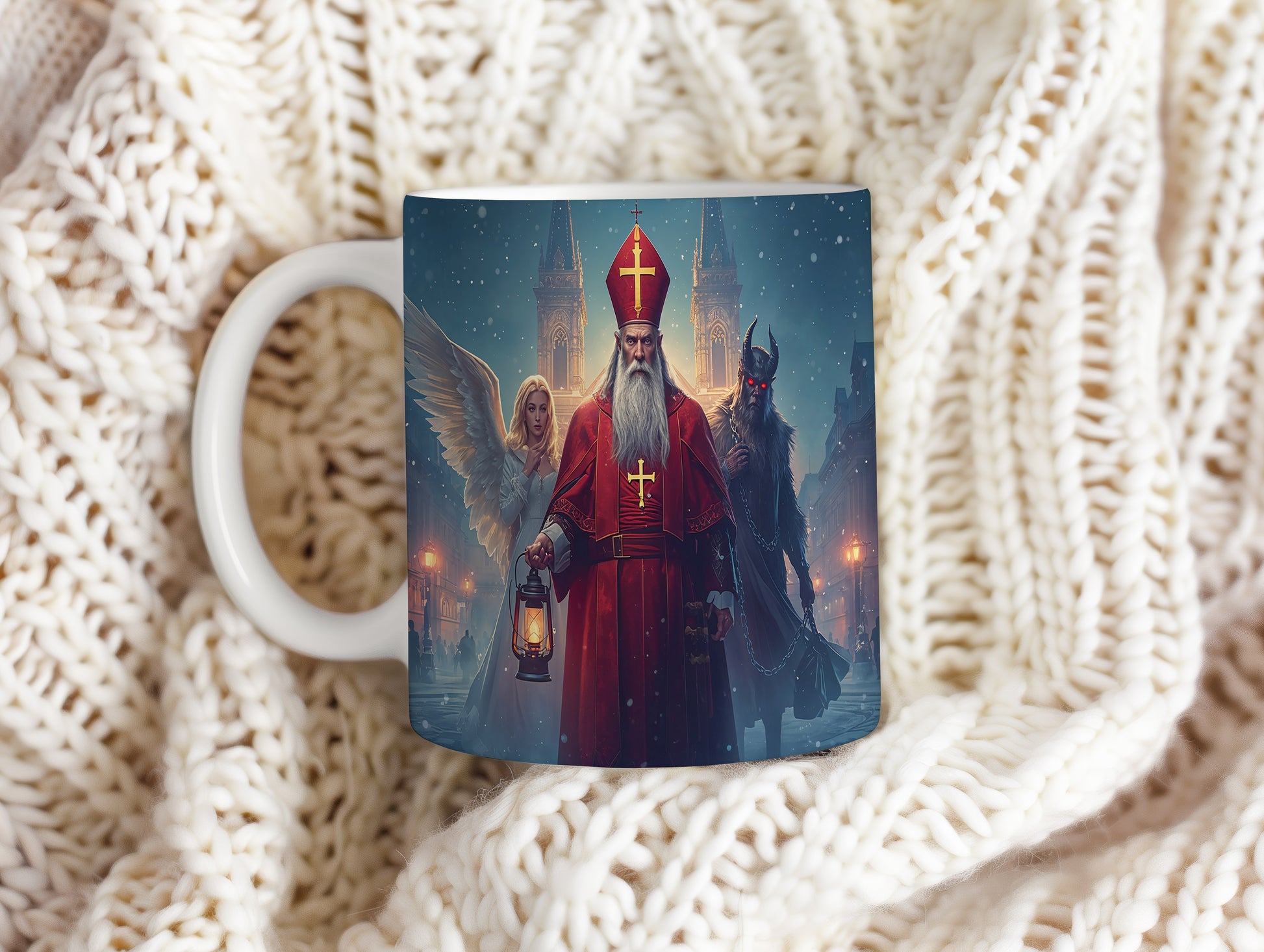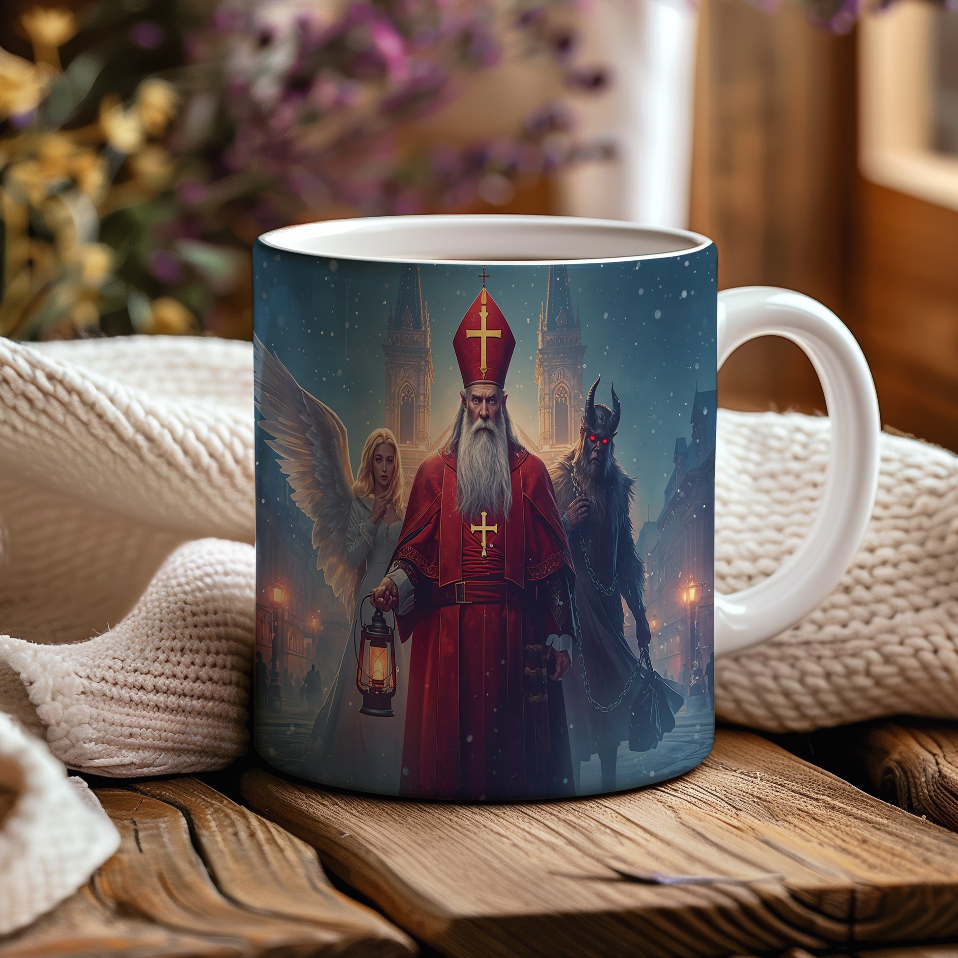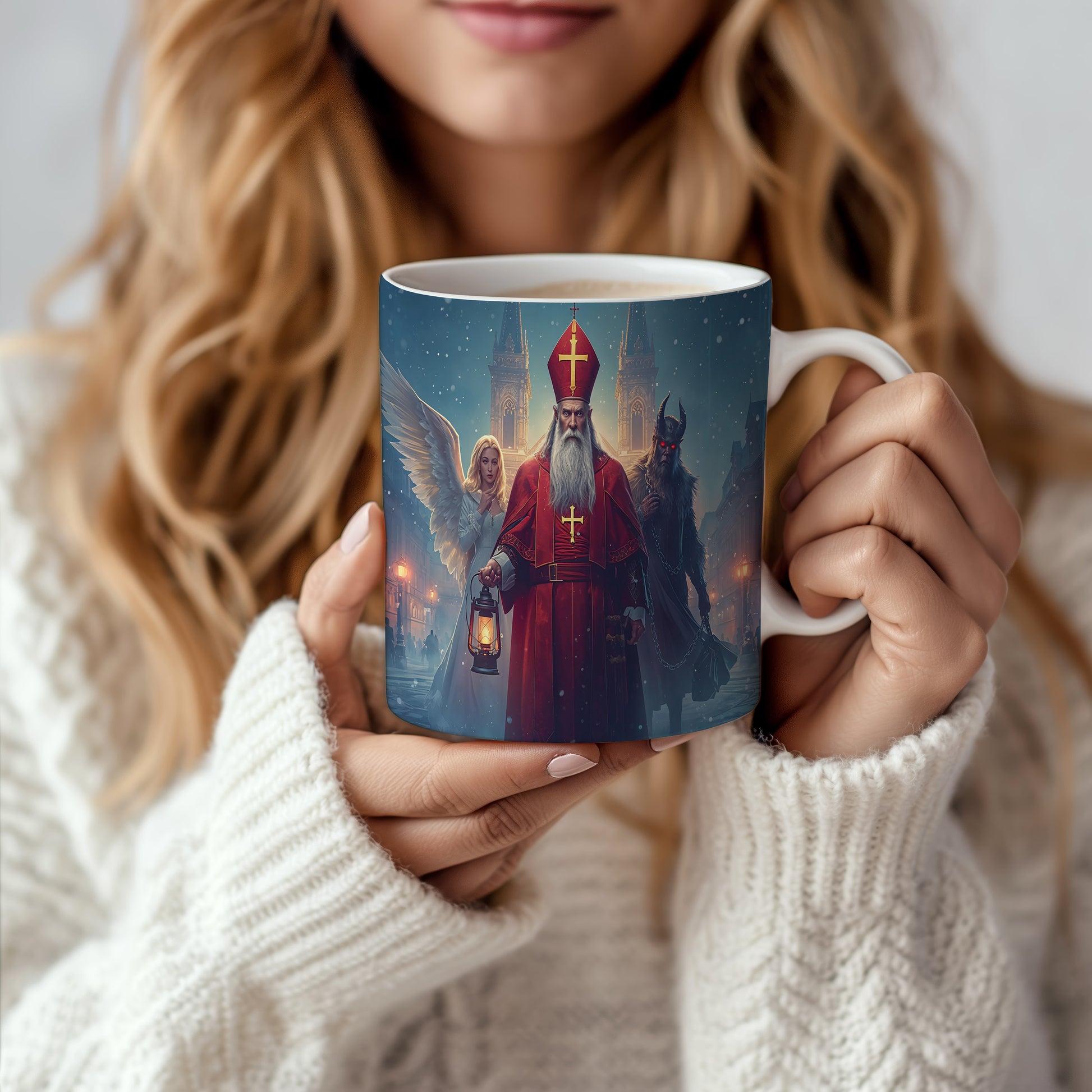 Tento hrnek přináší kouzlo zimní noci, kde Mikuláš v červeném rouchu, čert s planoucíma očima a anděl s jemnými křídly stojí před osvětleným kostelem. Hrnek 330ml – vhodný do myčky i mikrovlnky.
