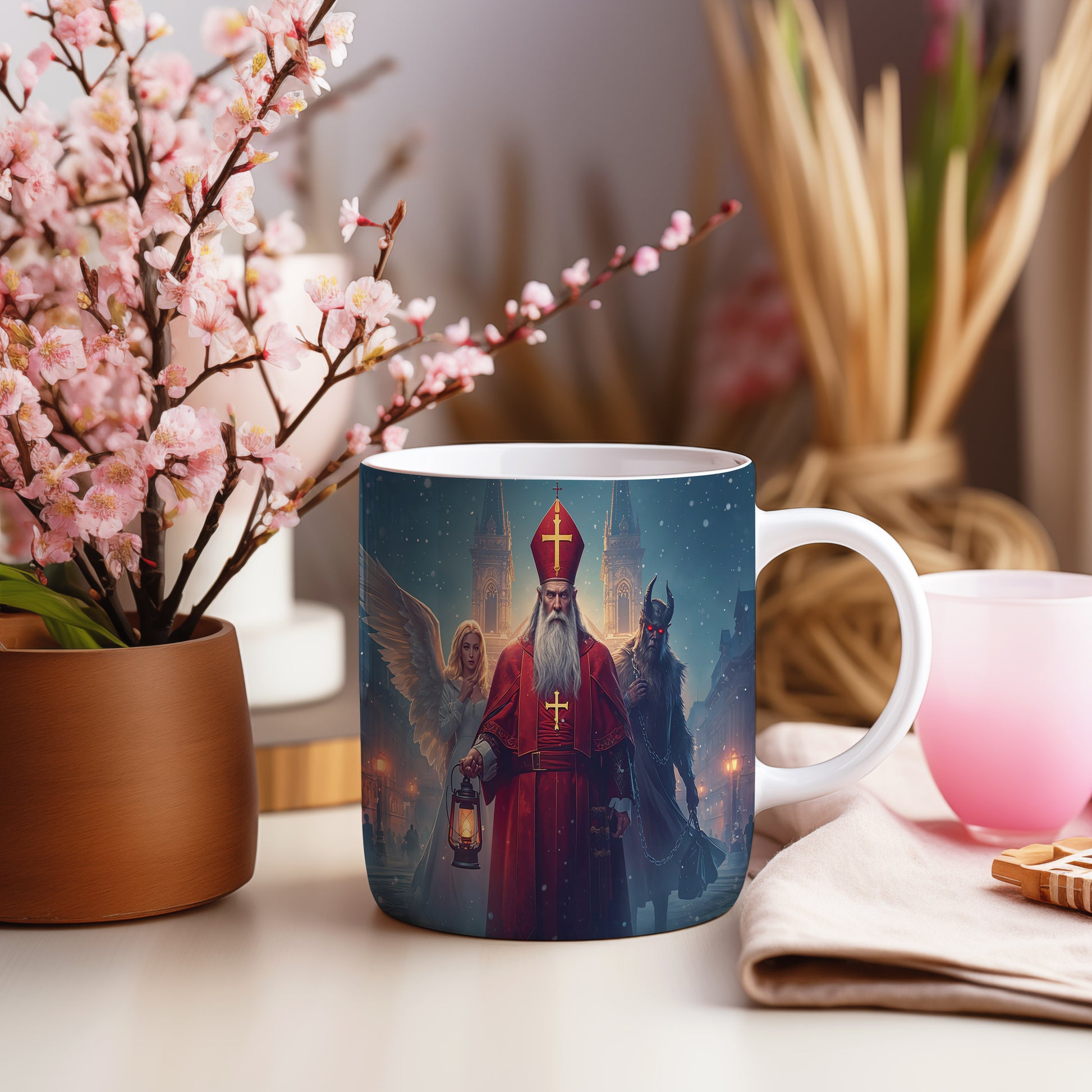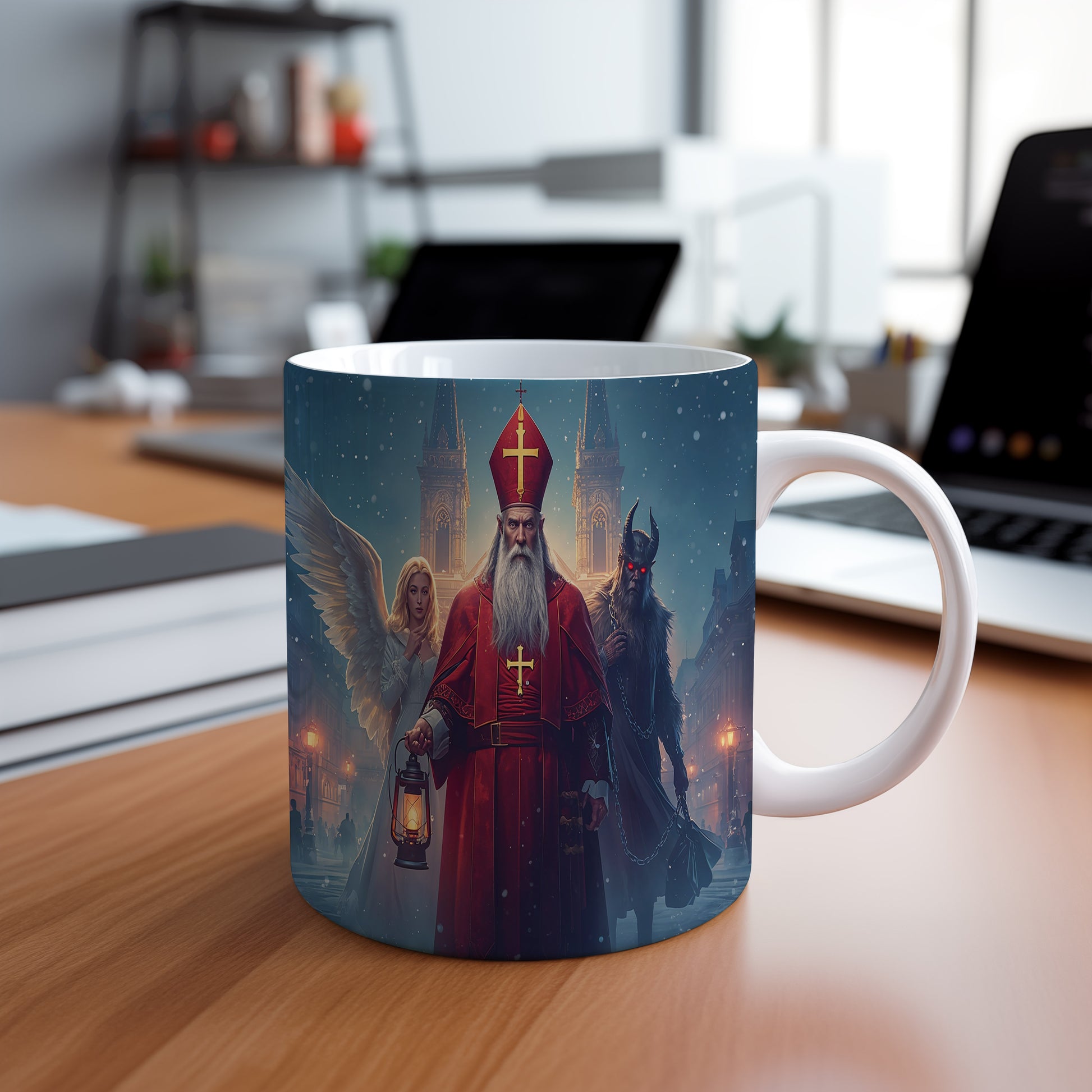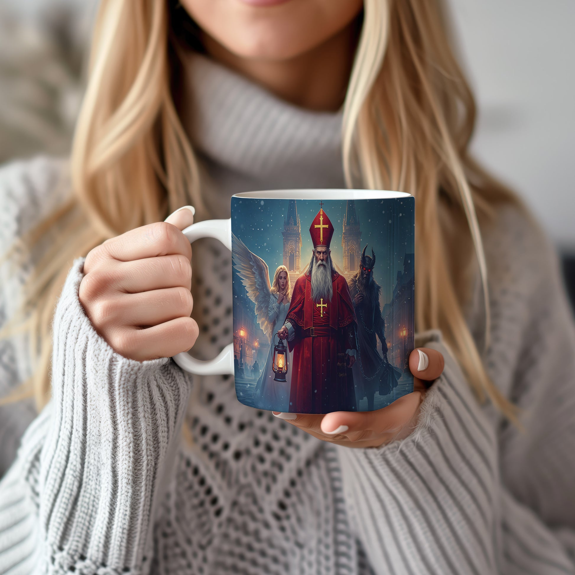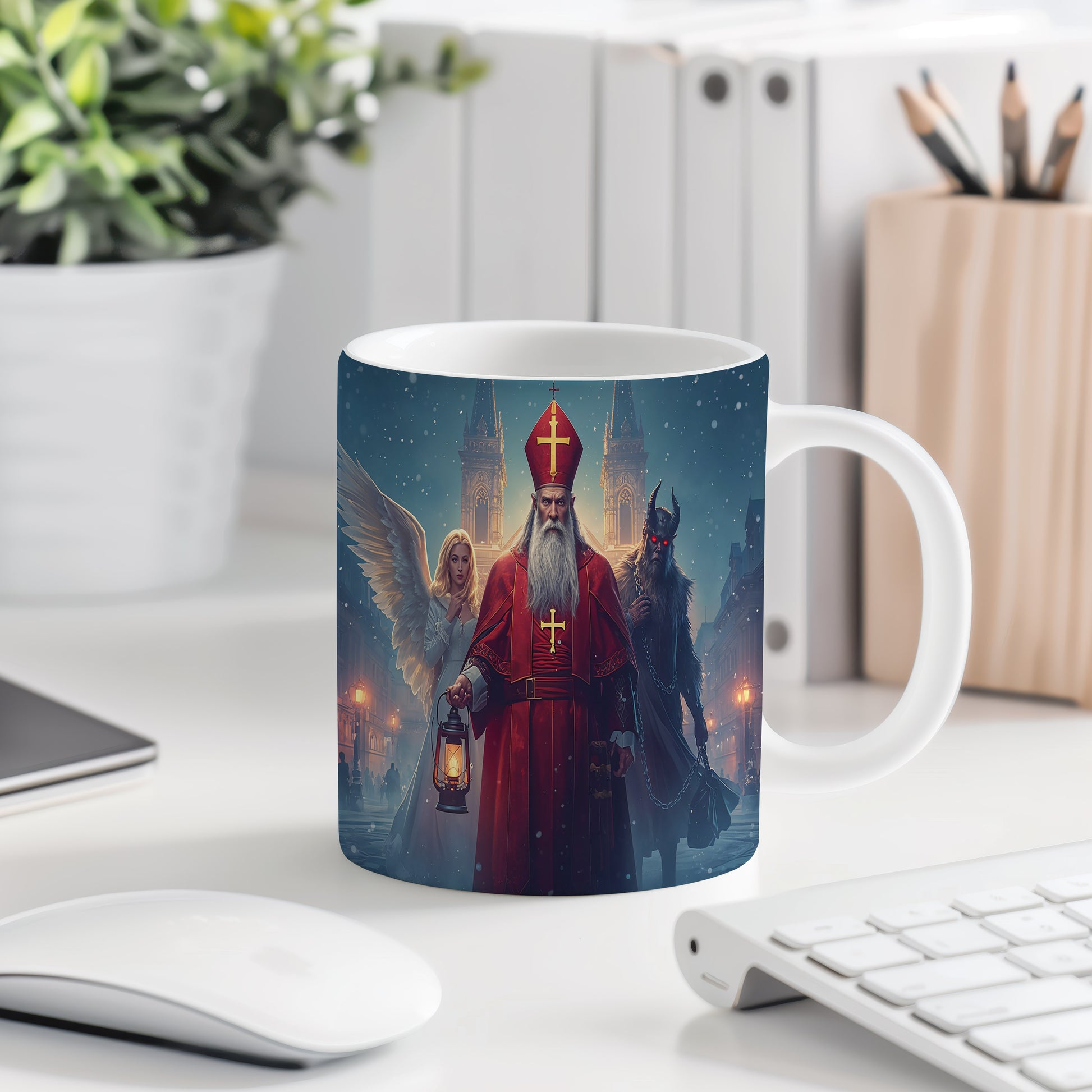 Tento hrnek přináší kouzlo zimní noci, kde Mikuláš v červeném rouchu, čert s planoucíma očima a anděl s jemnými křídly stojí před osvětleným kostelem. Hrnek 330ml – vhodný do myčky i mikrovlnky.
