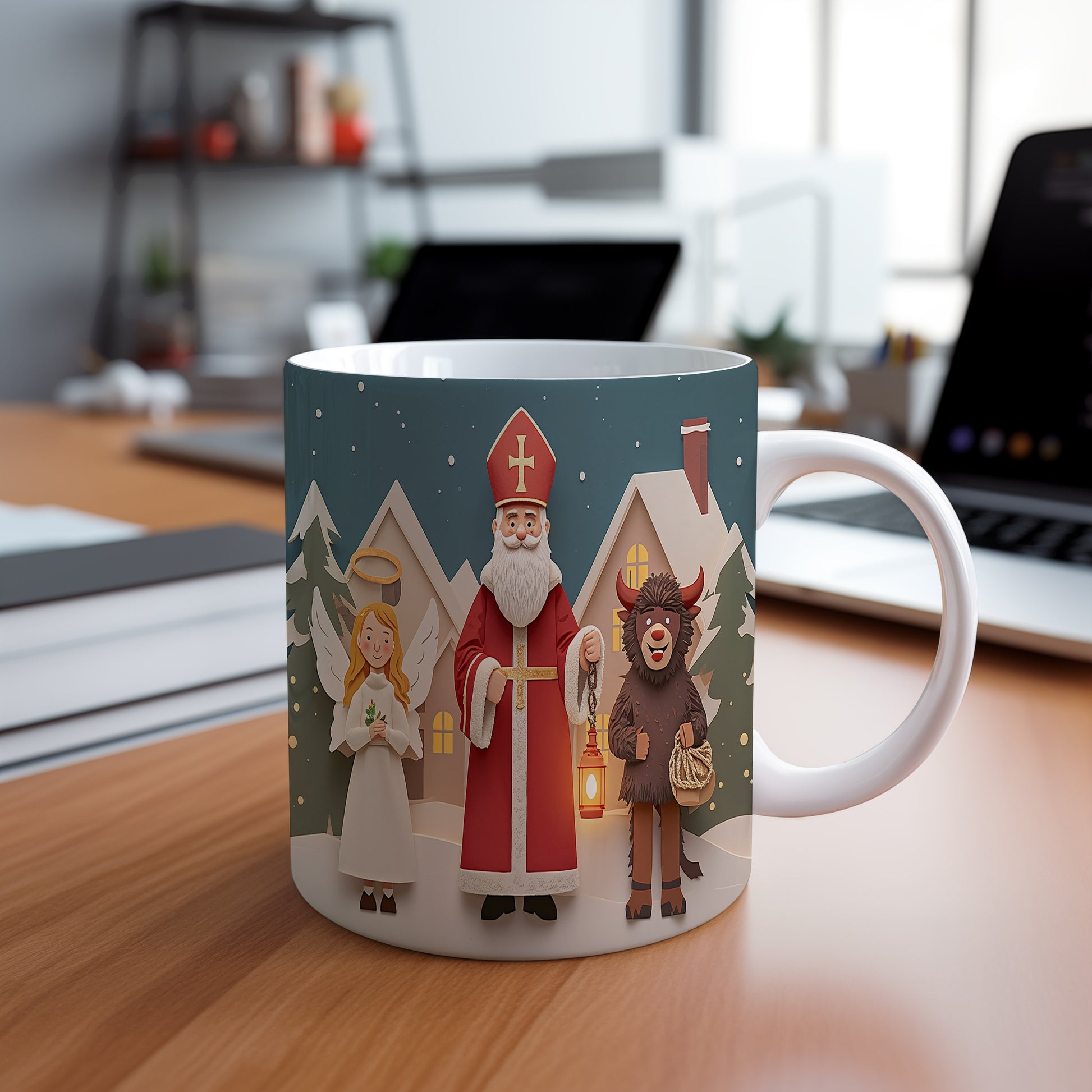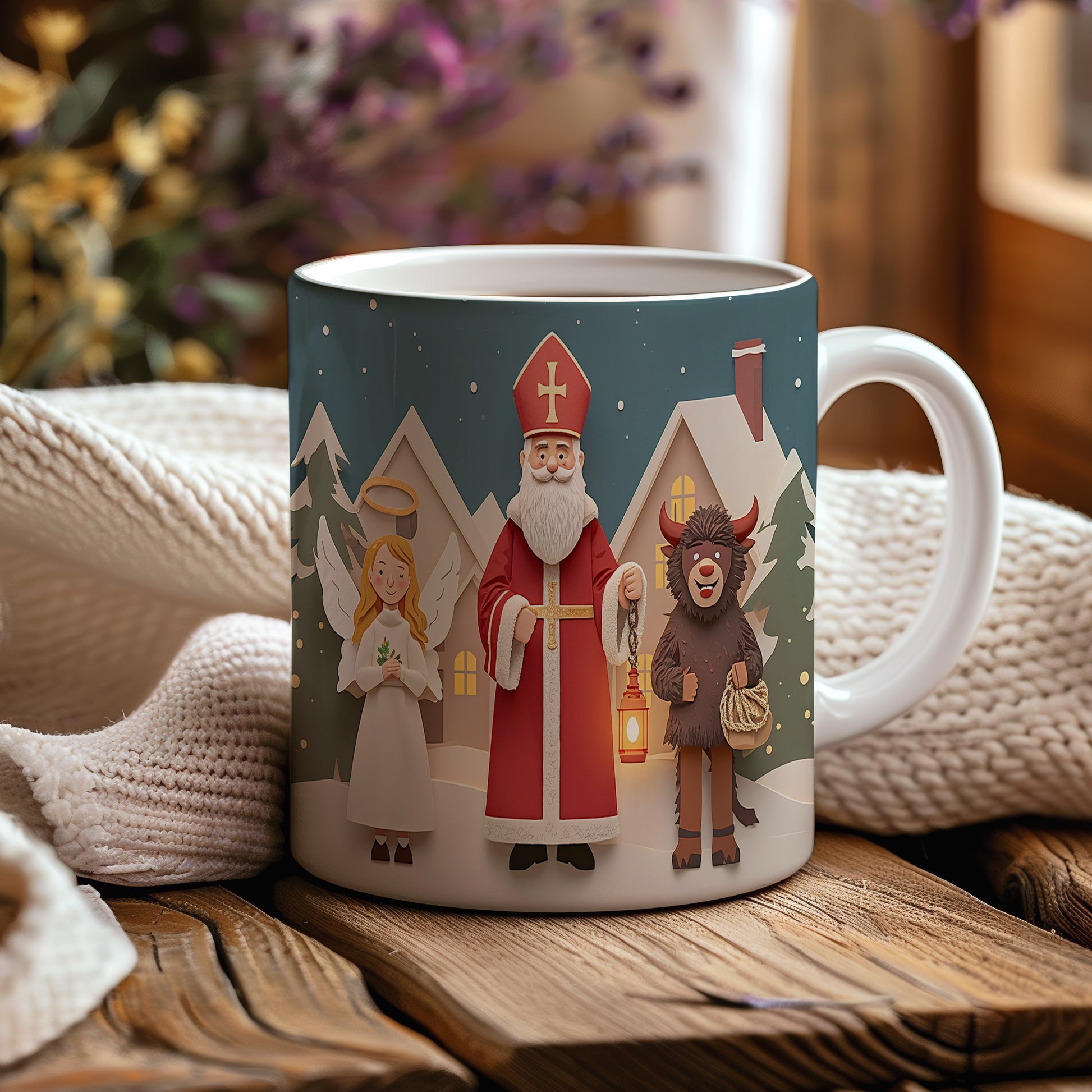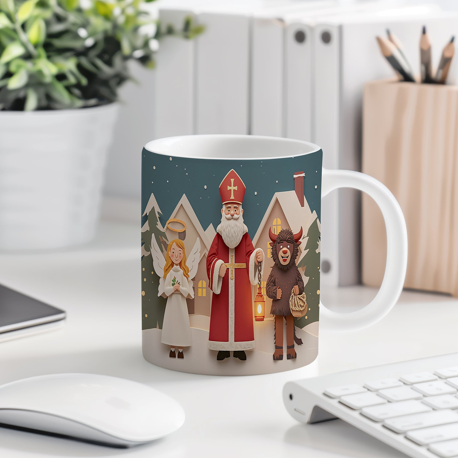 Hrnek s motivem Mikuláše, čerta a anděla – kouzelná zimní vesnička