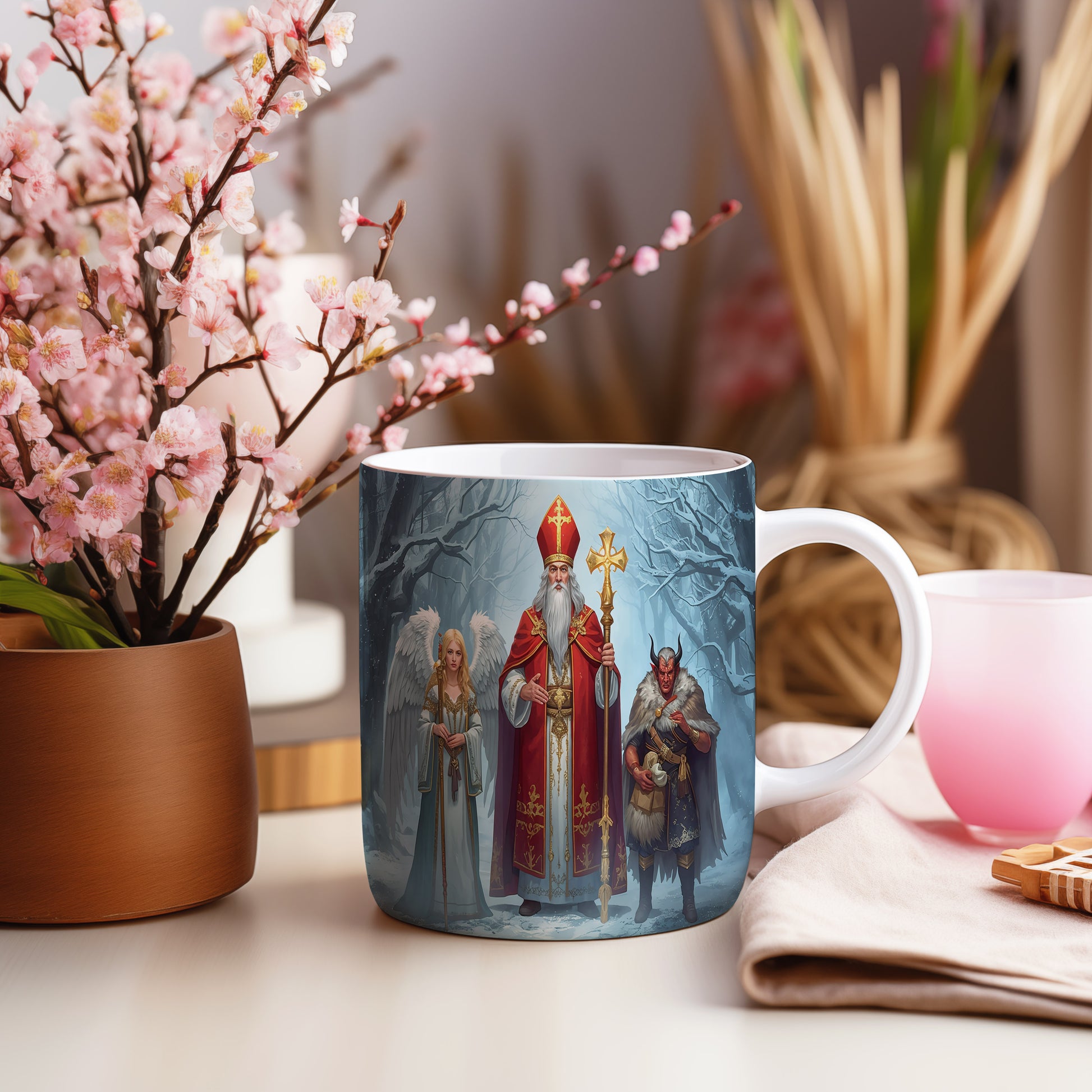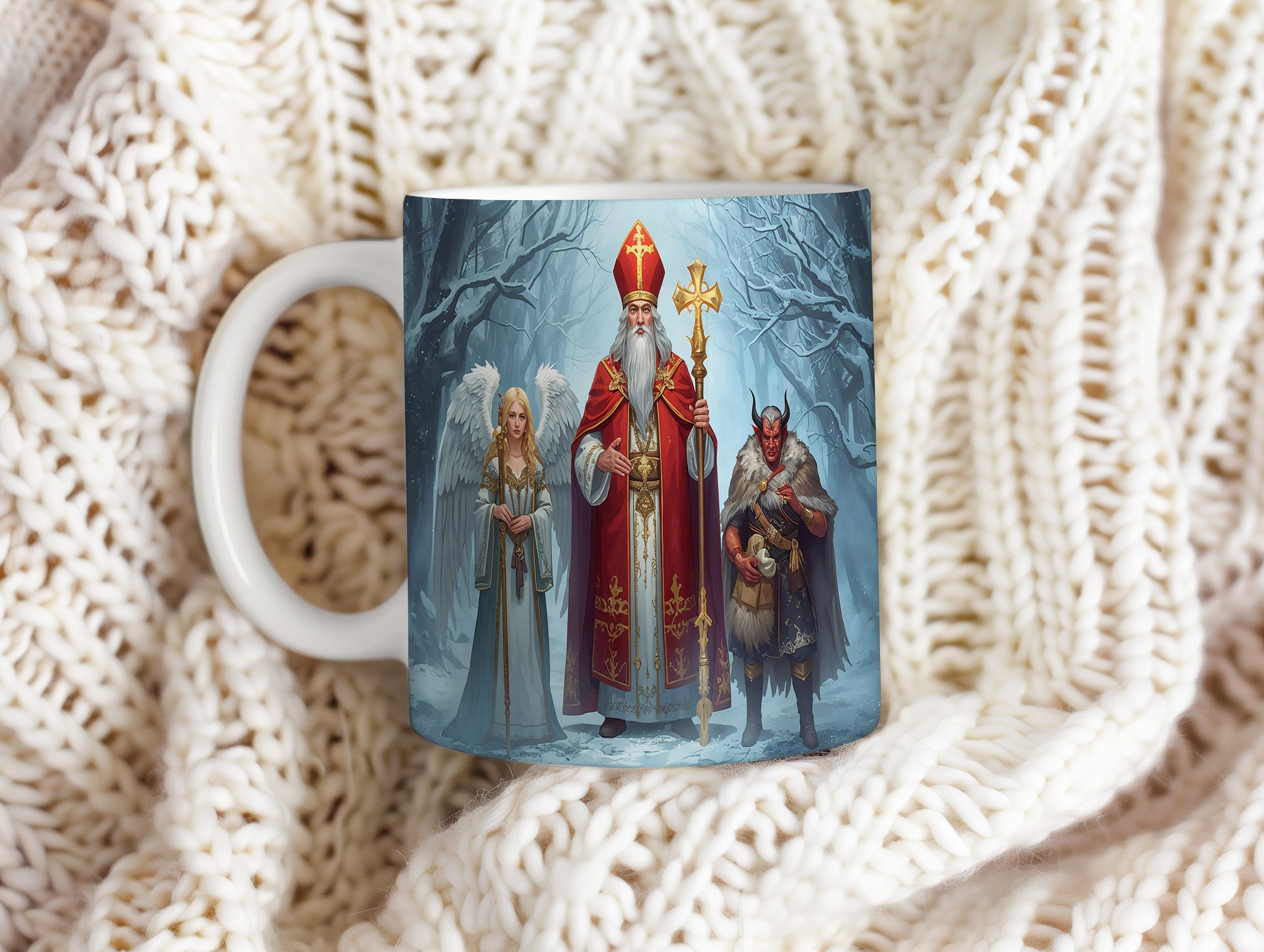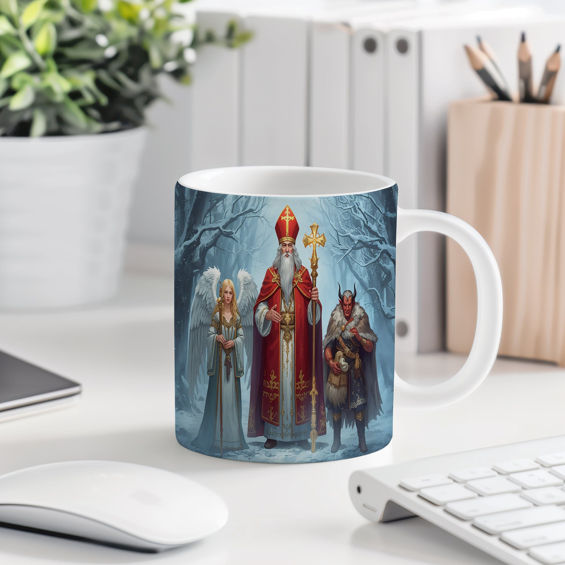 Hrnek s motivem Mikuláše, čerta a anděla – kouzelný zimní les