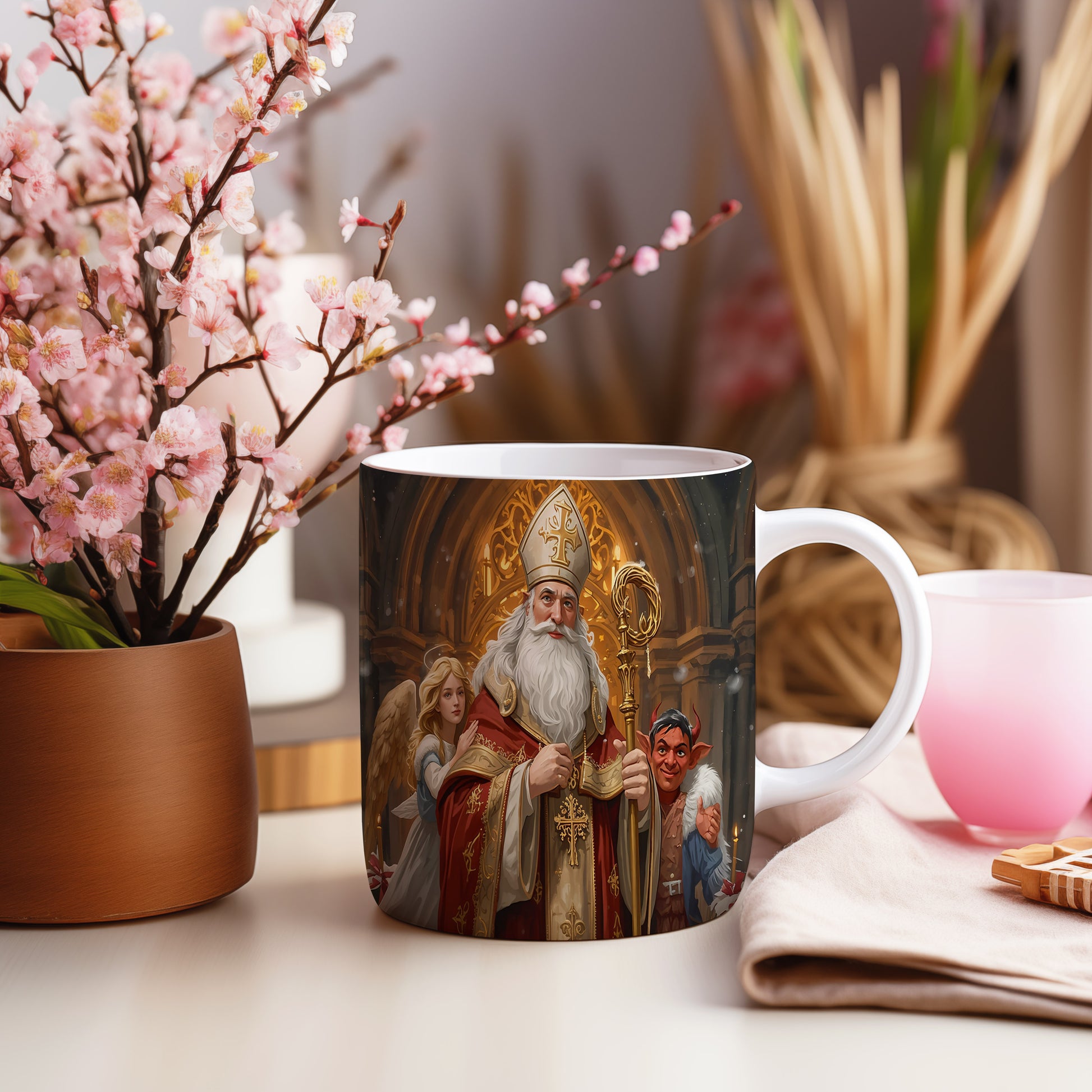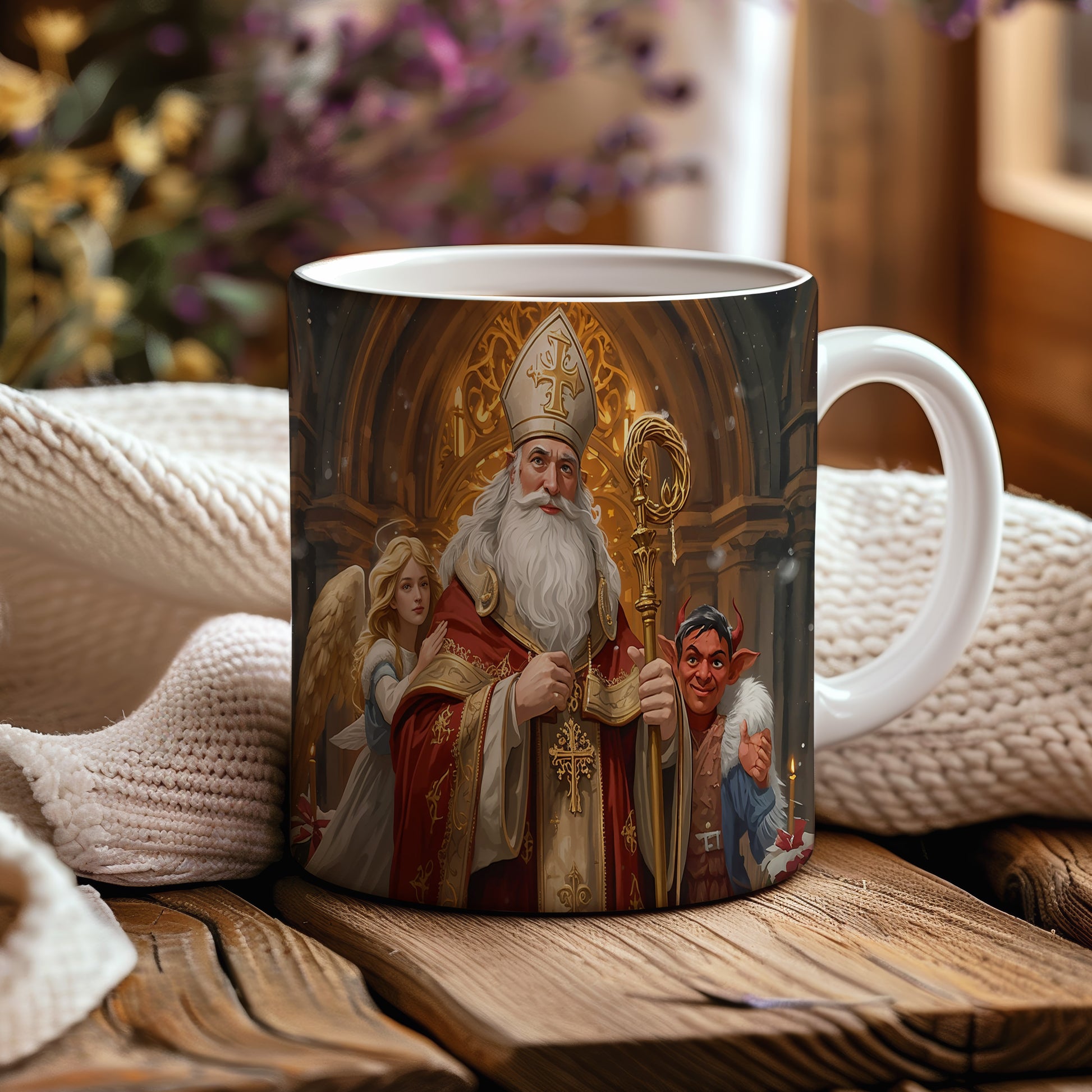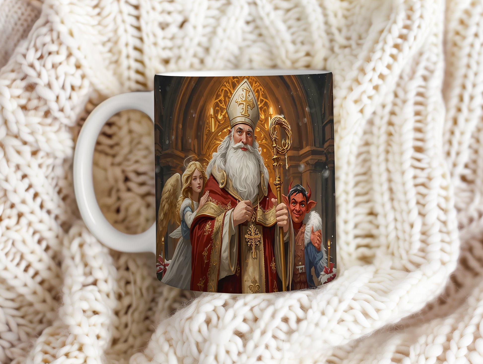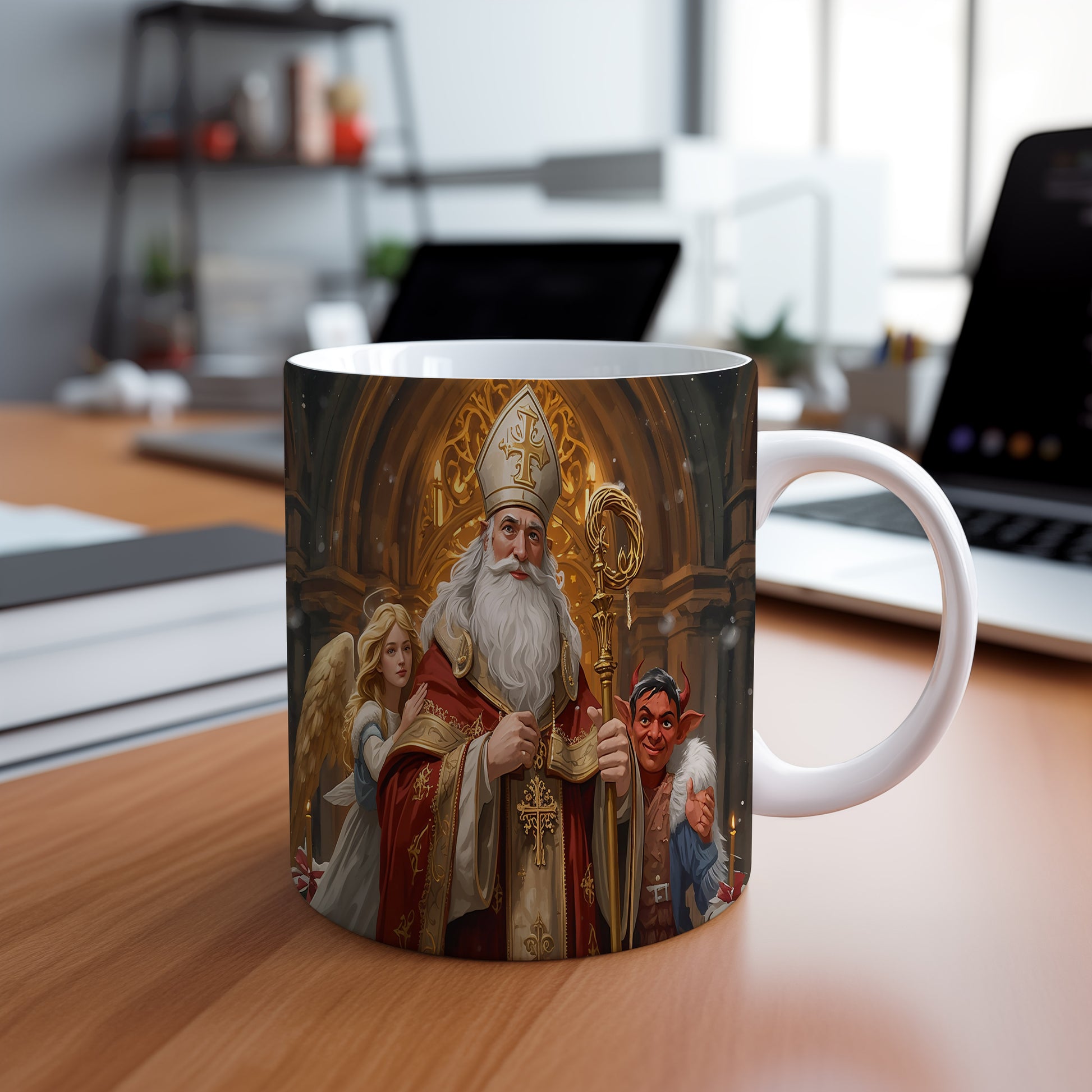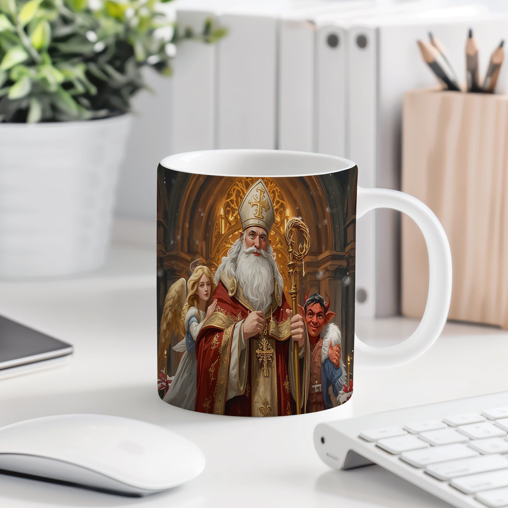 Elegantní design s Mikulášem, čertem a andělem v gotické katedrále s teplými zlatavými tóny a sváteční atmosférou. Hrnek 330ml – vhodný do myčky i mikrovlnky.