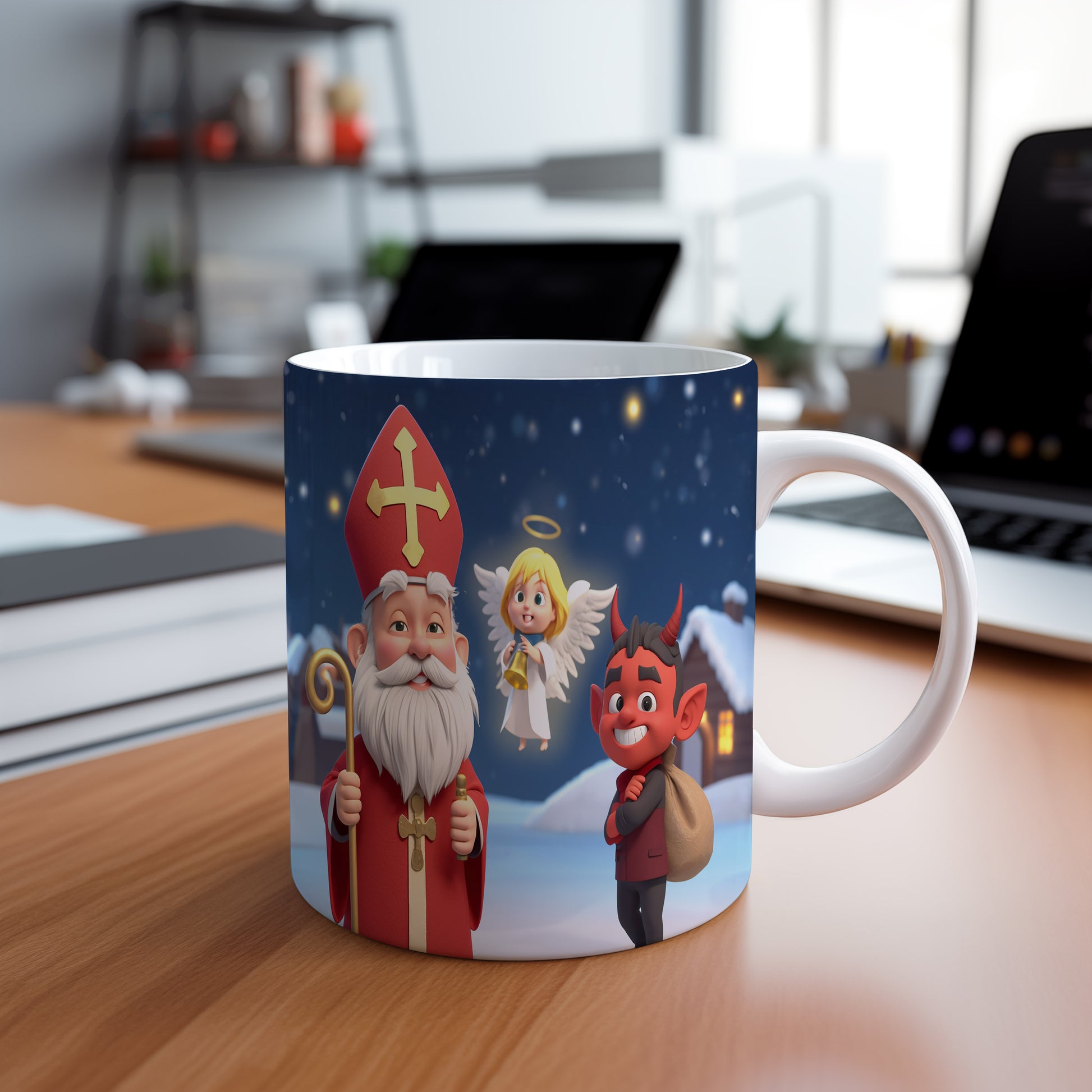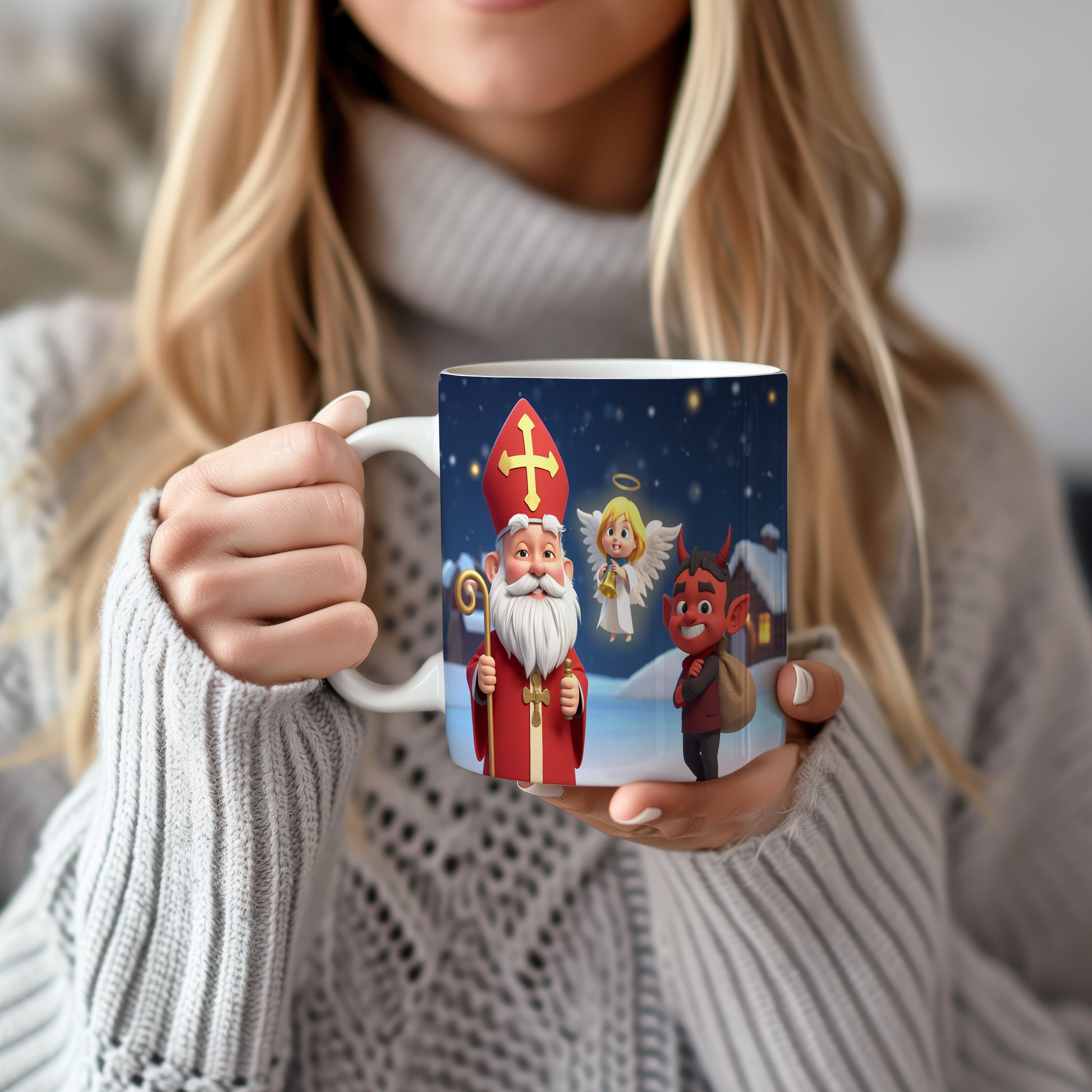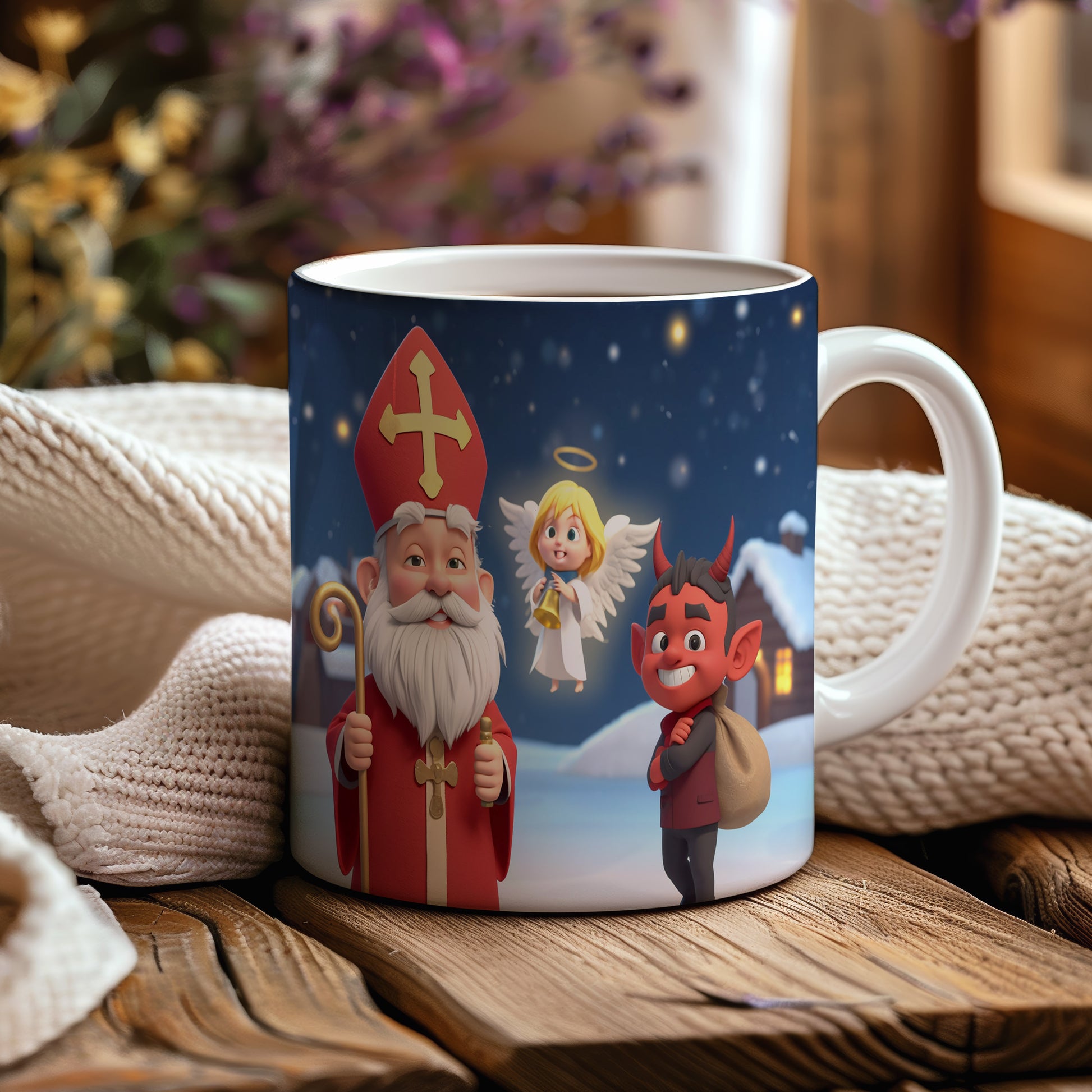Pestrobarevná scéna Mikuláše, čerta a anděla na pozadí zasněžených hor vytváří kouzelnou atmosféru zimních svátků. Hrnek 330ml – vhodný do myčky i mikrovlnky.