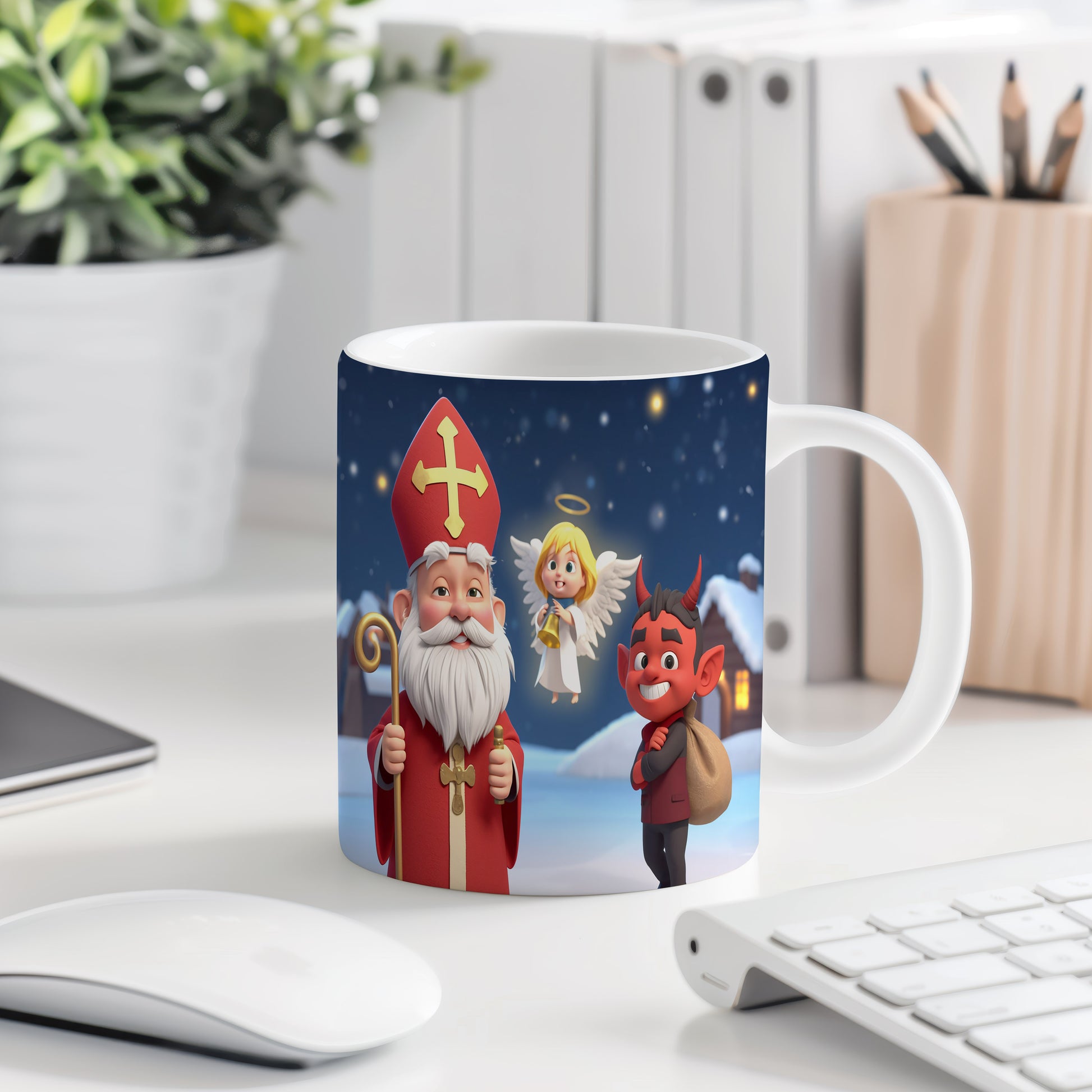 Hrnek s motivem Mikuláše, čerta a anděla – slavnostní zimní krajina