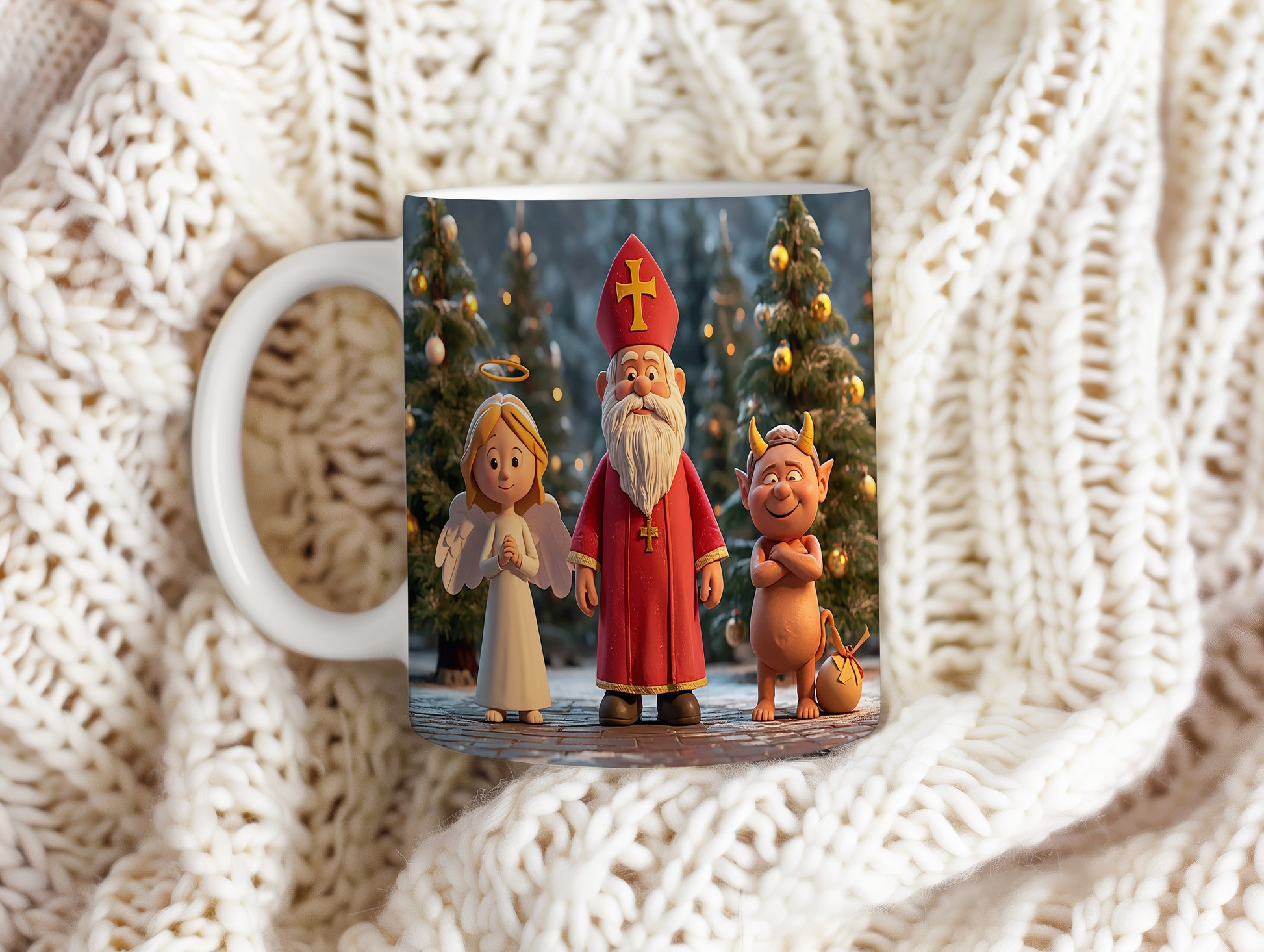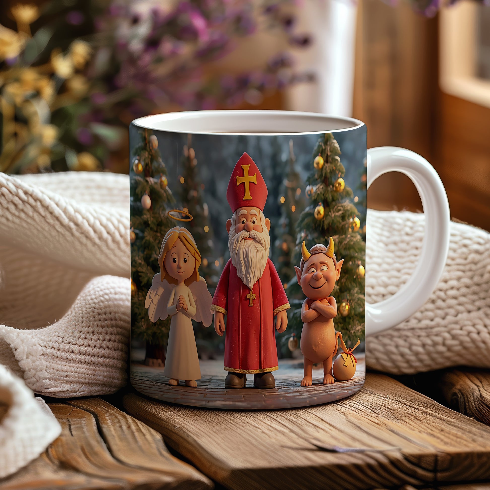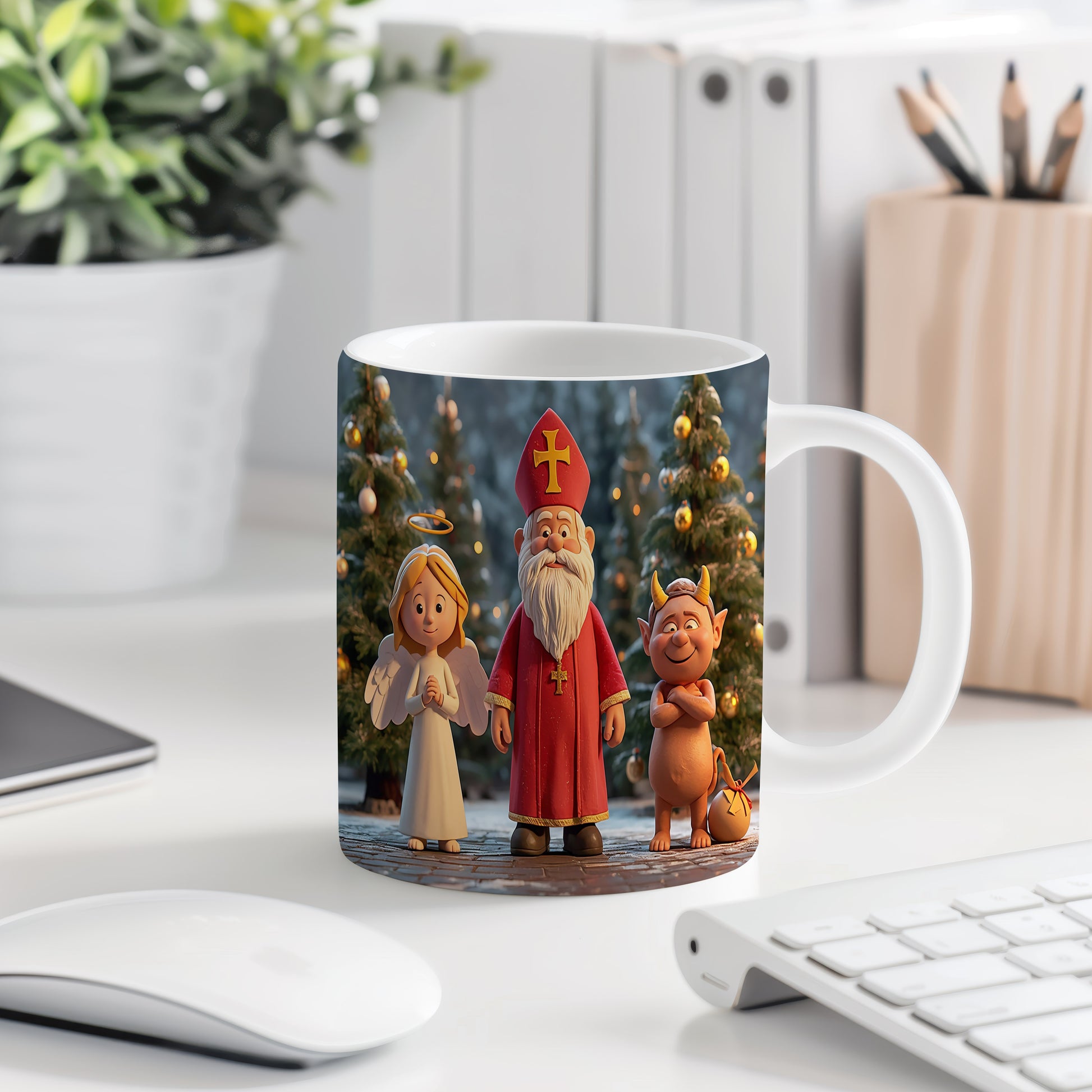 Hrnek s motivem Mikuláše, čerta a anděla – slavnostní zimní noc