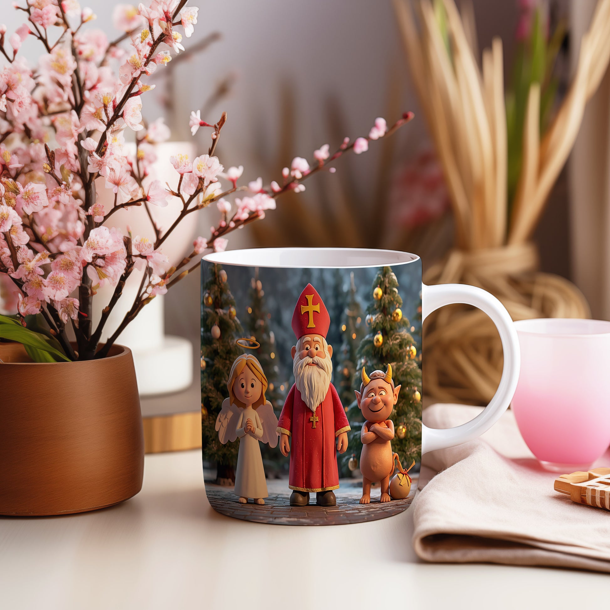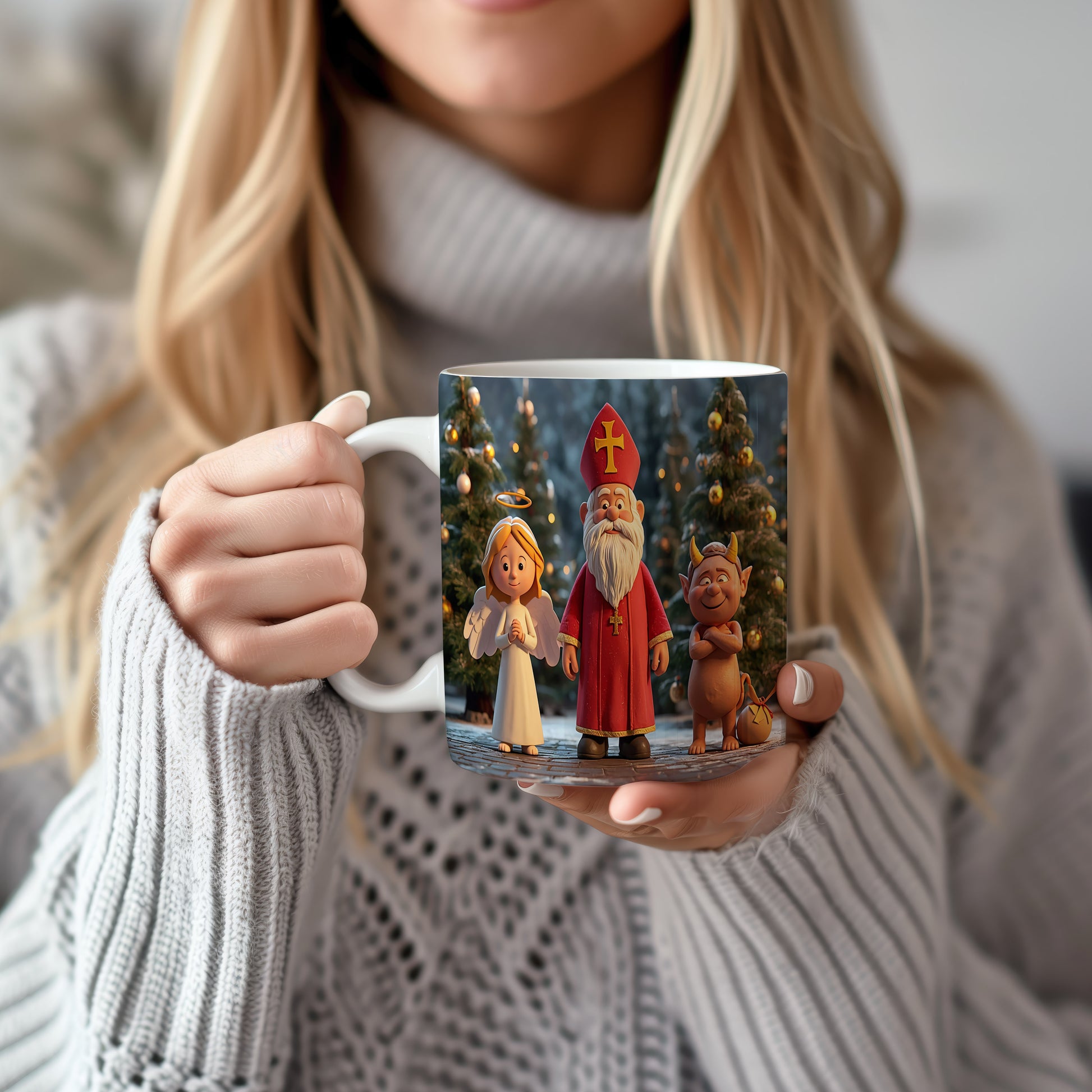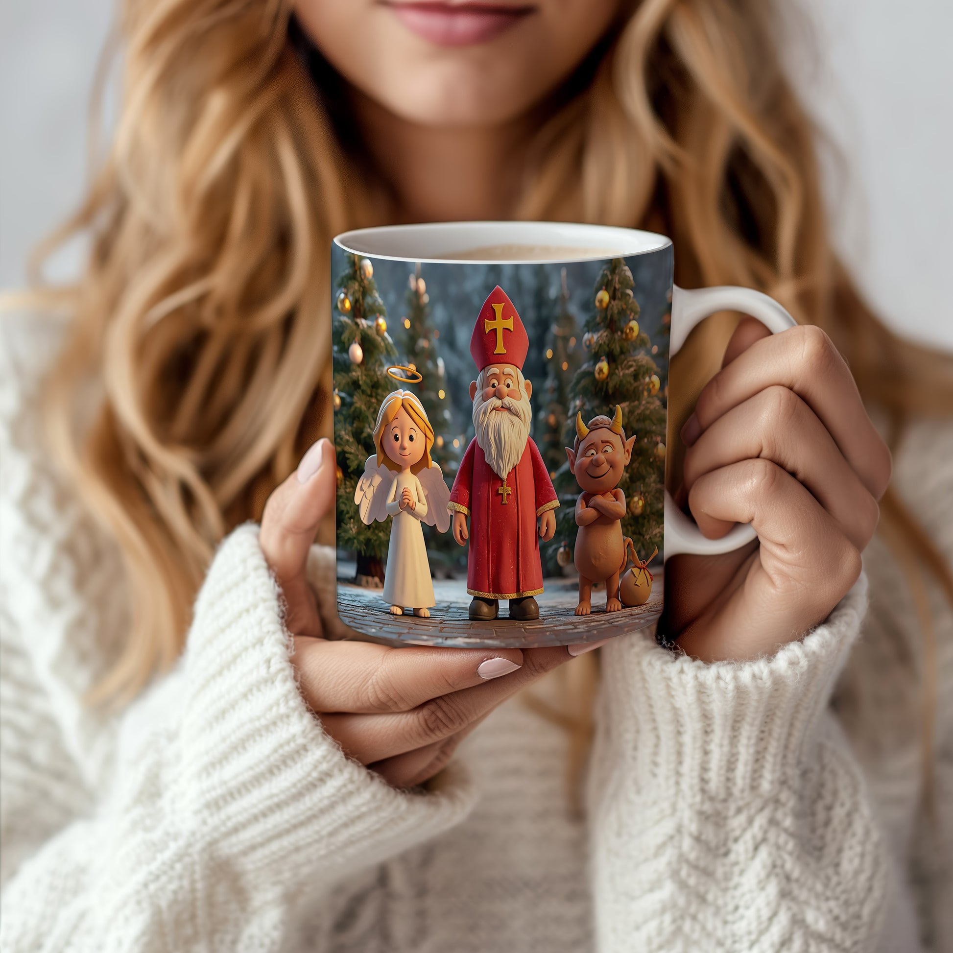 Hrnek s motivem Mikuláše, čerta a anděla – slavnostní zimní noc