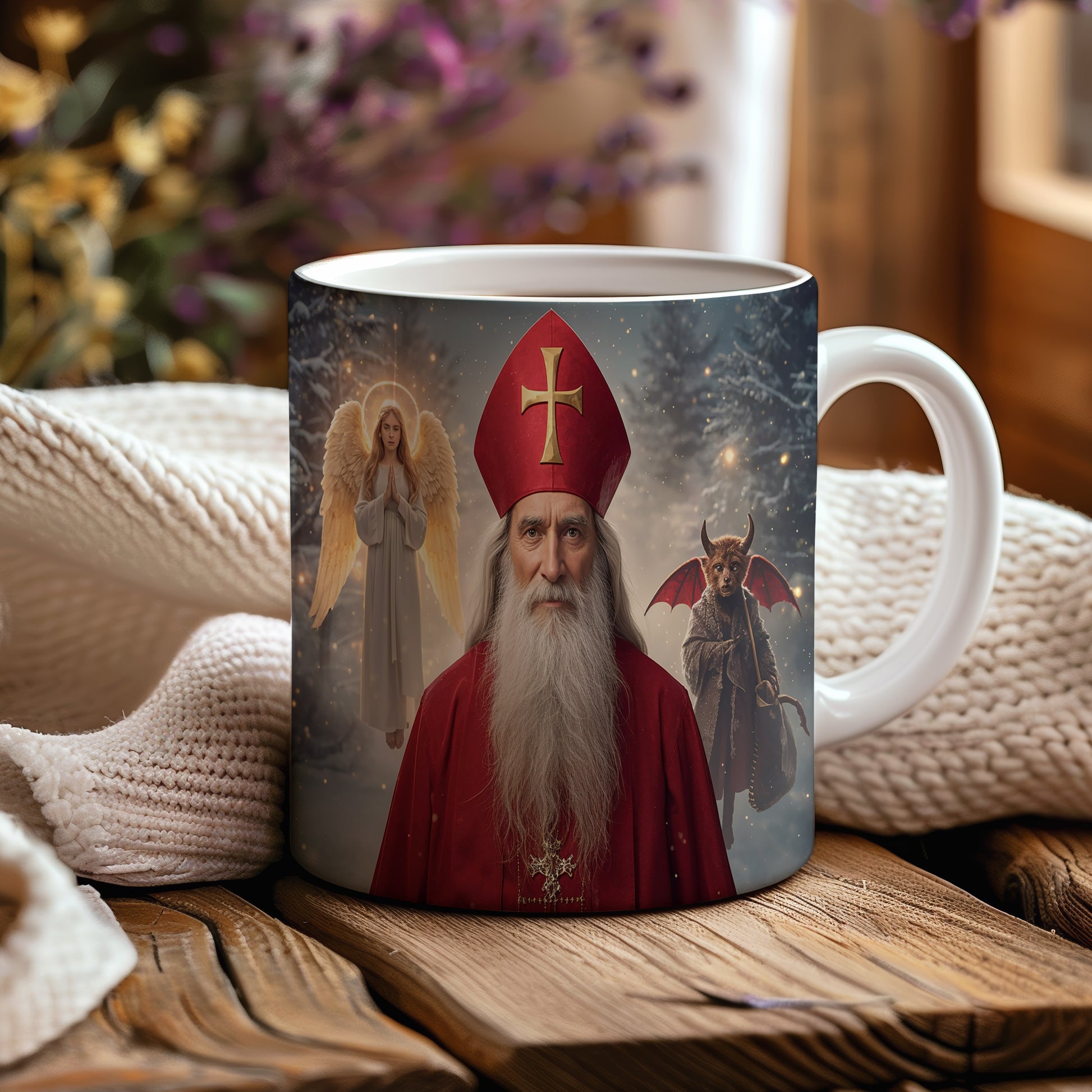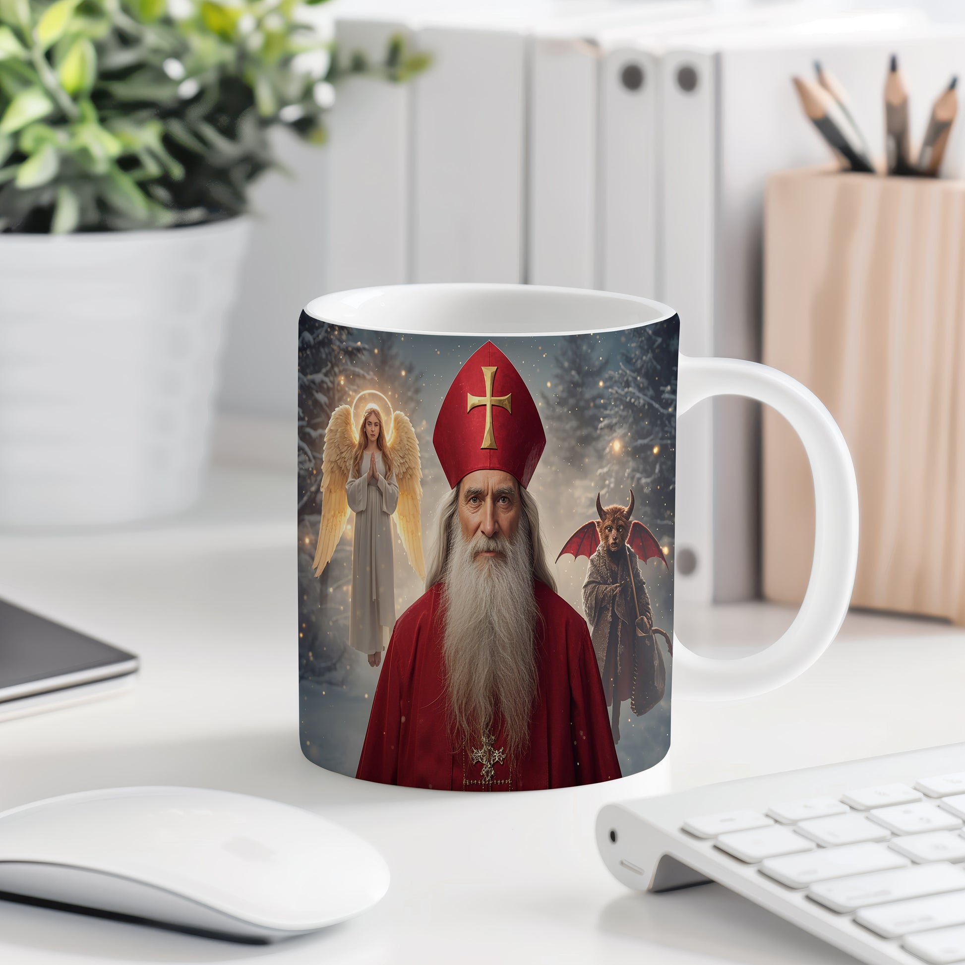Hrnek s motivem Mikuláše, čerta a anděla – tajemný zimní večer