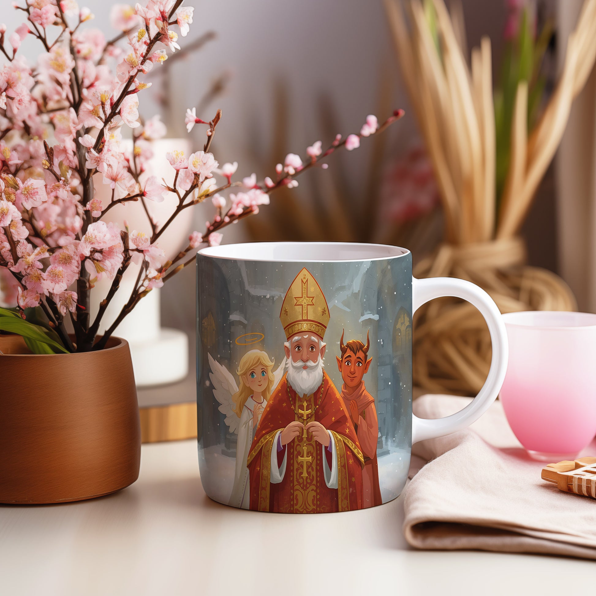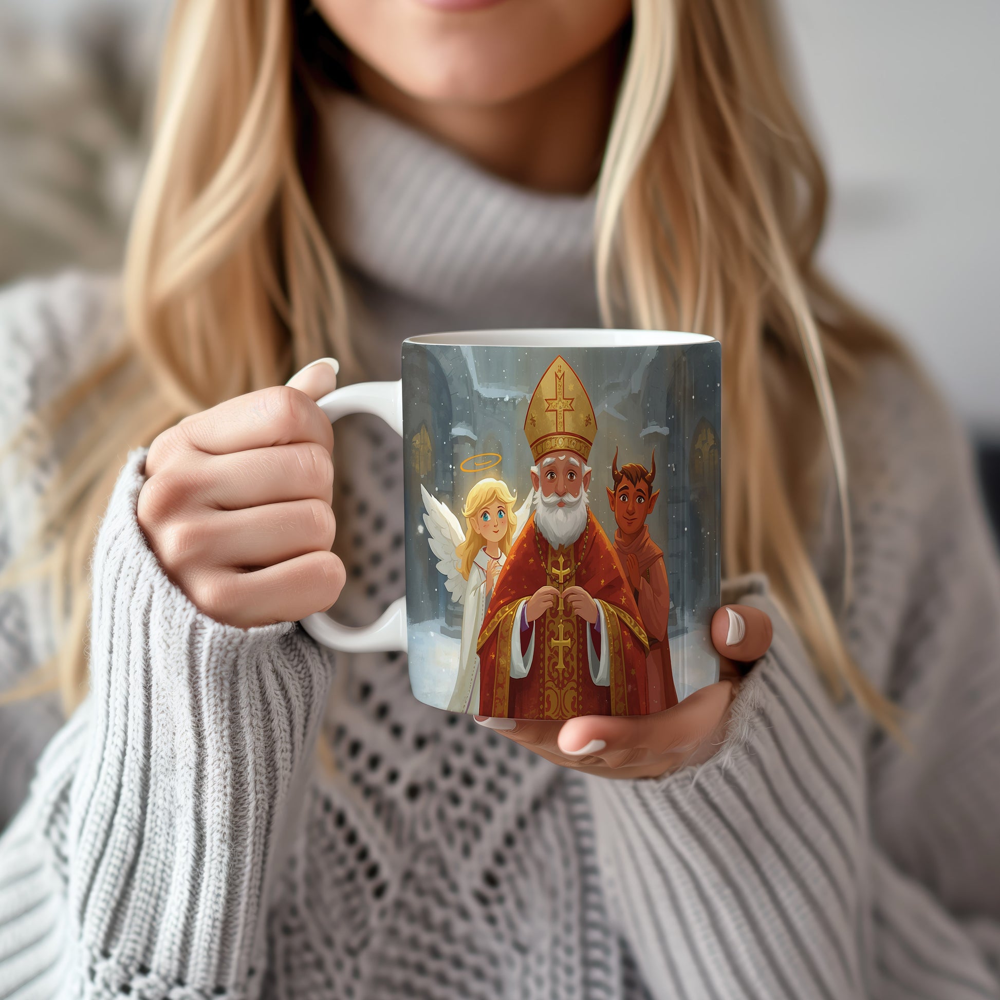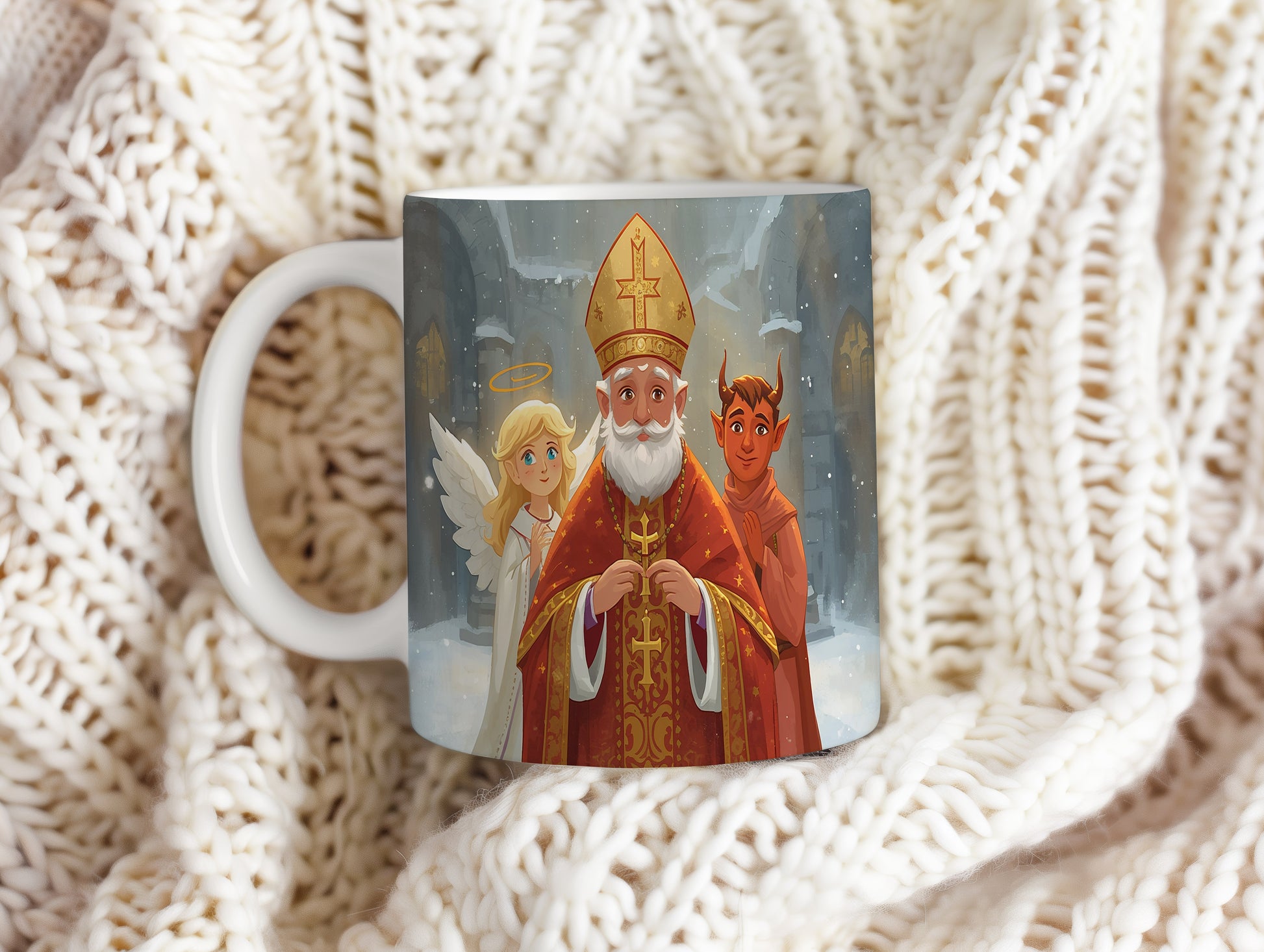 Hrnek s motivem Mikuláše, čerta a anděla – vánoční katedrála