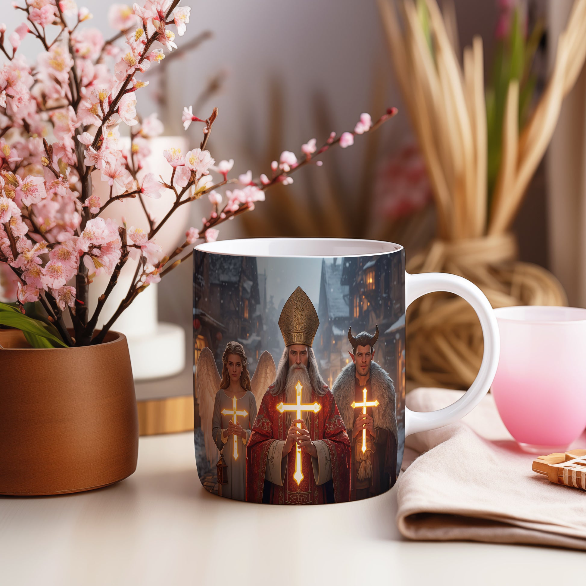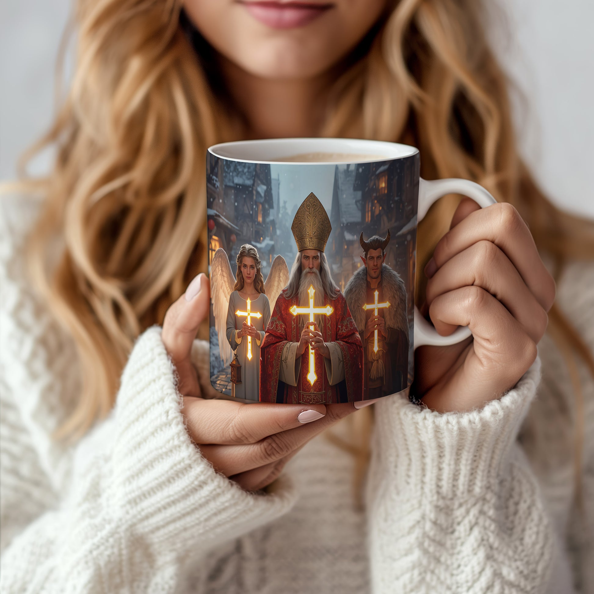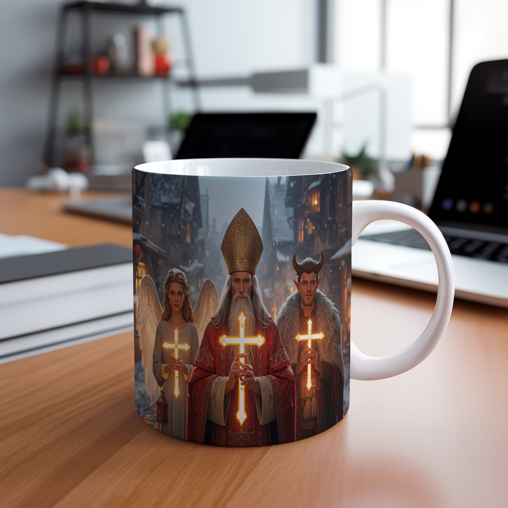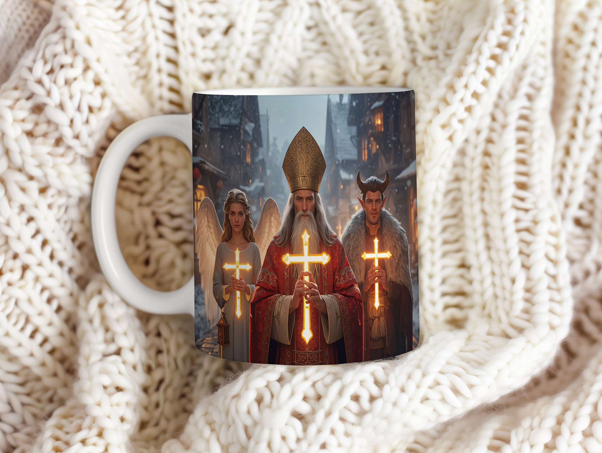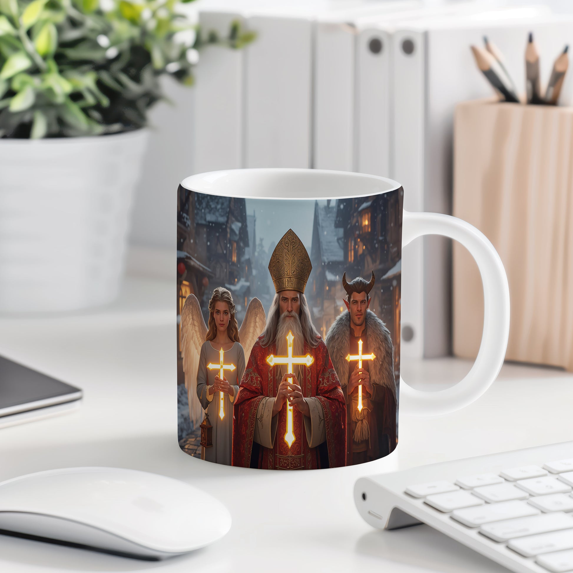 Hrnek s motivem Mikuláše, čerta a anděla – zářivá vesnička