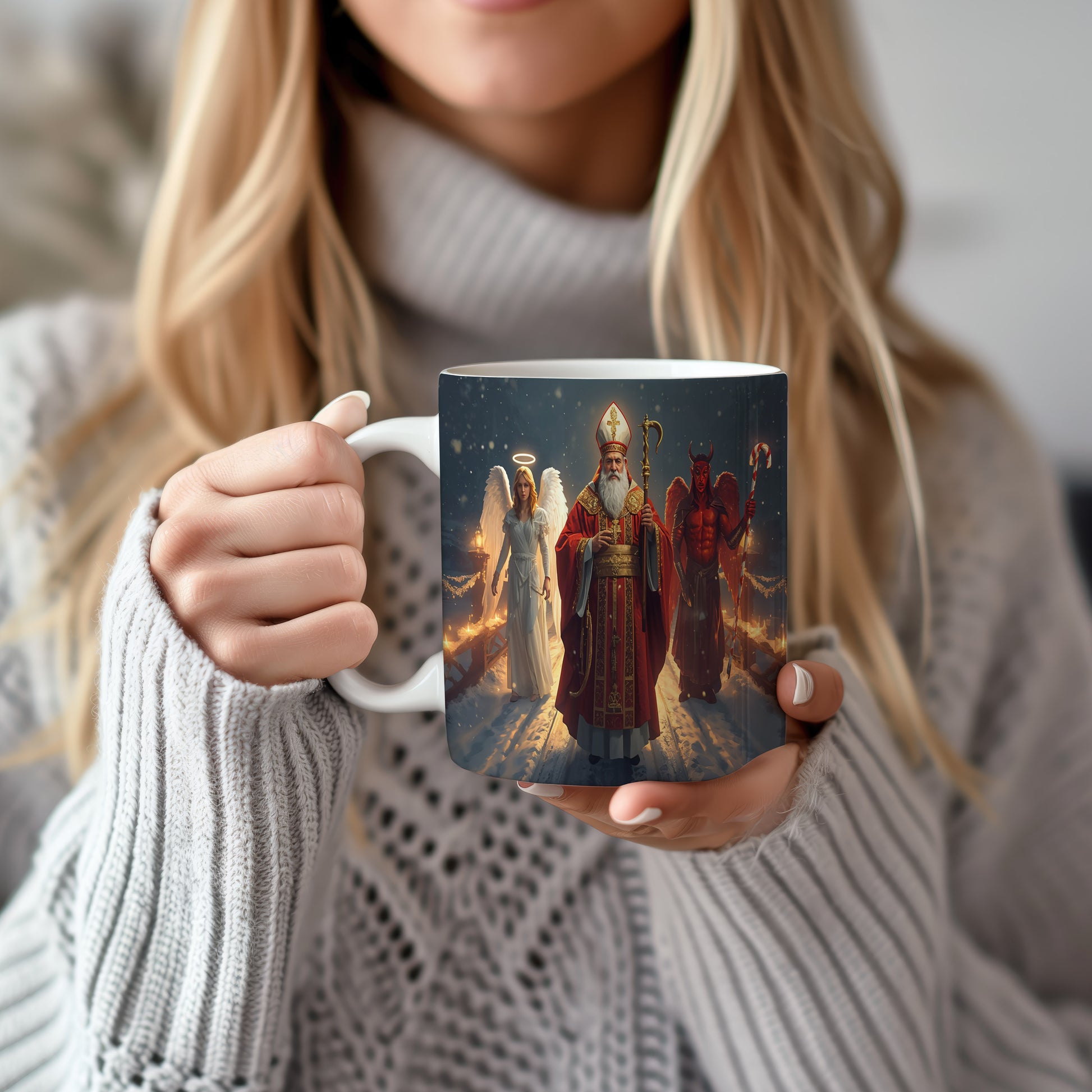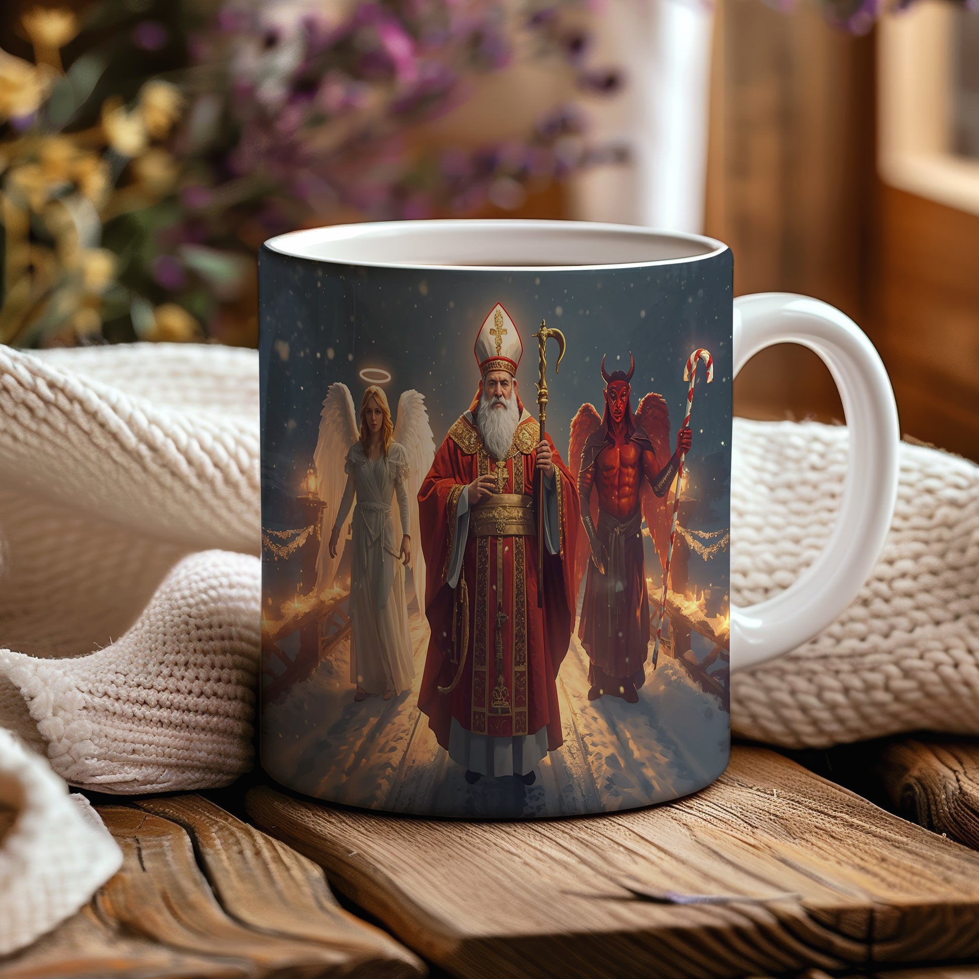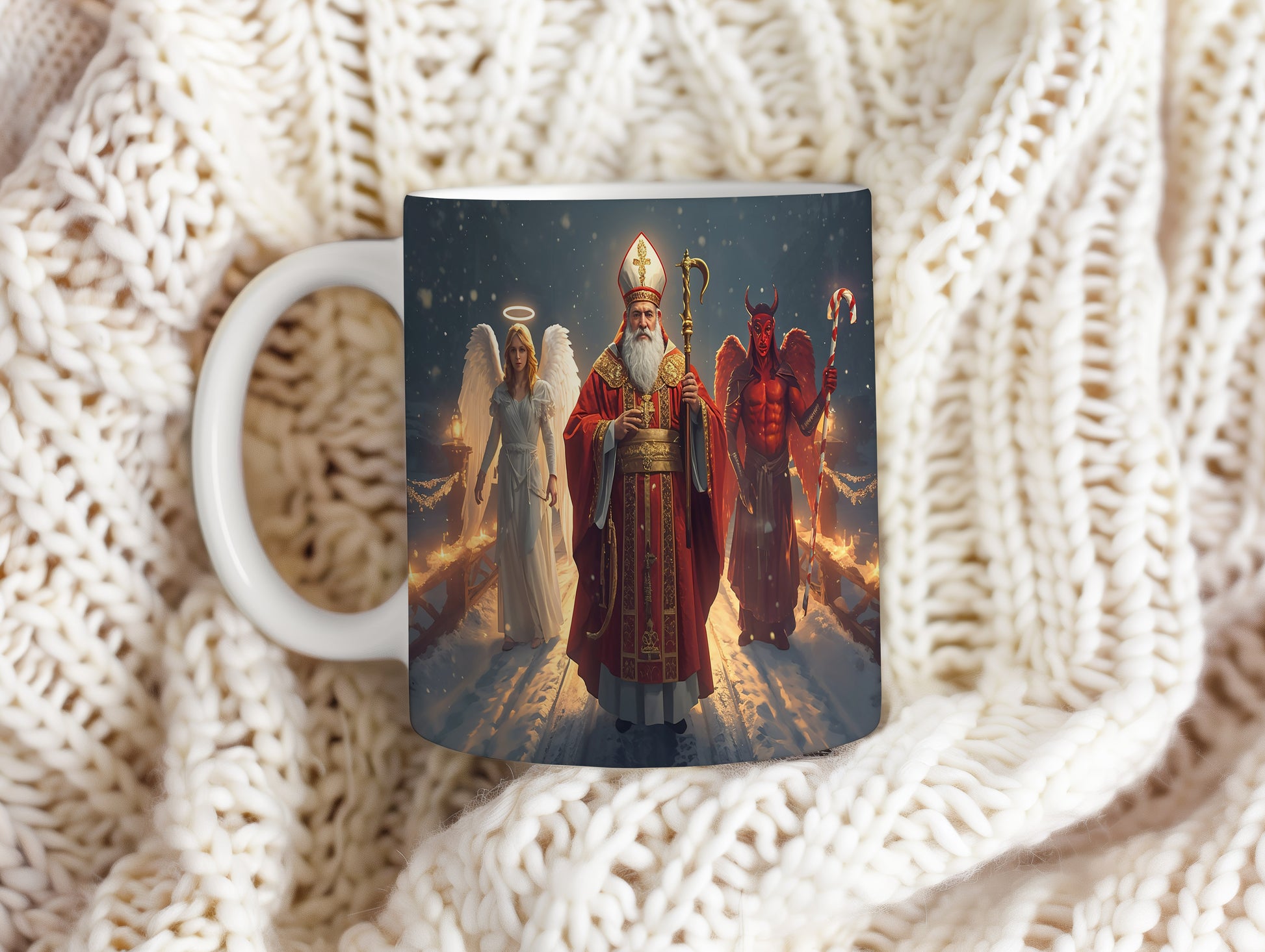 Hrnek s motivem Mikuláše, čerta a anděla – zimní hvězdná cesta