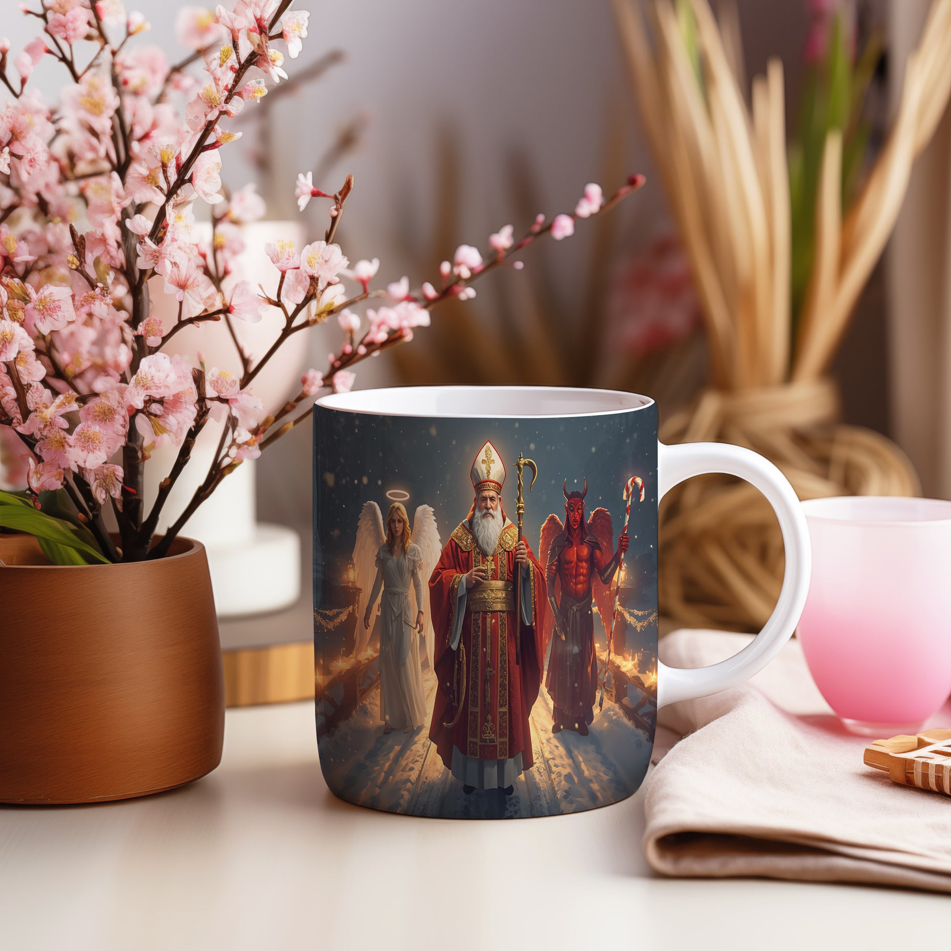 Na hrnku se Mikuláš, čert a anděl procházejí po zasněžené cestě pod hvězdnou oblohou. Atmosféra je plná klidu a kouzla zimní noci. Hrnek 330ml – vhodný do myčky i mikrovlnky.