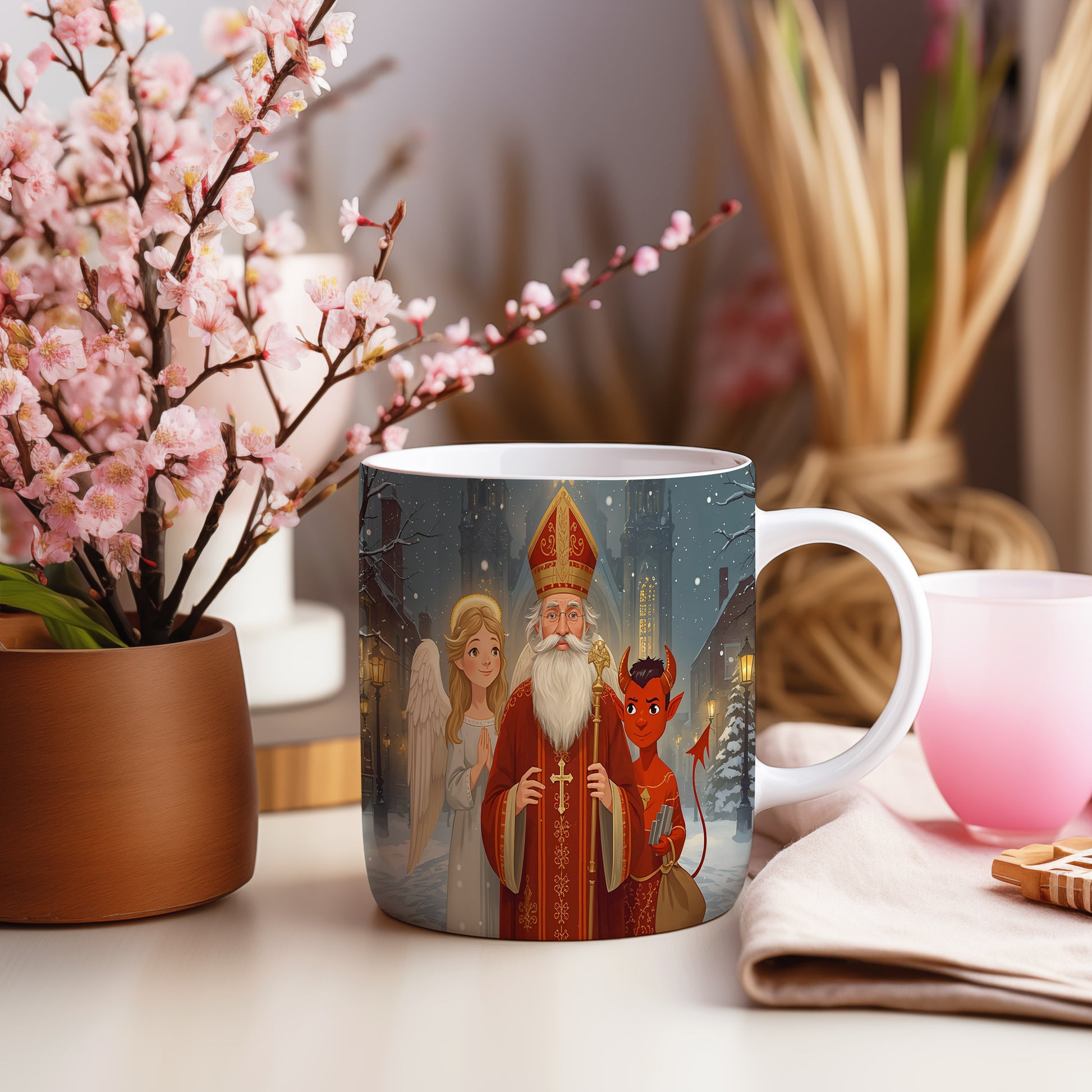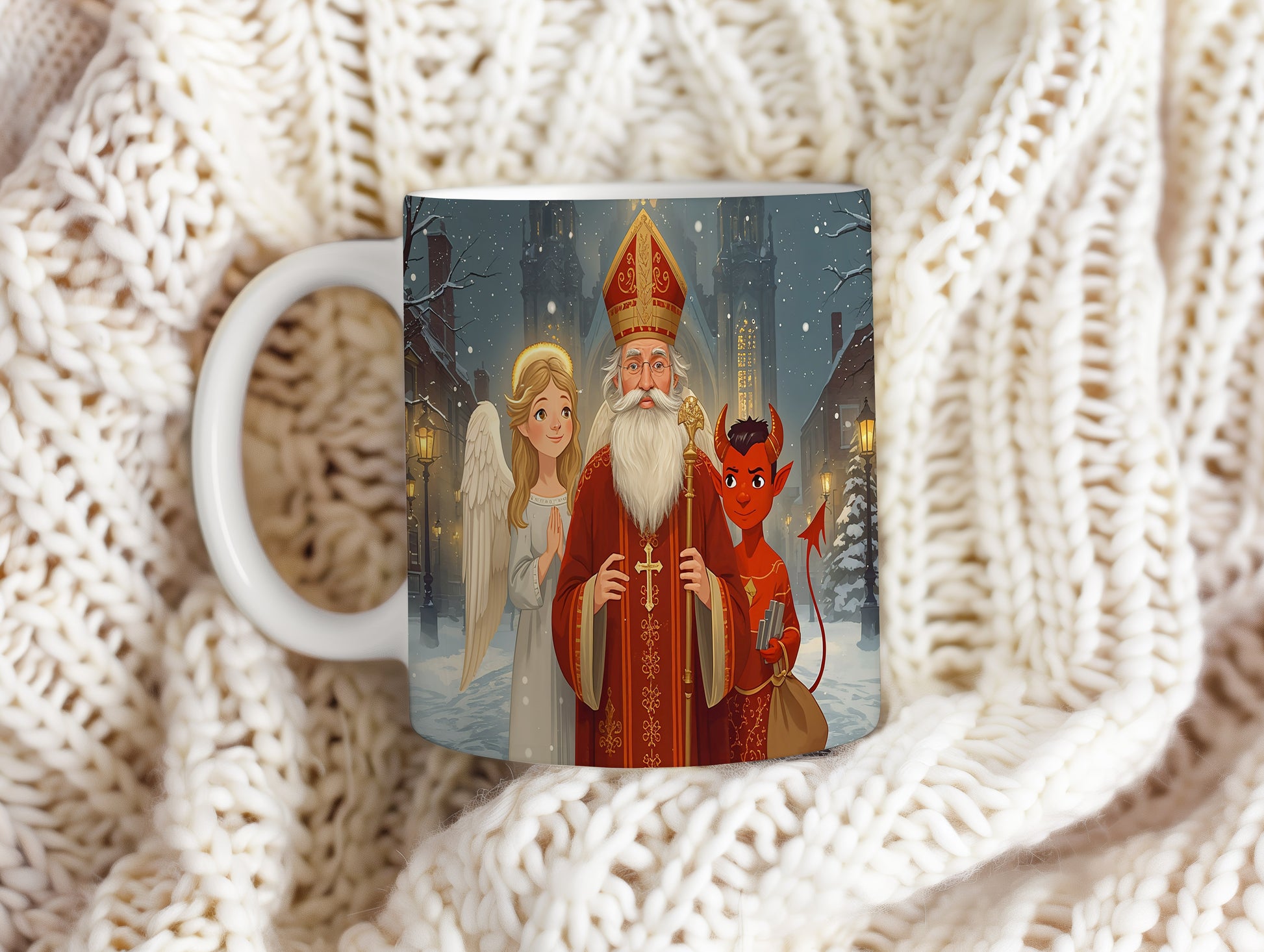 Hrnek s motivem Mikuláše, čerta a anděla – zimní kouzelný chrám