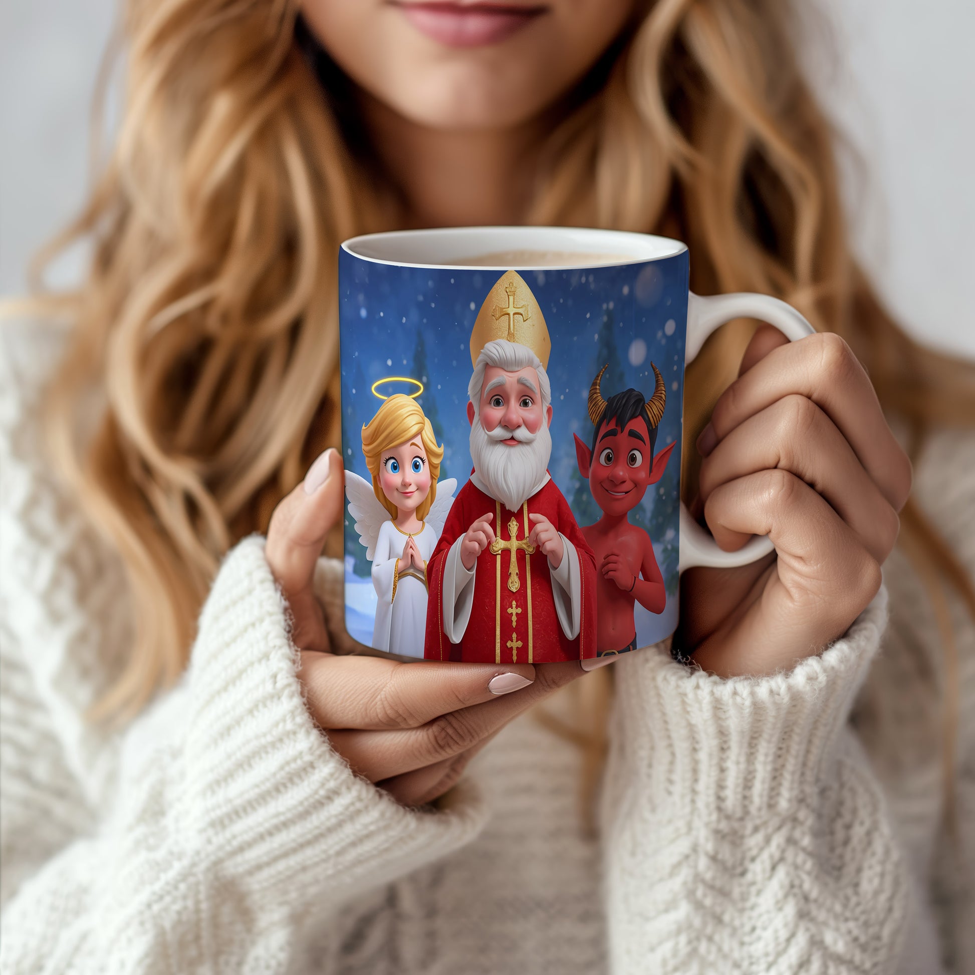 Veselý design s Mikulášem, čertem a andělem uprostřed zasněženého lesa. Atmosféra plná zimního kouzla. Hrnek 330ml – vhodný do myčky i mikrovlnky.