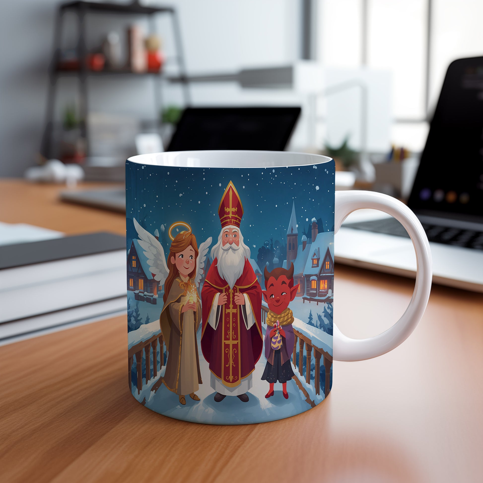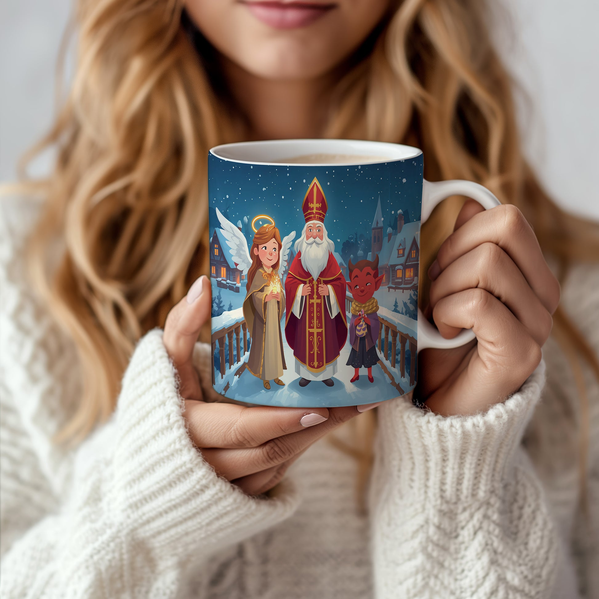Na hrnku se odehrává scéna na zasněženém mostě, kde Mikuláš, čert a anděl přinášejí radost a světlo. Sněhové vločky jemně padají, vytvářejíce pohádkovou atmosféru. Hrnek 330ml – vhodný do myčky i mikrovlnky.