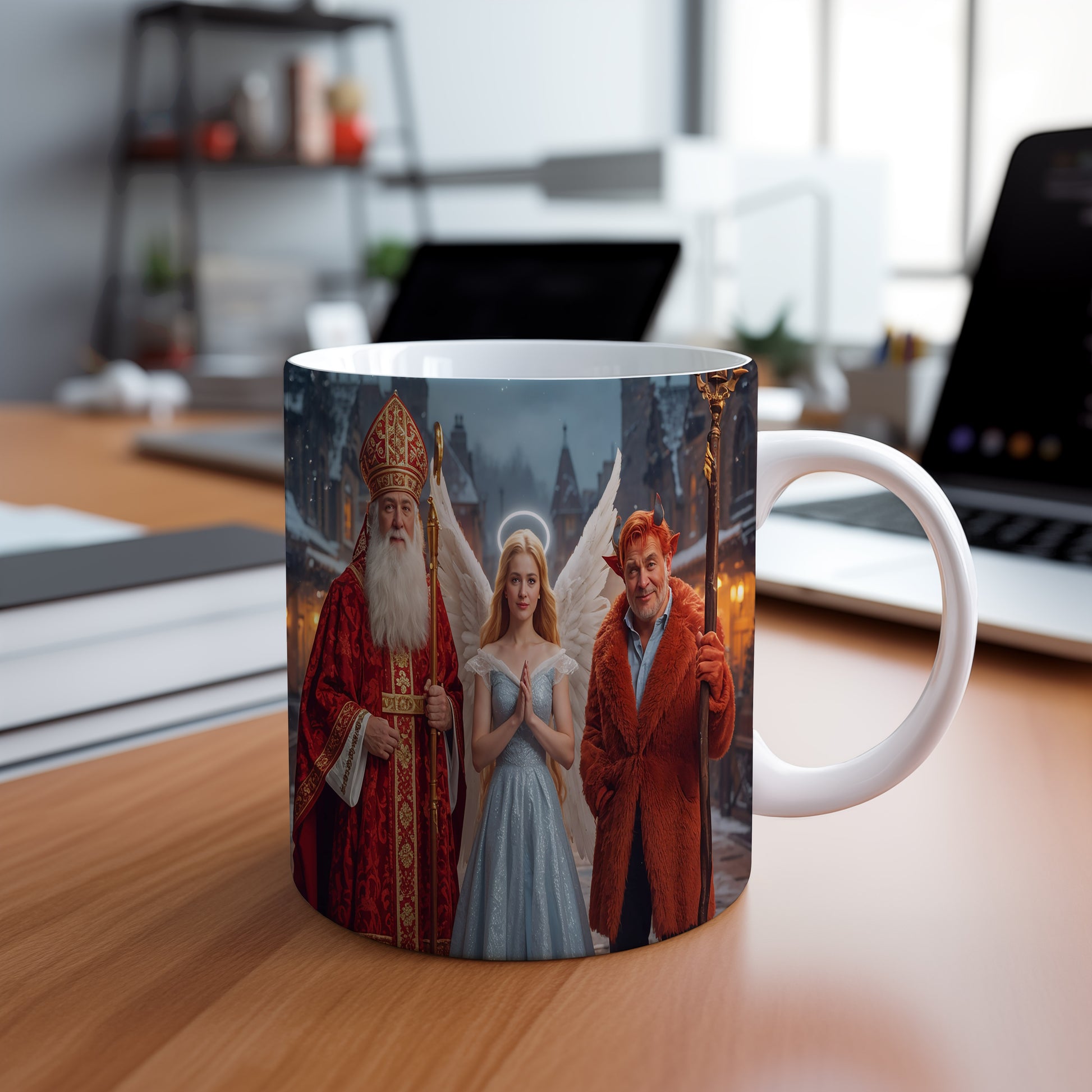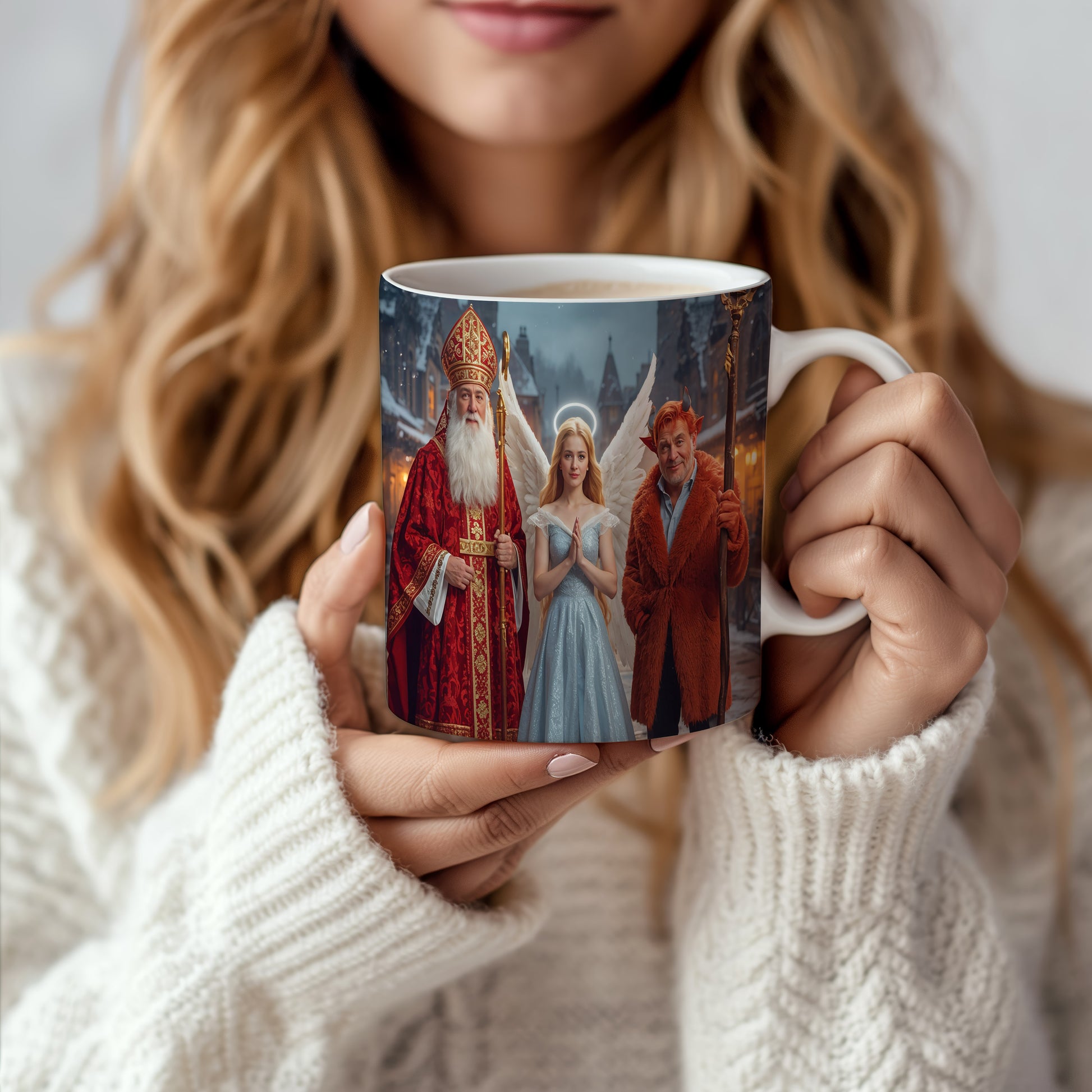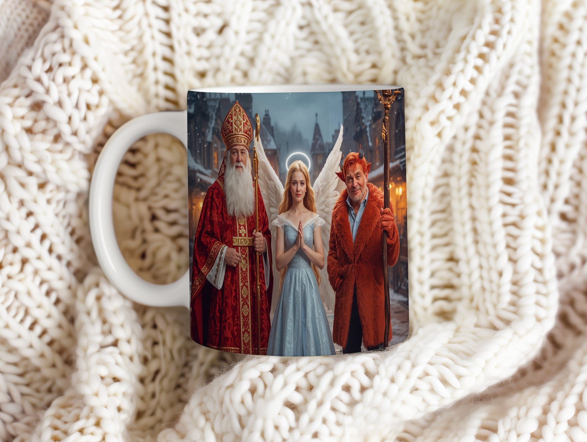 Hrnek s motivem Mikuláše, čerta a anděla – zimní kouzelný večer
