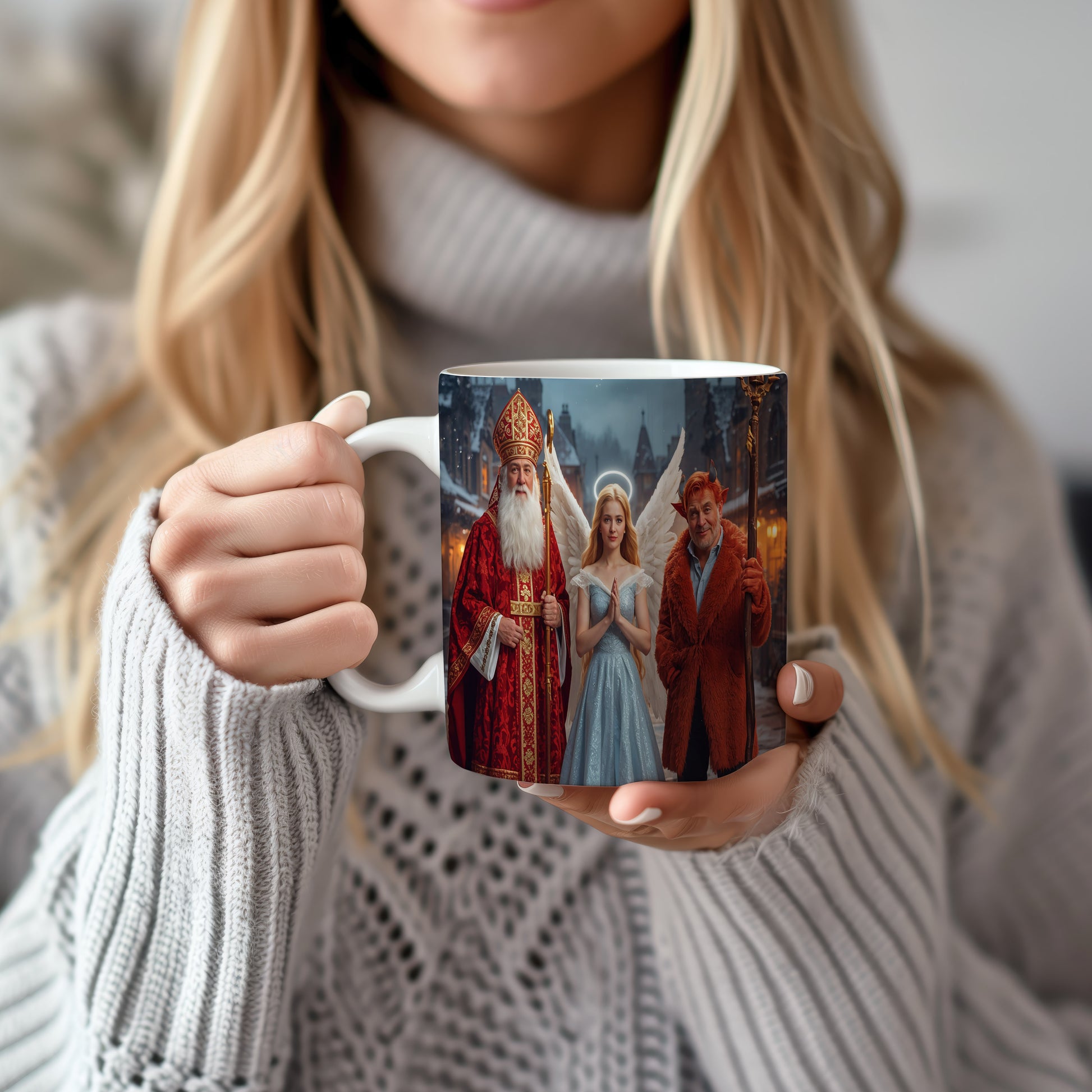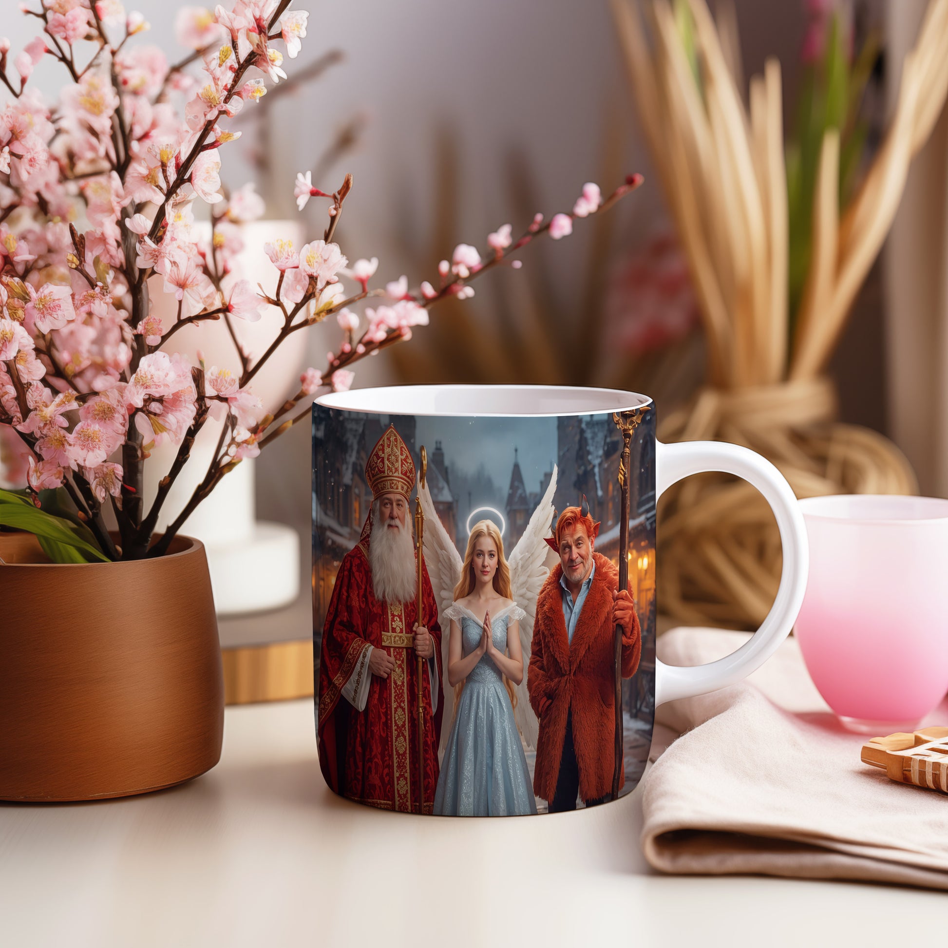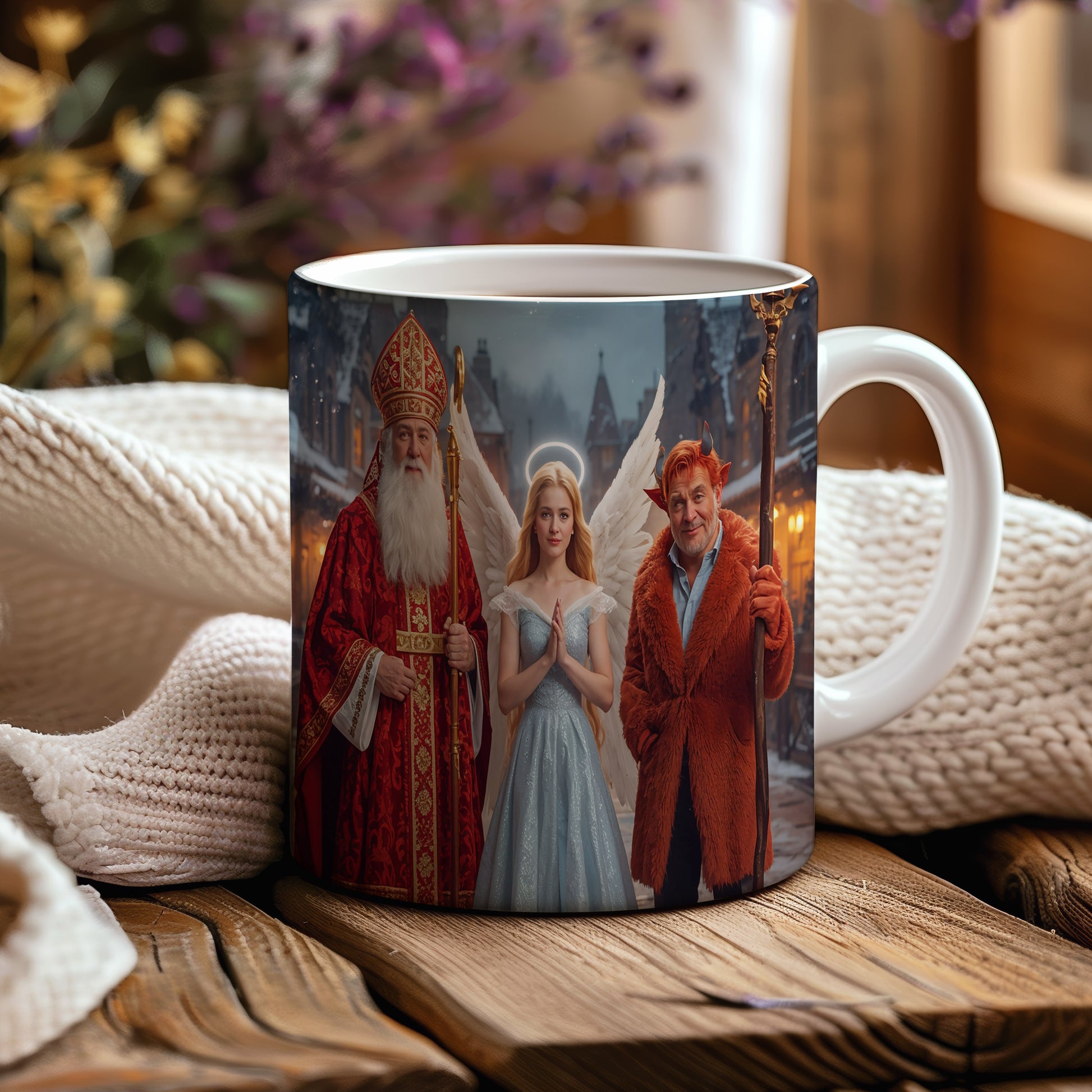 Hrnek s motivem Mikuláše, čerta a anděla – zimní kouzelný večer