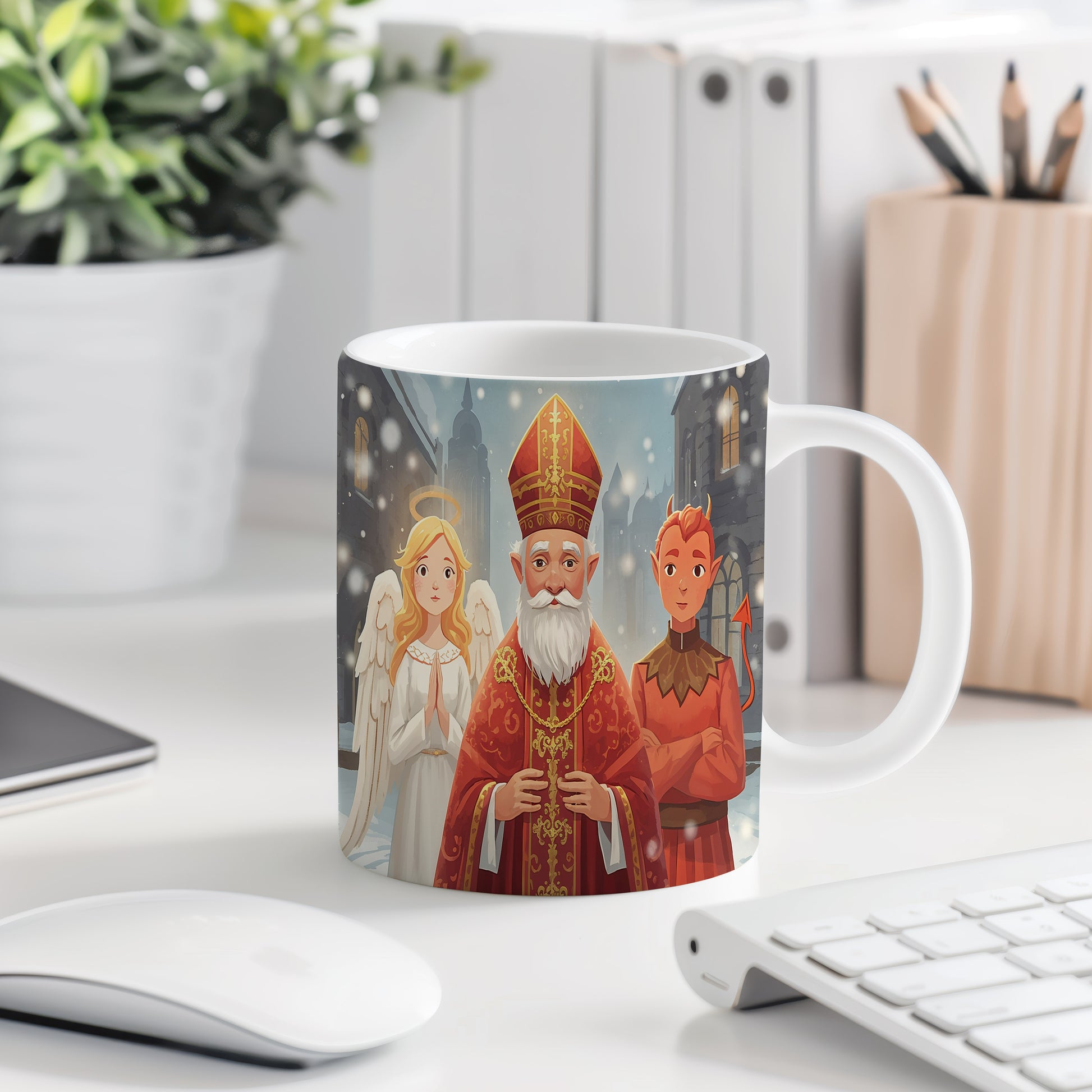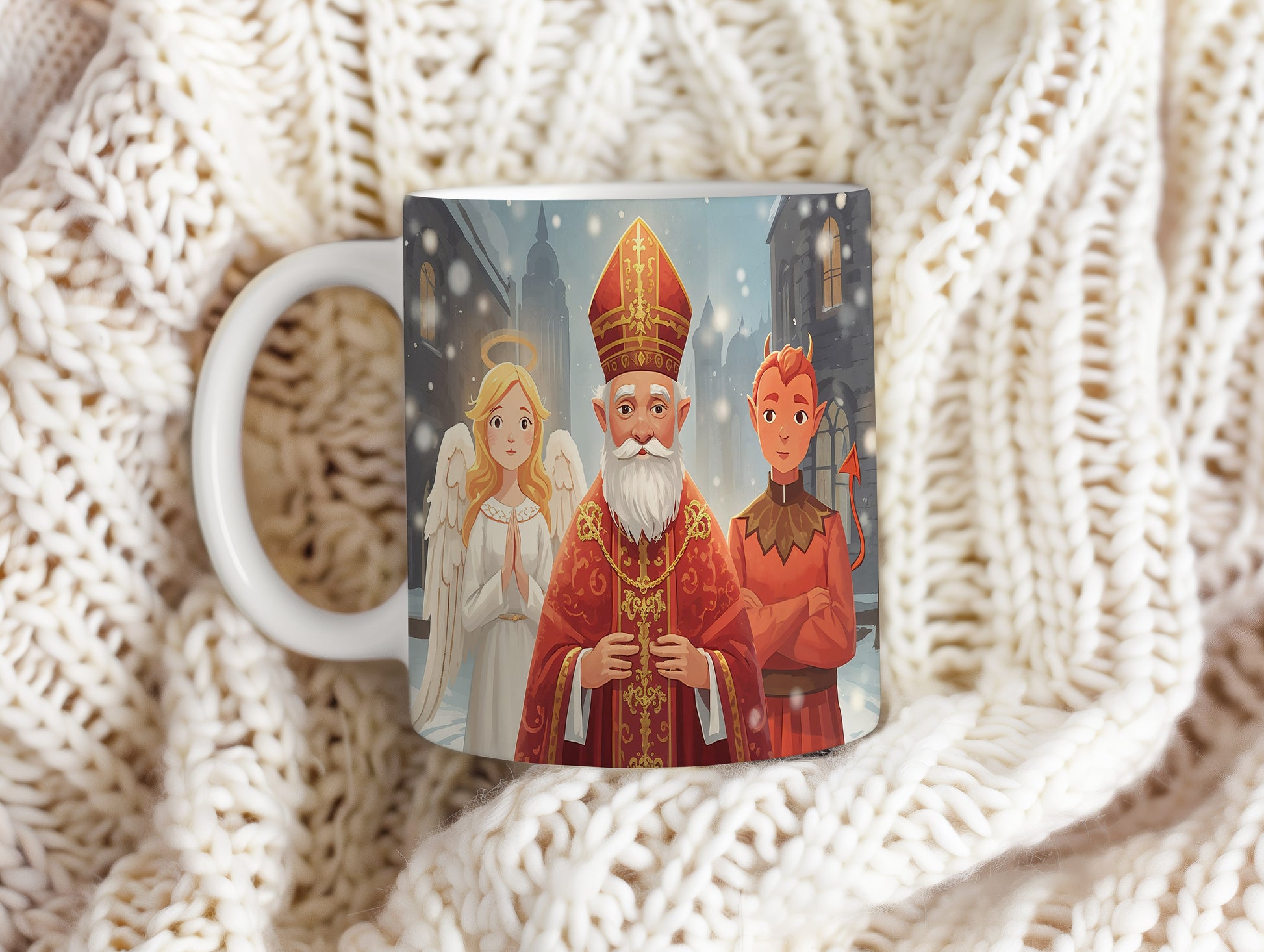 Hrnek s motivem Mikuláše, čerta a anděla – zimní město