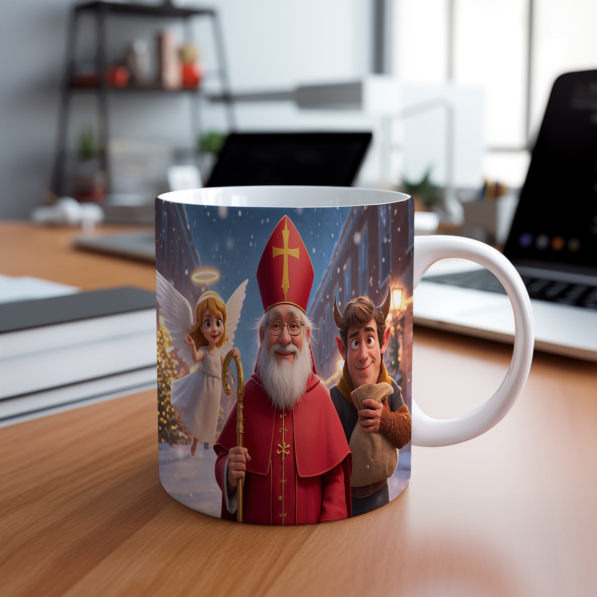 Hrnek s motivem Mikuláše, čerta a anděla – zimní městská pohádka